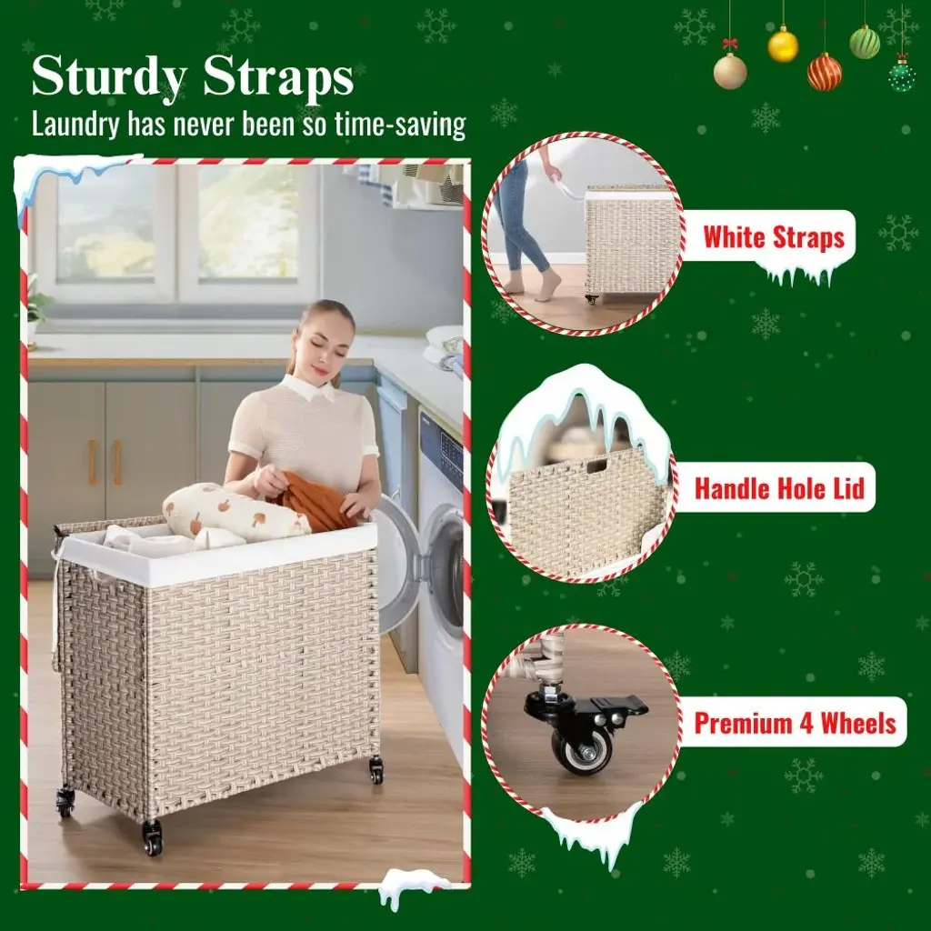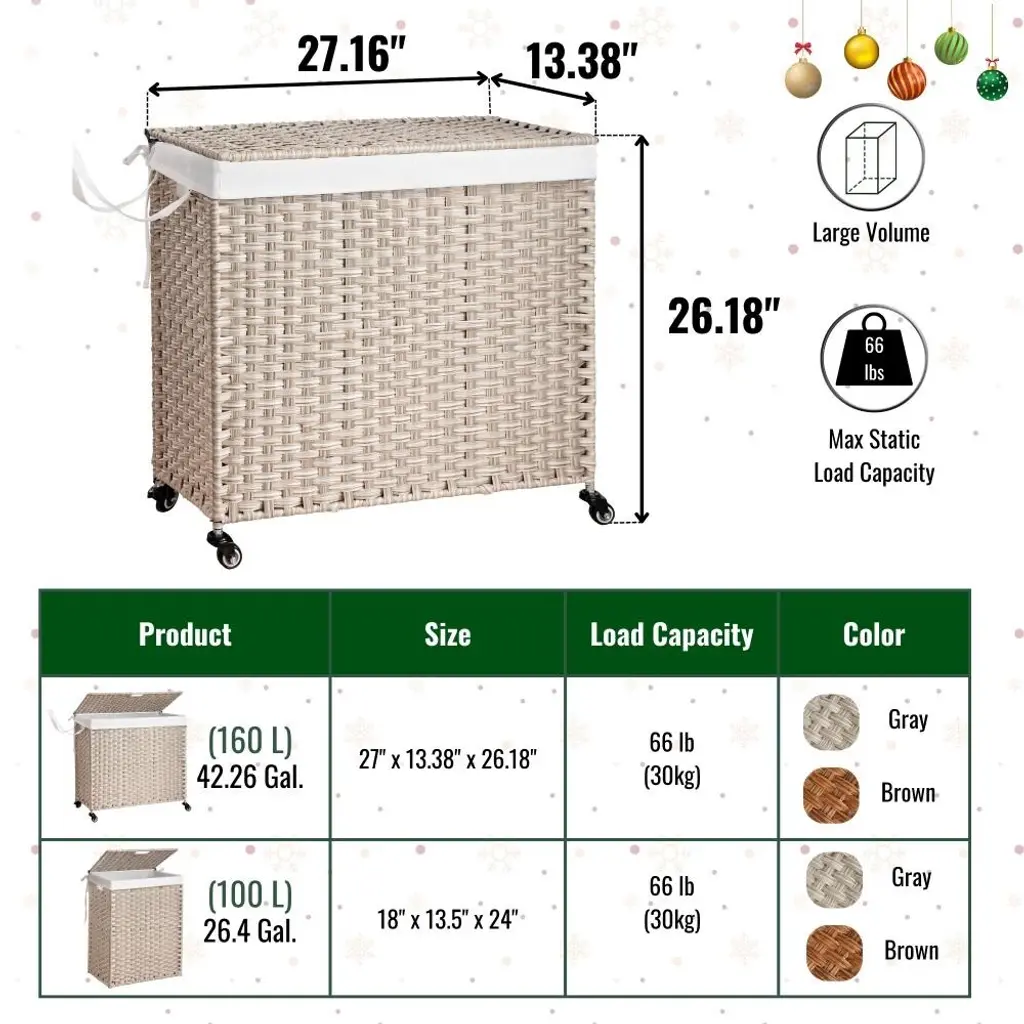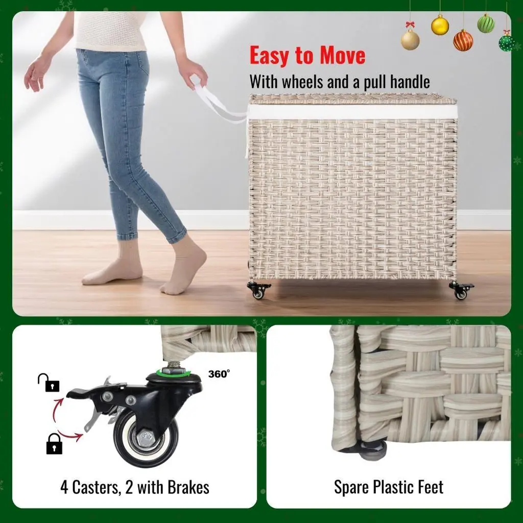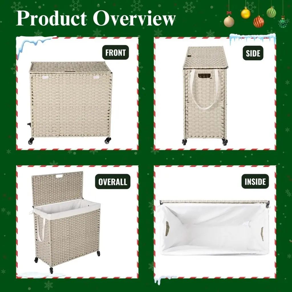 Your companion in every space in your family from the laundry area, bathroom or bedroom. More creatively, it can also be used as a multi-purpose storage box for household items such as children's toys, mattresses, pillows, blankets or swimming pool equipment.Features: ✅ SATISFIED IN EVERY DETAIL - With research and improvements, our clothes hamper is equipped with velcros on both sides of the clothes hamper to ensure the hamper bags do not fall when filled with clothes. Instead of using plastic wheels, our wicker laundry basket uses steel and rubber wheels that are friendly to your floors and more durable. ✅ PREMIUM MATERIAL - Laundry organizer is designed in knock-down form to save space when not in use. Made of eco-friendly plastic rattan wicker with unique natural-looking patterns, the durable powder-coated steel frame comes with two washable and removable laundry bags made from 200gsm soft canvas. There is a one-compartment bag and a two-compartment bag for easy classification of clothes. ✅ WHY NEED A LAUNDRY BASKET? - Optimizing usable space is always a top factor for small and medium sized homes, using storage baskets is the optimal choice to help the home space look tidy, neat and scientific. In particular, using a laundry basket also helps you easily classify white and colored clothes to save time when washing. ✅ WHAT WILL YOU GET? - A laundry basket set includes - 01 laundry basket with lid 27 inch length x 13.38 inch width x 26.18 inch height with loading capacity at 160 L ~ 42.26 ; 02 laundry bags with one compartment and two compartments; a set of 04 wheels; clear installation instructions.