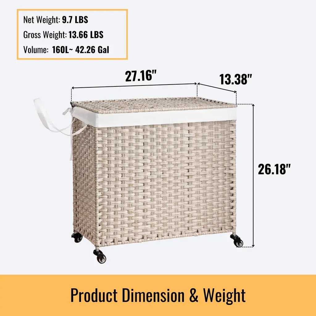 Laundry Hamper With Lid Rattan Basket With Removable Bags And Wheels - 160l - Light Gray