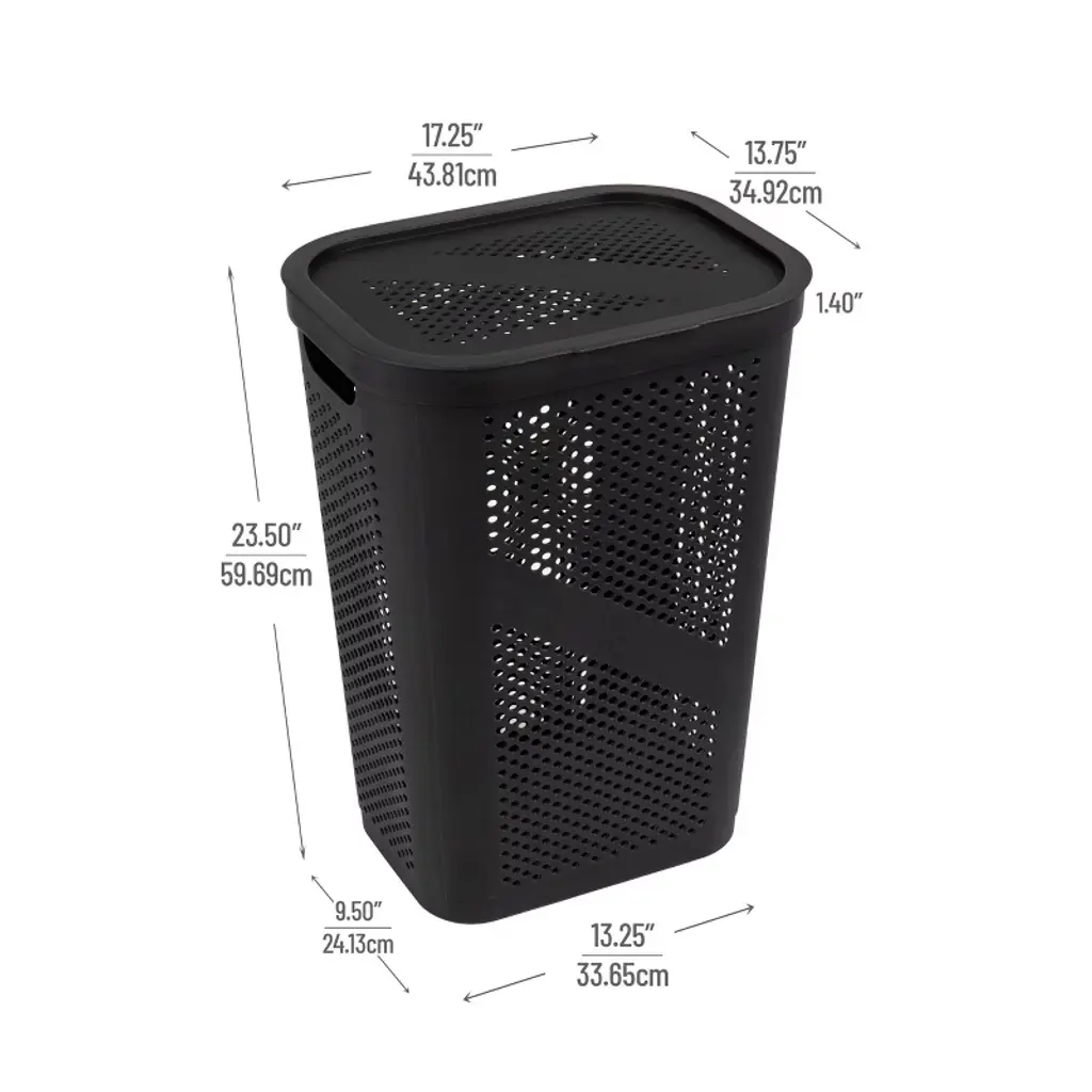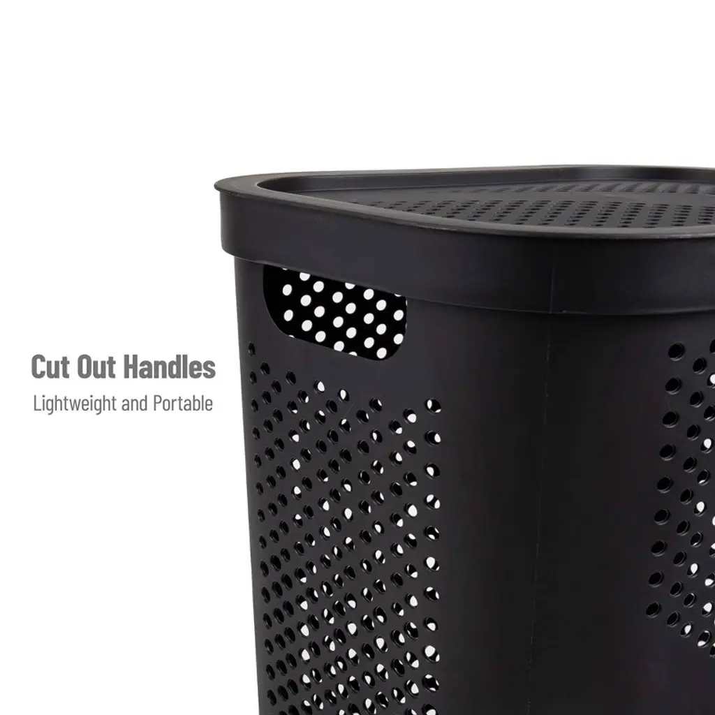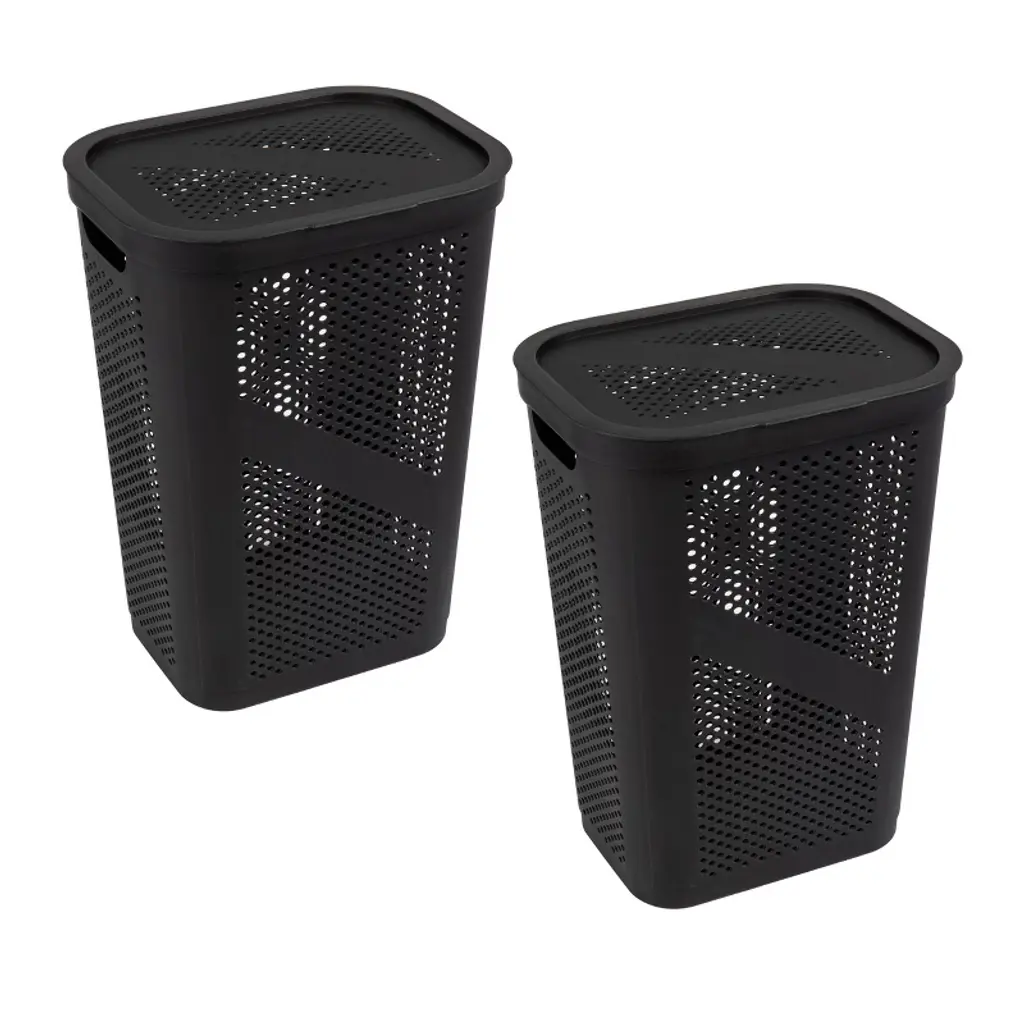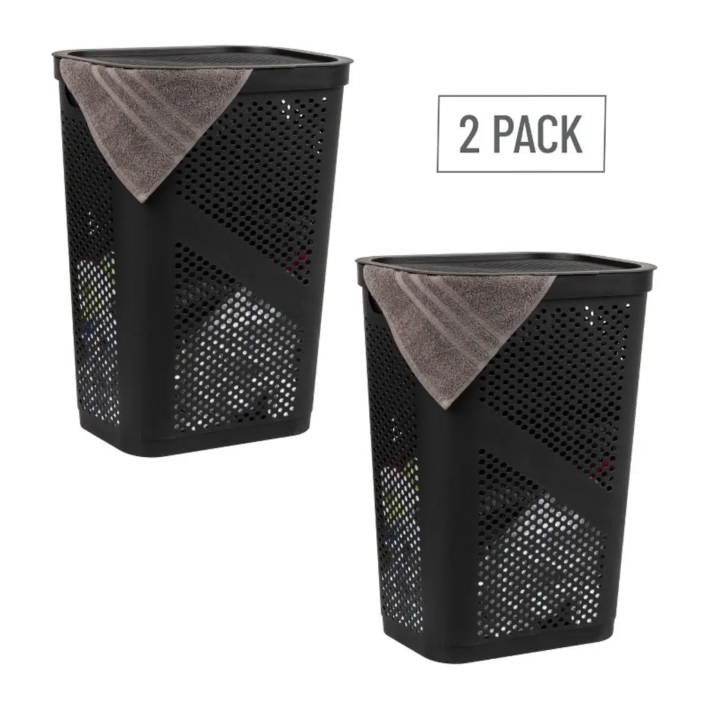 Maintain a cleaner, more organized home with this set of two 60L slim laundry hampers. These durable, ventilated hampers are ideal for storing laundry, towels, and household items like toys, sports gear, or linens. Their perforated design allows for airflow, helping to reduce odor buildup while the hinged lids keep dirty clothes hidden from view. Each hamper features integrated cut-out handles for easy carrying and fits seamlessly into compact areas like bathrooms, closets, or laundry rooms. The tapered shape maximizes storage potential while minimizing floor space. No tools or setup are needed—just snap the lids on and get organized.
