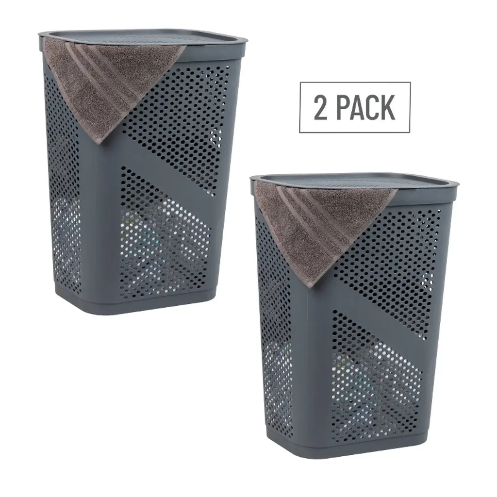 Maintain a cleaner, more organized home with this set of two 60L slim laundry hampers. These durable, ventilated hampers are ideal for storing laundry, towels, and household items like toys, sports gear, or linens. Their perforated design allows for airflow, helping to reduce odor buildup while the hinged lids keep dirty clothes hidden from view. Each hamper features integrated cut-out handles for easy carrying and fits seamlessly into compact areas like bathrooms, closets, or laundry rooms. The tapered shape maximizes storage potential while minimizing floor space. No tools or setup are needed—just snap the lids on and get organized.