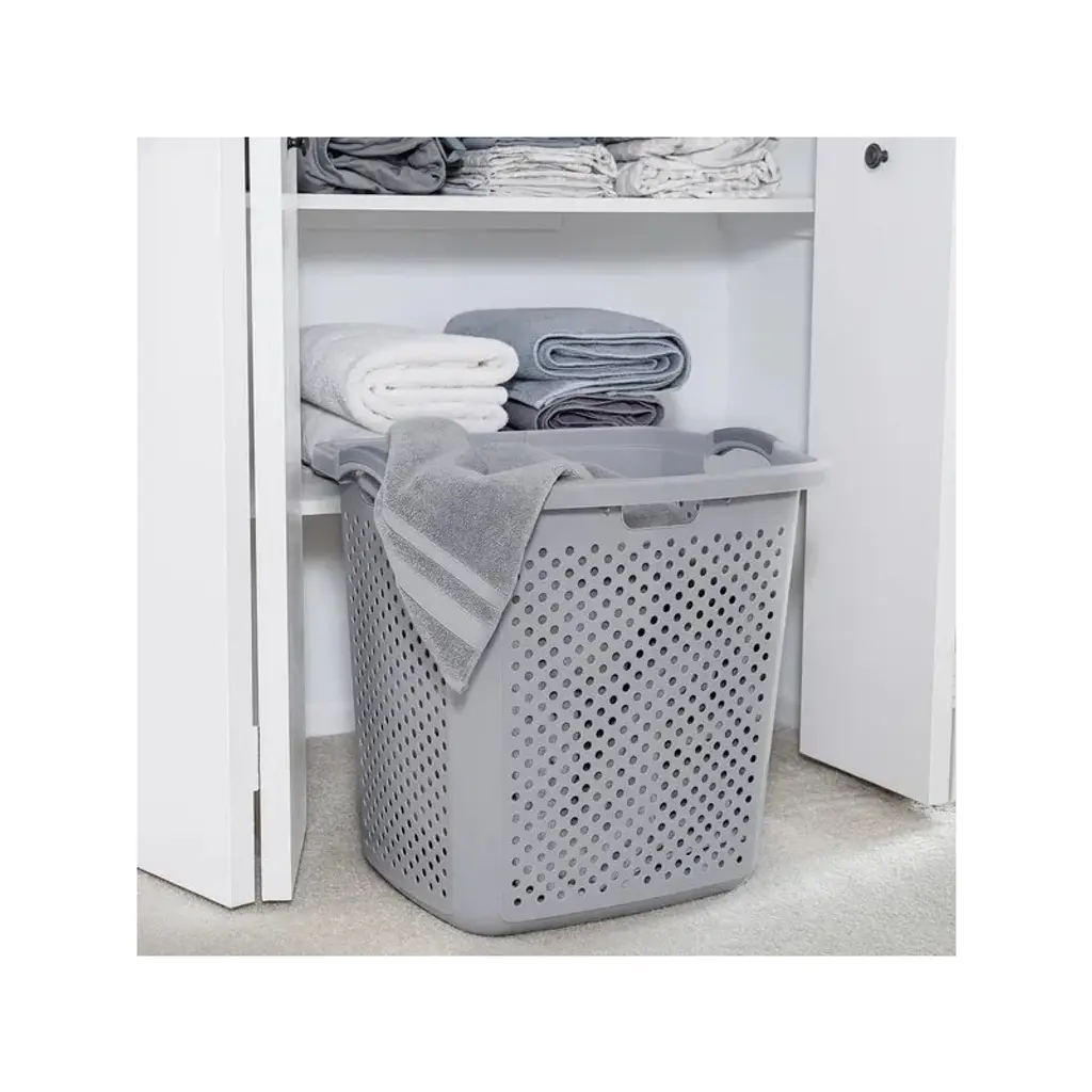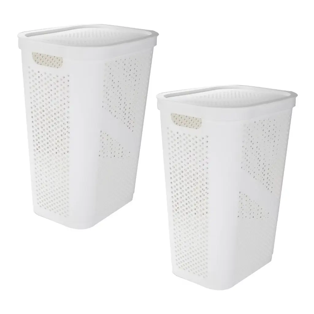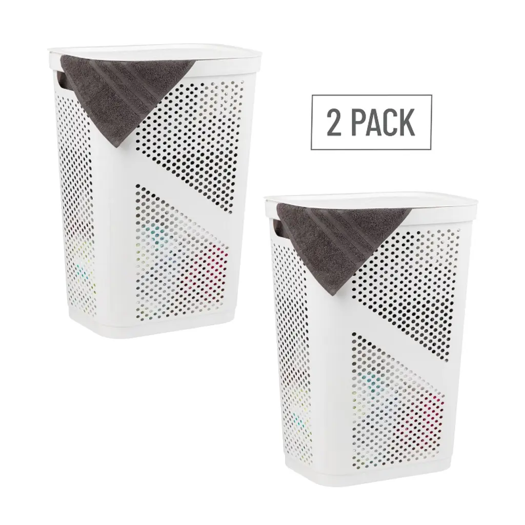 Maintain a cleaner, more organized home with this set of two 60L slim laundry hampers. These durable, ventilated hampers are ideal for storing laundry, towels, and household items like toys, sports gear, or linens. Their perforated design allows for airflow, helping to reduce odor buildup while the hinged lids keep dirty clothes hidden from view. Each hamper features integrated cut-out handles for easy carrying and fits seamlessly into compact areas like bathrooms, closets, or laundry rooms. The tapered shape maximizes storage potential while minimizing floor space. No tools or setup are needed—just snap the lids on and get organized.