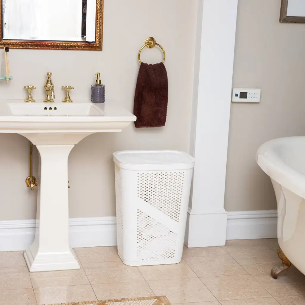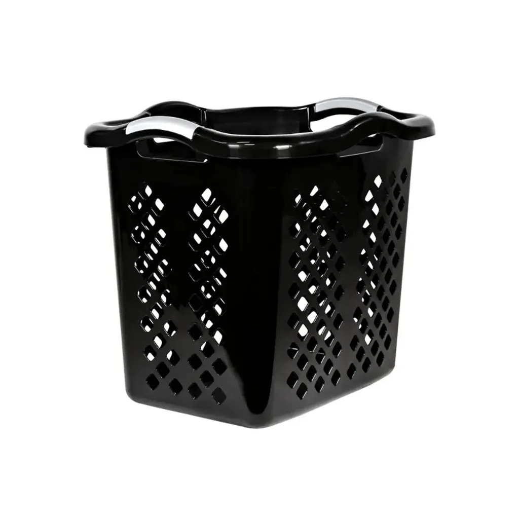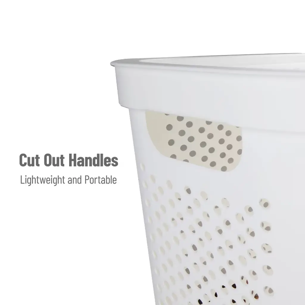 Maintain a cleaner, more organized home with this set of two 60L slim laundry hampers. These durable, ventilated hampers are ideal for storing laundry, towels, and household items like toys, sports gear, or linens. Their perforated design allows for airflow, helping to reduce odor buildup while the hinged lids keep dirty clothes hidden from view. Each hamper features integrated cut-out handles for easy carrying and fits seamlessly into compact areas like bathrooms, closets, or laundry rooms. The tapered shape maximizes storage potential while minimizing floor space. No tools or setup are needed—just snap the lids on and get organized.