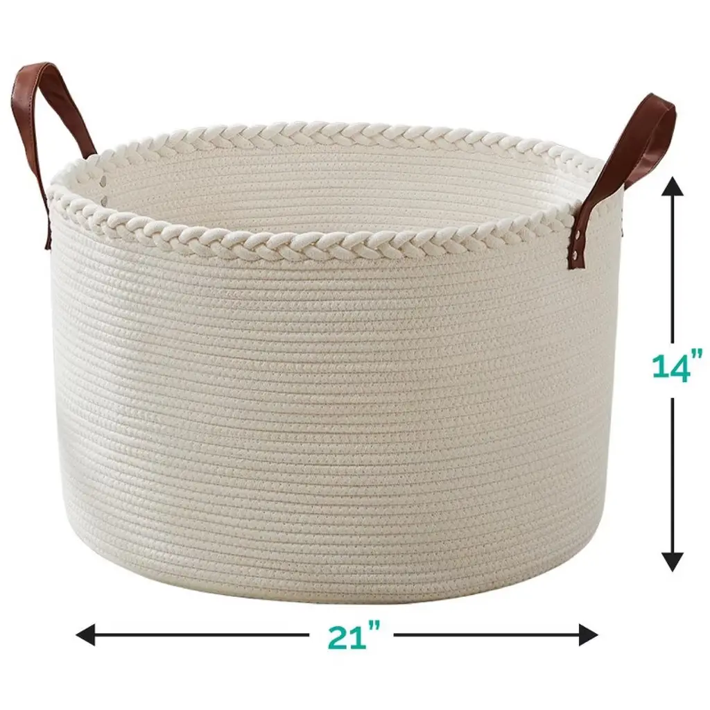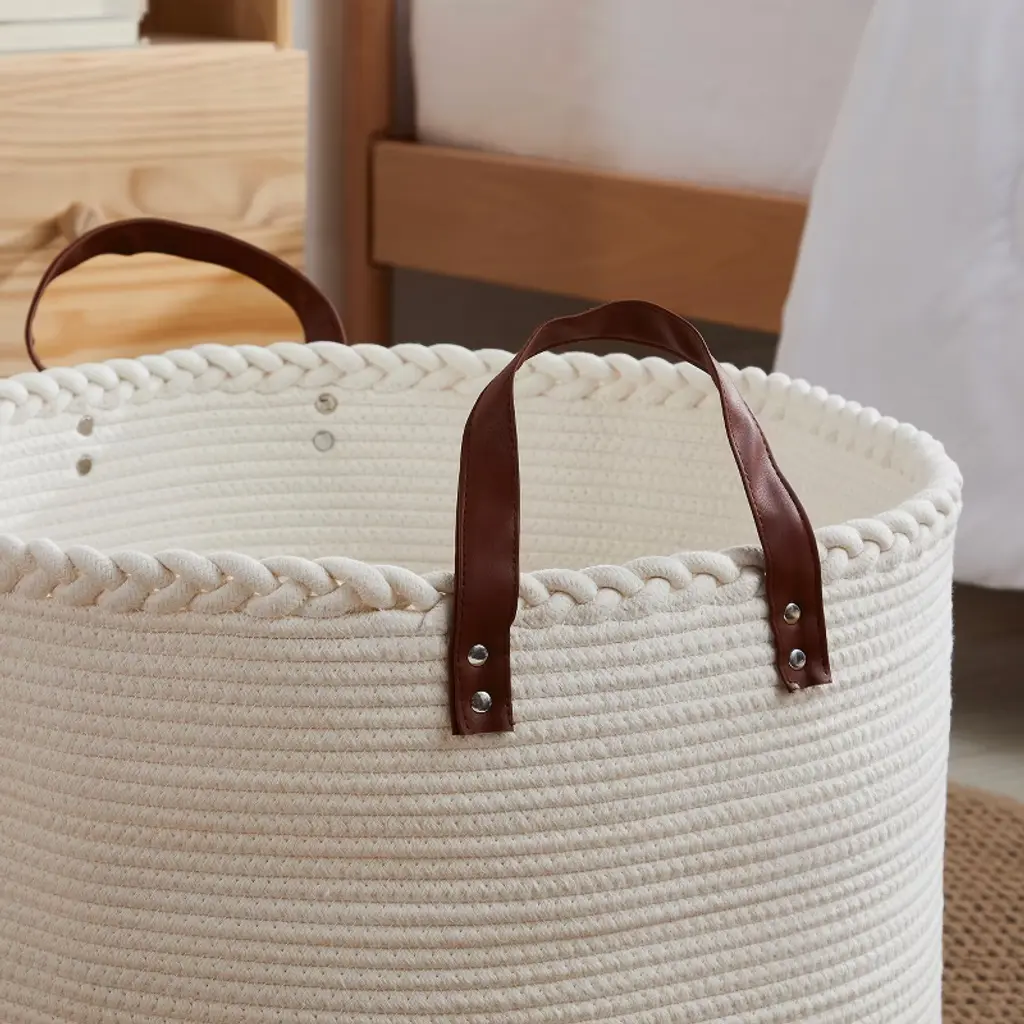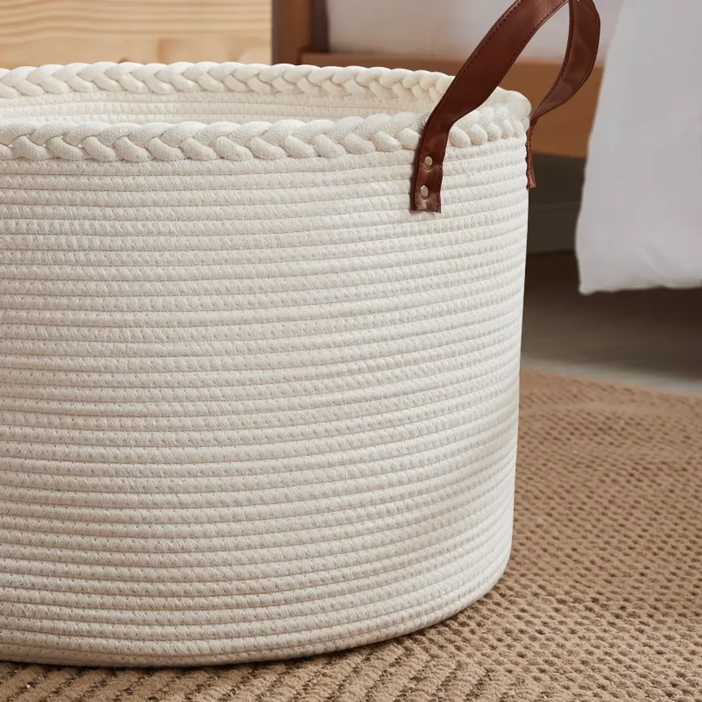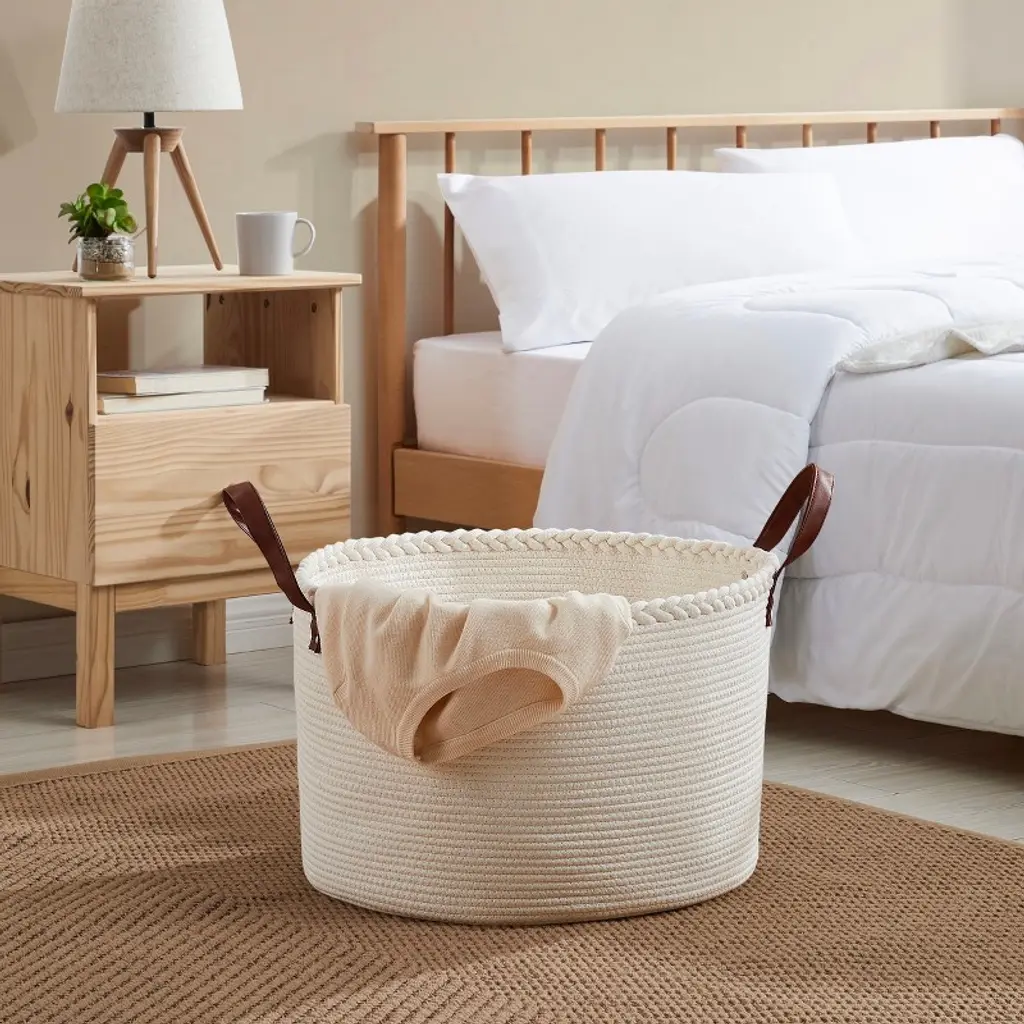 Ornavo Home Large Round Cotton Rope Storage Basket Laundry Hamper With Faux Leather Handles - Cream