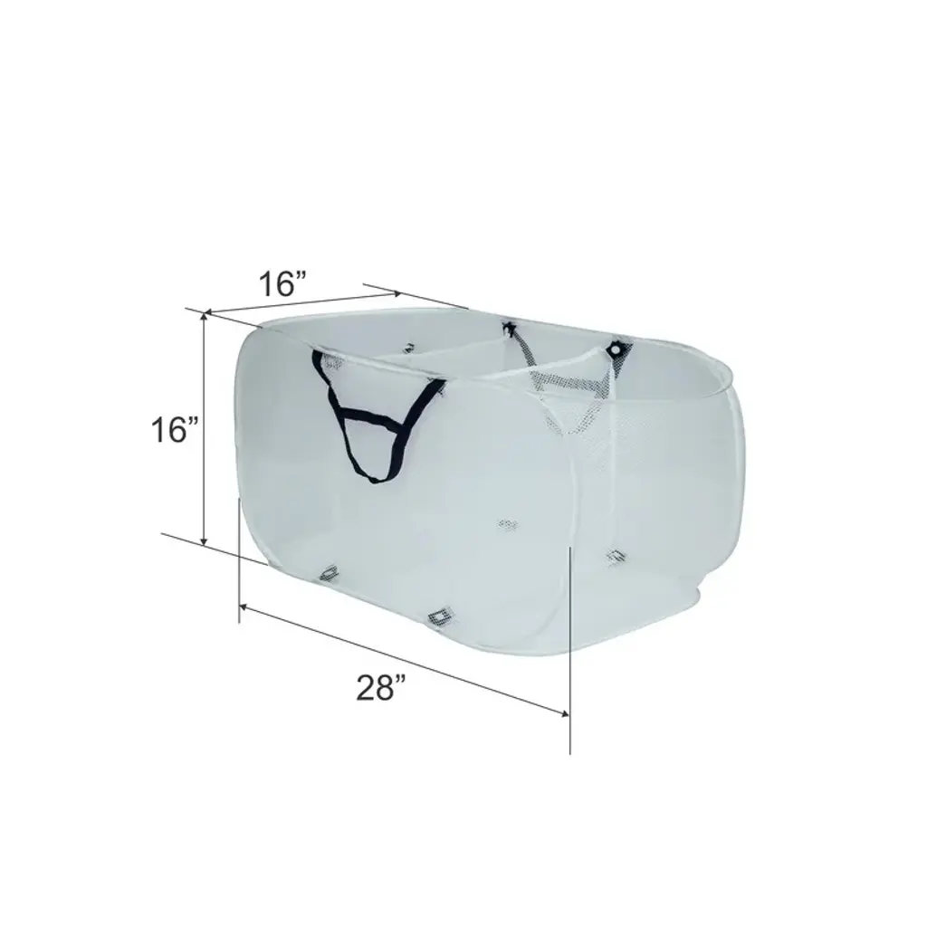 The Pop-Up Mesh Triple Sorter offers a convenient way to organize your laundry with its three separate compartments, making sorting before and after washing effortless. Crafted from breathable polyester mesh, it features two heavy-duty carrying straps for easy transport. This versatile hamper is ideal for kids and adult clothing, towels, toys, and more. When not in use, it folds flat for compact and efficient storage. Caution: This item is under spring pressure; handle with care when opening, and keep it away from children and your face.