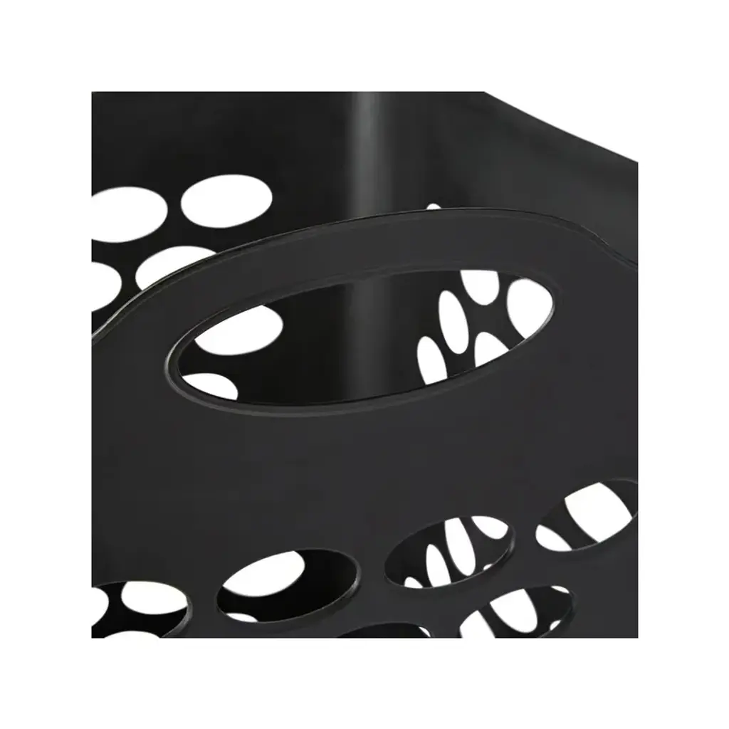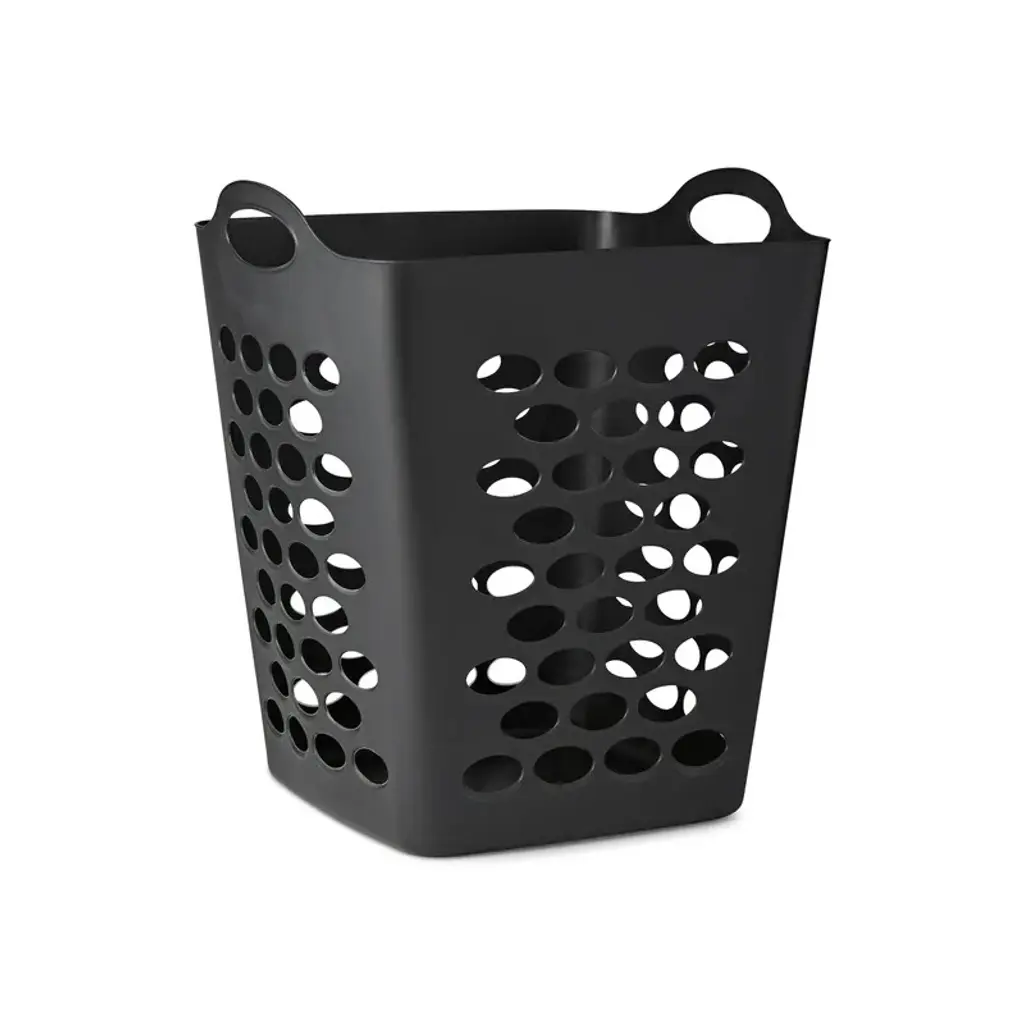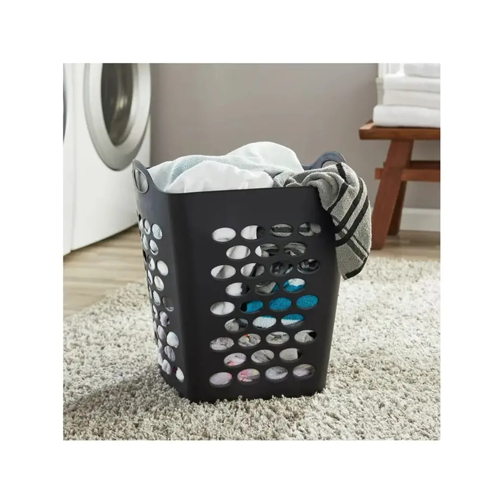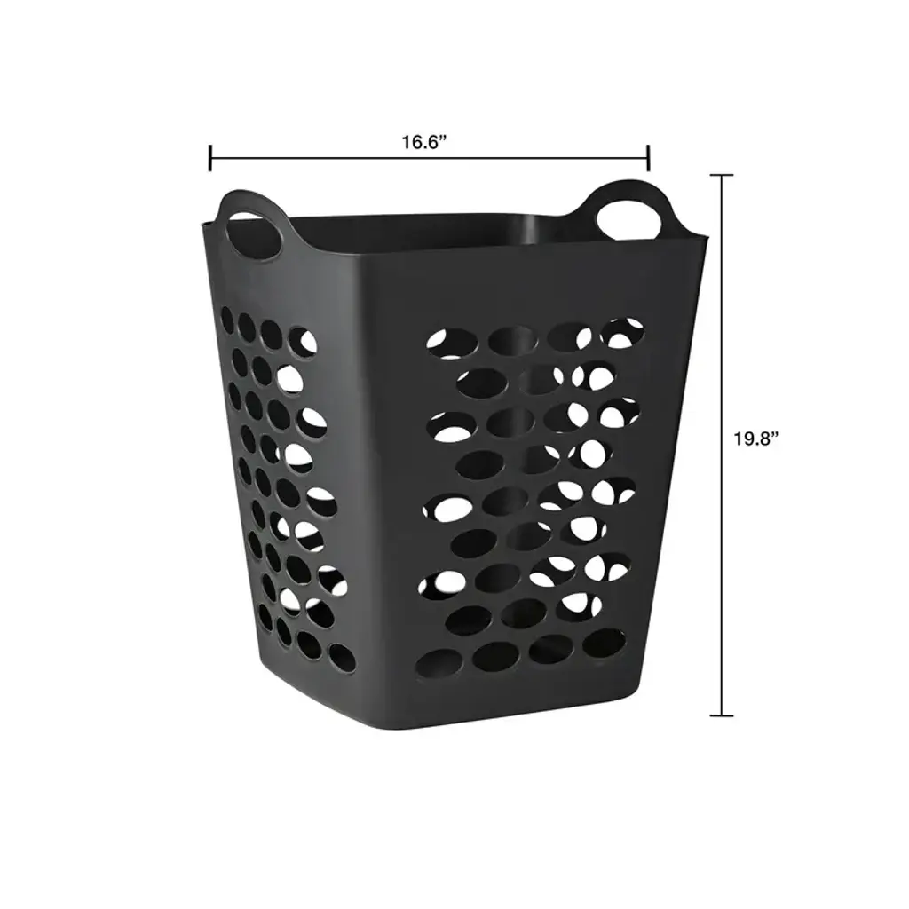 The Flexible Black Laundry Hamper offers practical storage for busy households, holding up to 2 bushels of clothing in a space-saving square design. This durable plastic hamper features a geometric pattern of ventilation holes that allows garments to breathe, helping prevent musty odors and mildew. With sturdy dual handles, transporting laundry from bedrooms to the washing machine becomes effortless, even with heavier loads. The lightweight yet robust construction makes this hamper perfect for adults and teens alike, while its sleek black finish looks neat in any bathroom, bedroom, or closet. The Flexible Black Laundry Hamper combines functionality with style, keeping clothes organized until laundry day.