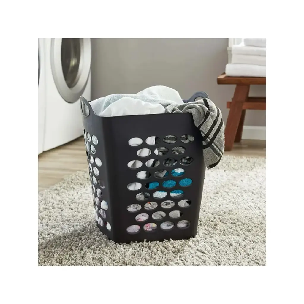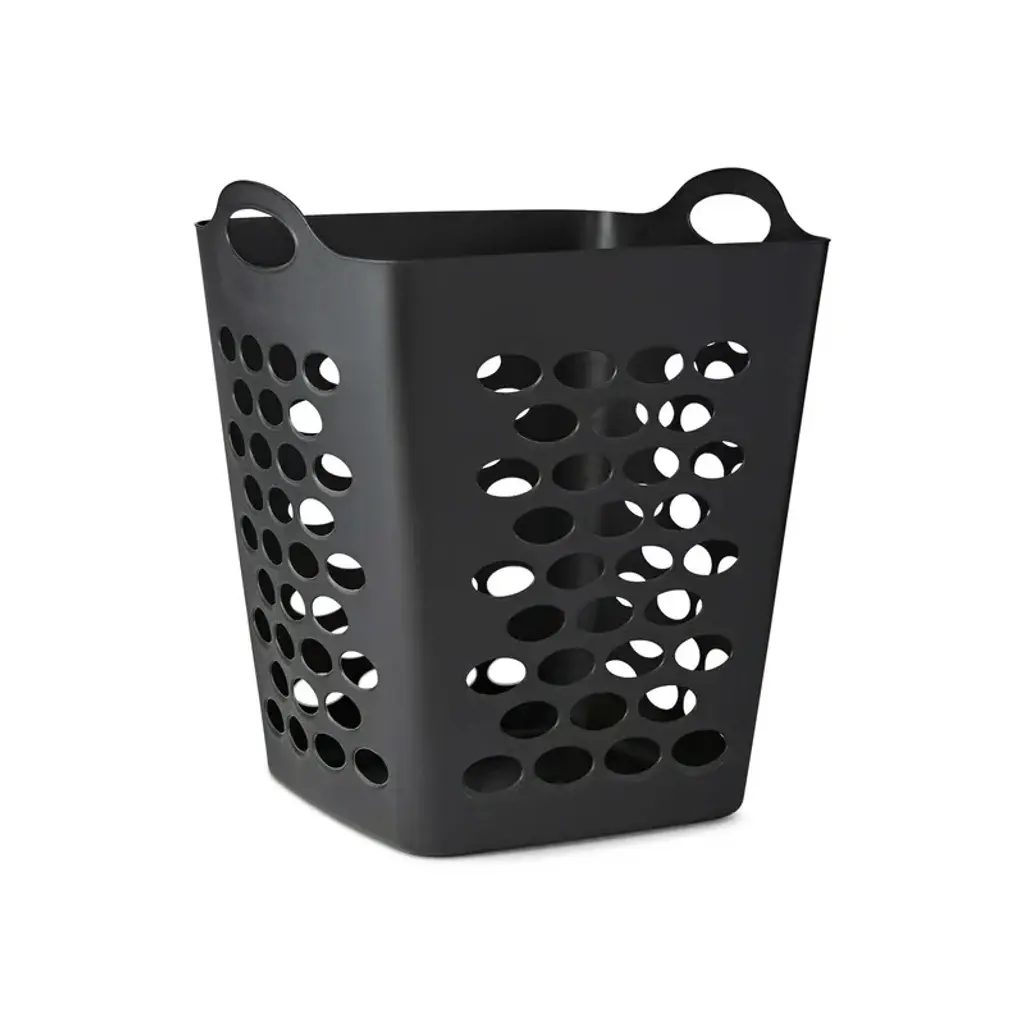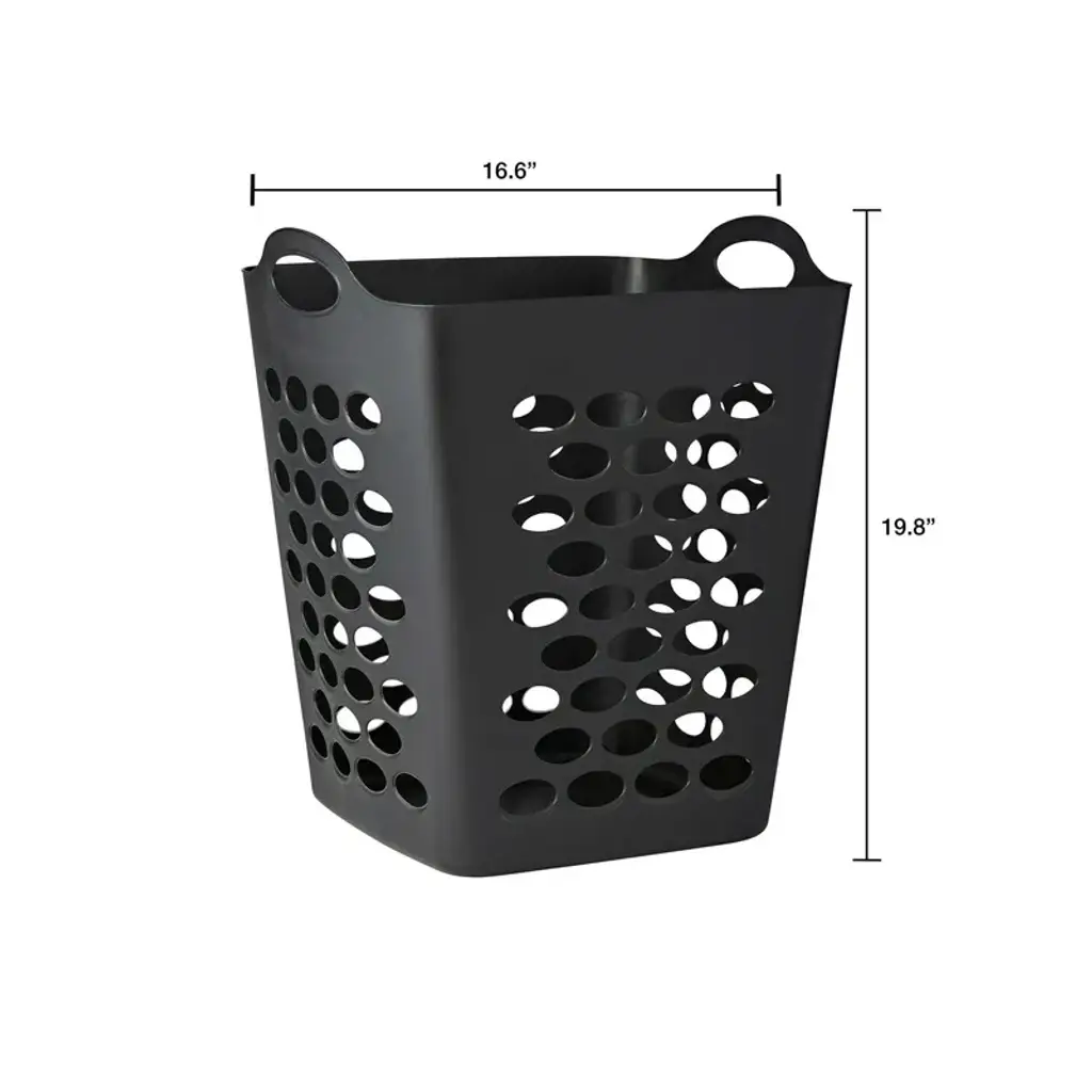 Flexible Black Laundry Hamper offers practical storage for busy households, holding up to 2 bushels of clothing in a space-saving square design. This durable plastic hamper features a geometric pattern of ventilation holes that allows garments to breathe, helping prevent musty odors and mildew. With sturdy dual handles, transporting laundry from bedrooms to the washing machine becomes effortless, even with heavier loads. The lightweight yet robust construction makes this hamper perfect for adults and teens alike, while its sleek black finish looks neat in any bathroom, bedroom, or closet. Flexible Black Laundry Hamper combines functionality with style, keeping clothes organized until laundry day.