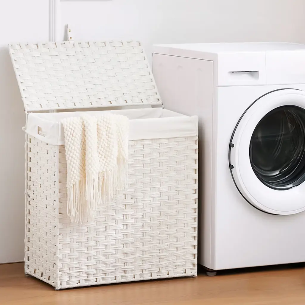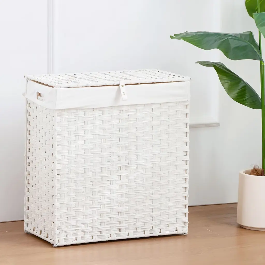 Tired of messy dirty clothes? This plastic laundry hamper with faux - rattan design is your solution. Crafted from high - quality, eco - friendly plastic, it mimics natural rattan texture, being waterproof, durable & easy to clean. The lid hides dust & odors. With a large capacity, it fits family laundry. Optional removable liner enables sorting. Its Nordic - style white look blends into any home decor, whether in bedroom, bathroom or by the washer. Elevate your storage game!