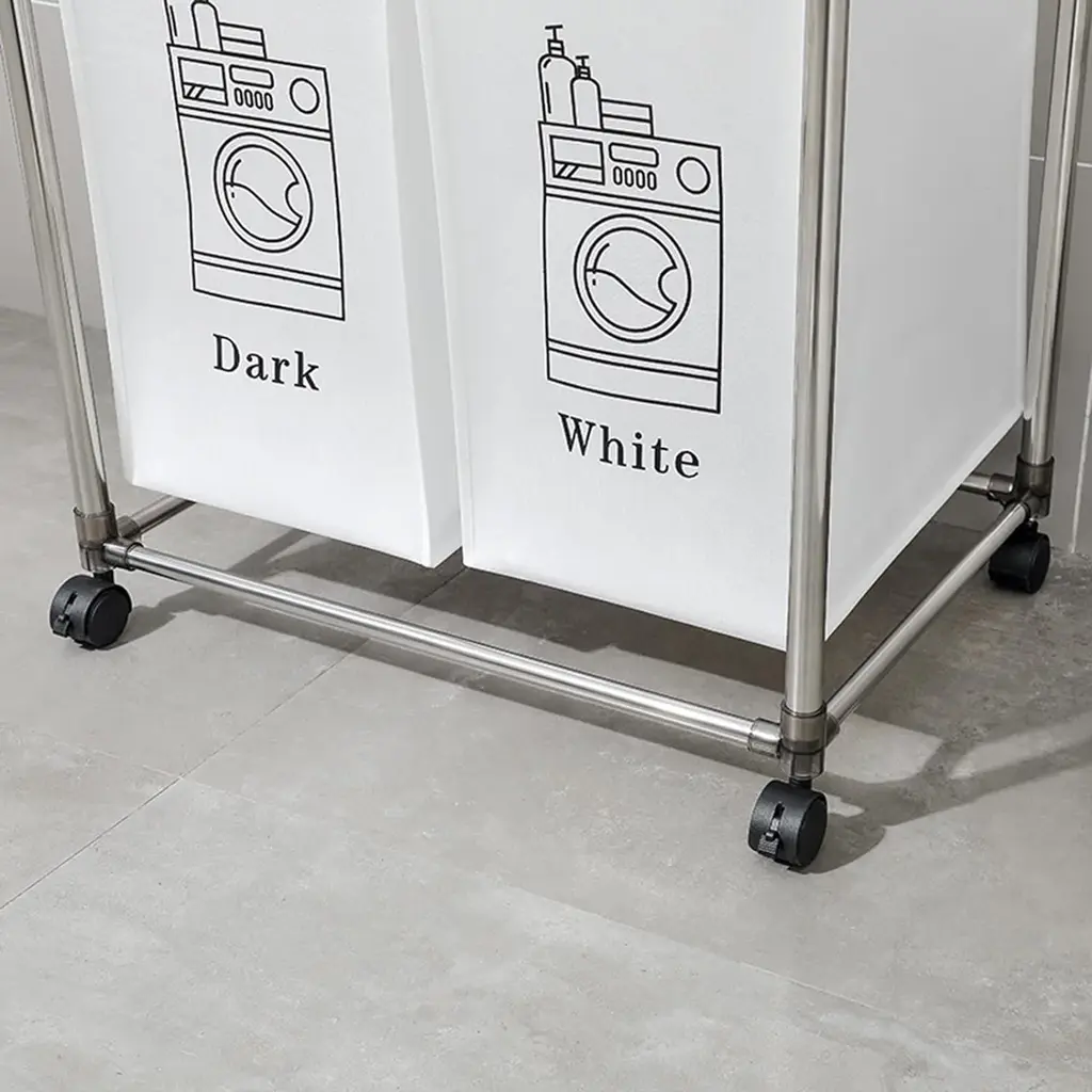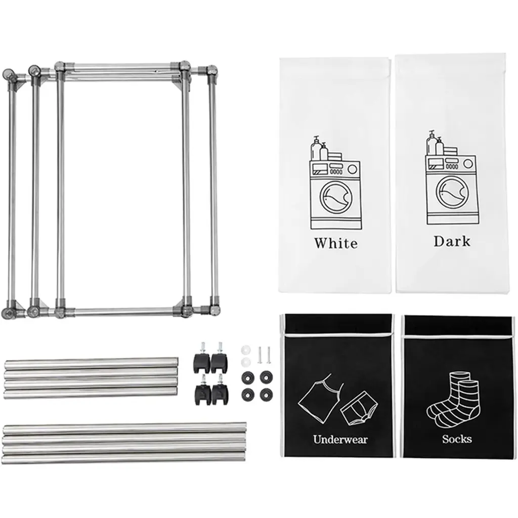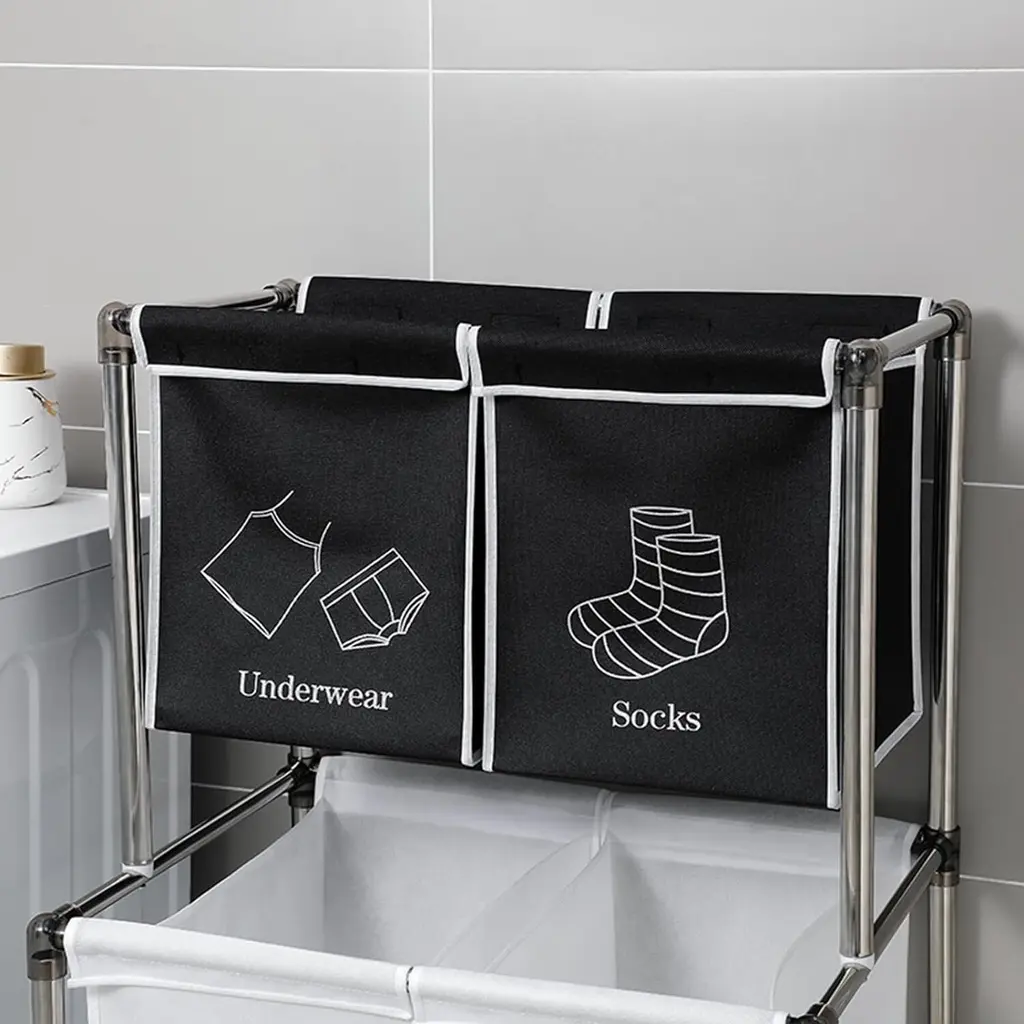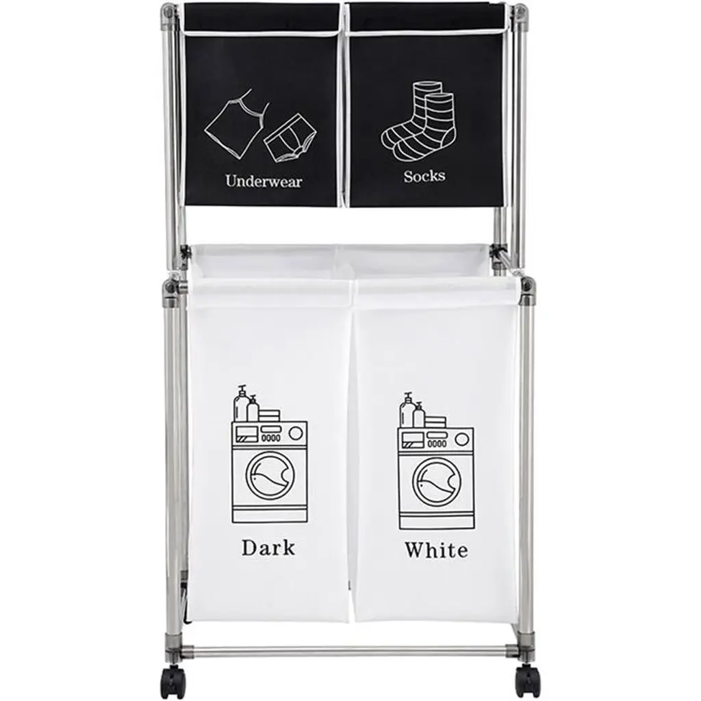 4 REMOVABLE LAUNDRY BAGS: The laundry basket includes 4 removable laundry bags, each of which can be individually removed or installed. You can differentiate between your socks, underwear, and dark and light clothing to prevent them from getting stained.WEAR-RESISTANT & WATERPROOF: Home laundry sorting baskets are lined with 6DD high-quality Oxford fabric, which is wear-resistant and easy to clean. The sturdy stickers securely lock the edges of the bag, so you don't have to worry about it falling off even when it's full.STURDY FRAME: The clothing sorter adopts a double-layer design, which is stronger than a single-layer structure. The overall frame is made of duralumin to enhance the hardness, and the anti-slip design on the bottom provides the final guarantee for stability.LARGE CAPACITY STORAGE - Clothes sorter storage space is 38''H x 22''L x 16''W. The large-capacity 2-tier laundry basket can even accommodate a whole family's worth of laundry.EASY TO ASSEMBLE: The rolling laundry basket comes with detailed assembly instructions and can be quickly assembled in just 10 minutes. It can be disassembled and stored when not in use to save space.Description:Name: Laundry HamperMain Material: FabricColor: Black and WhiteProduct Dimensions: 22.00x 16.50x 34.60inProduct Weight: 4.60lbs.Number of packages:1Package Size: 22.44x 16.93x 4.33inPackage Weight: 6.20lbs.Packing list:1xLaundry Hamper