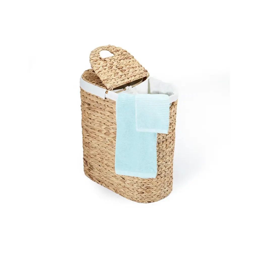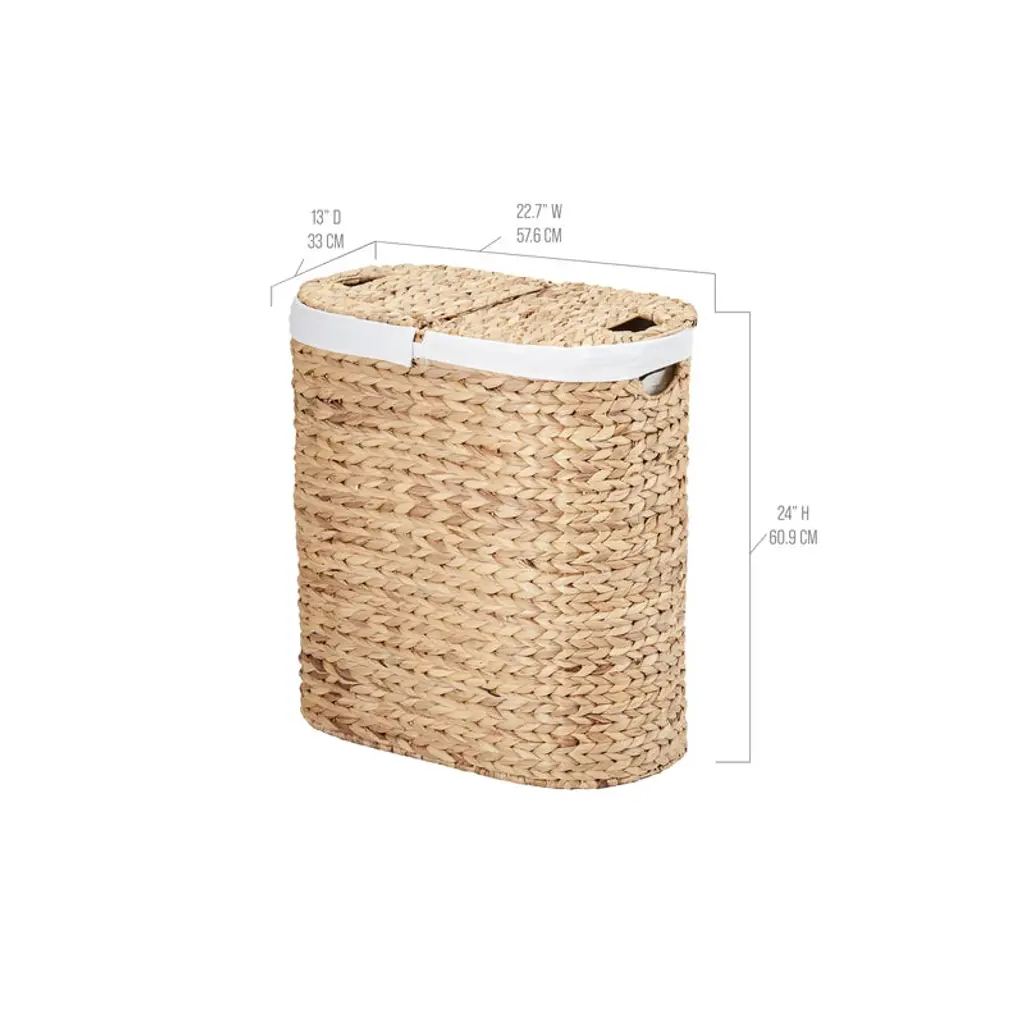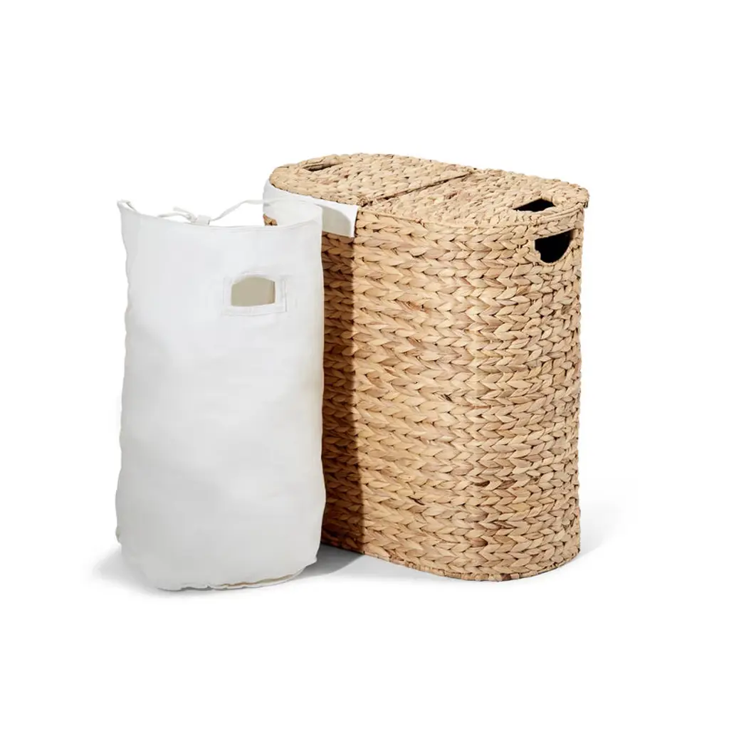 Seville Classics Handwoven Lidded Oval Double Laundry Hamper is a stylish and practical way to store laundry. The handwoven oval lidded hamper includes two removable bag liners (100% polyester). Made from woven water hyacinth wicker wrapped around a study steel frame. Uniquely handwoven by local artisans, so there may be slight variations in size and imperfections. The oval hamper features two thick, removable, and machine washable 100% Polyester canvas liner, making it easy to transport your laundry. The hamper features two cut-out handles for easy carrying.
