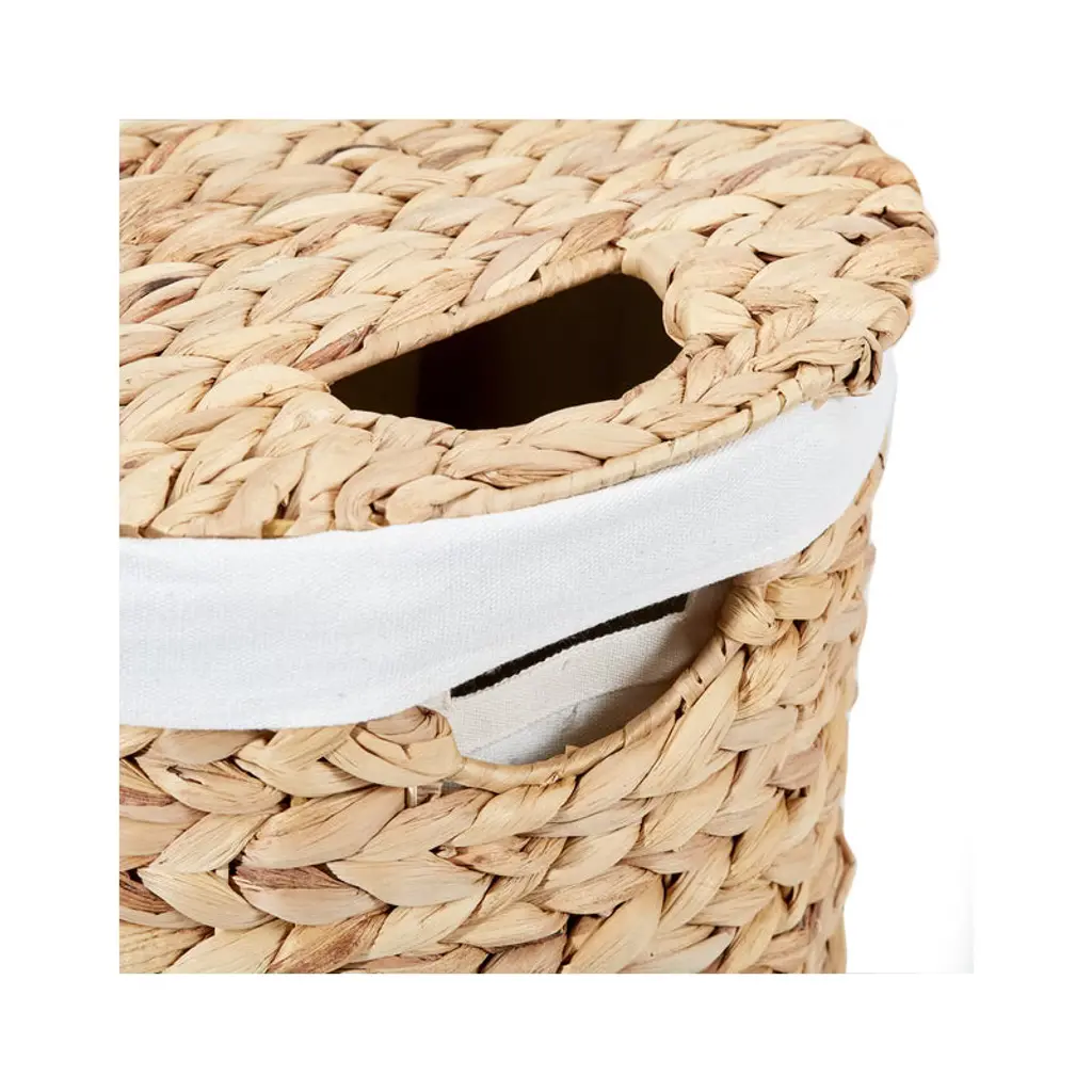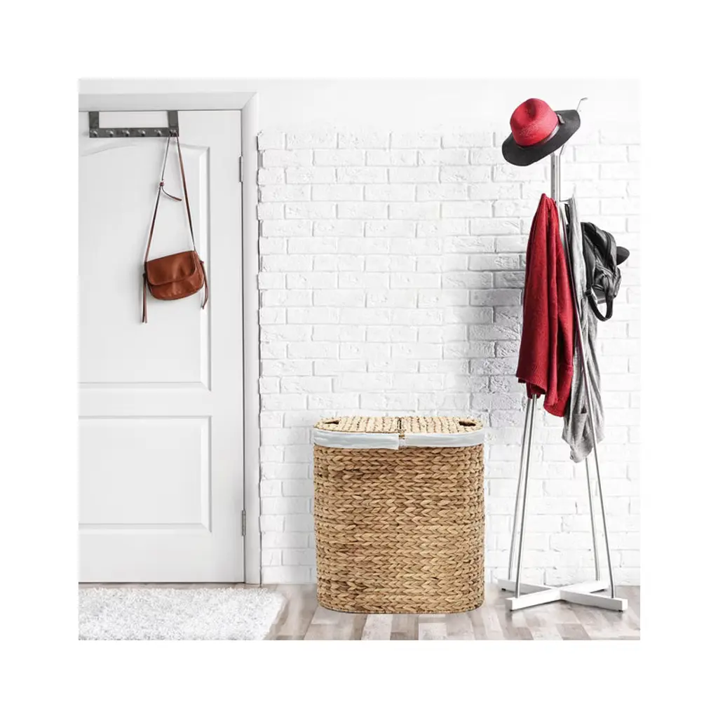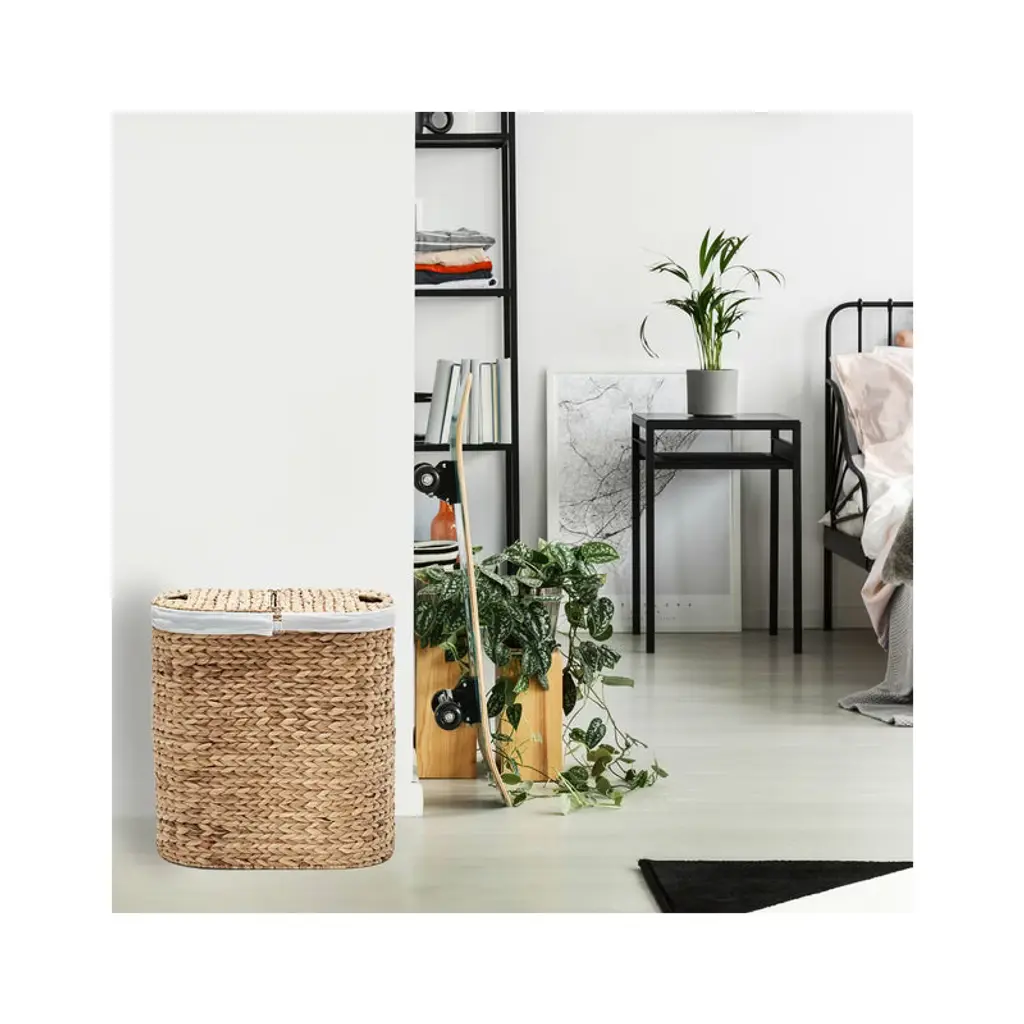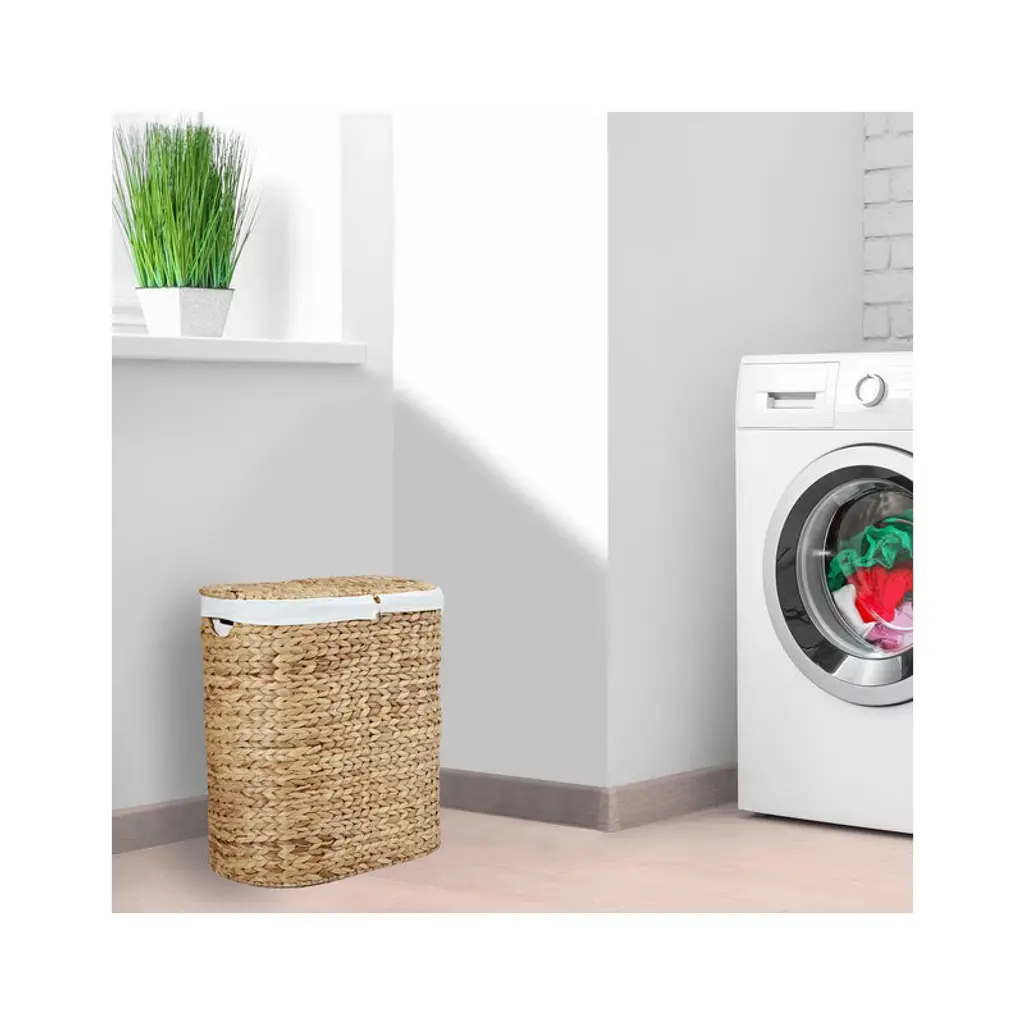 Seville Classics Handwoven Lidded Oval Double Laundry Hamper is a stylish and practical way to store laundry. The handwoven oval lidded hamper includes two removable bag liners (100% polyester). Made from woven water hyacinth wicker wrapped around a study steel frame. Uniquely handwoven by local artisans, so there may be slight variations in size and imperfections. The oval hamper features two thick, removable, and machine washable 100% Polyester canvas liner, making it easy to transport your laundry. The hamper features two cut-out handles for easy carrying.