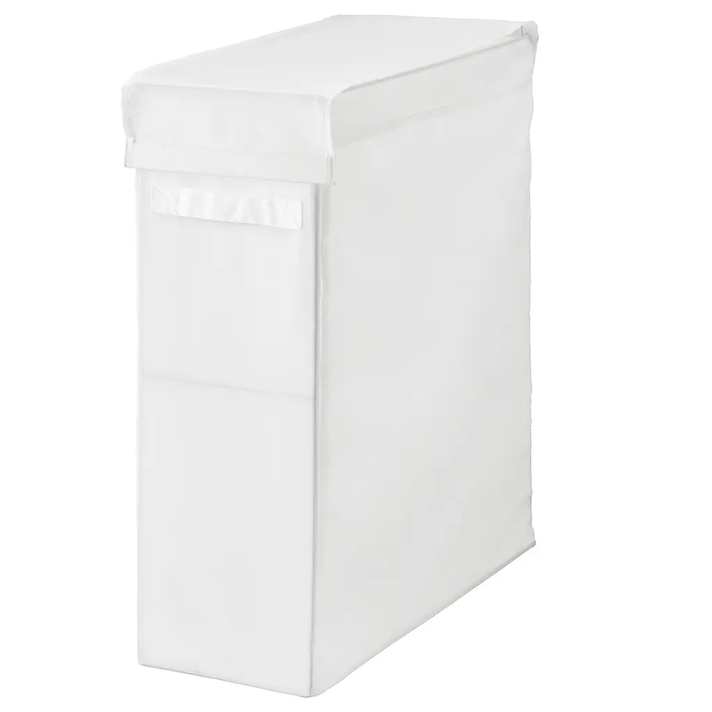 SKUBB Laundry bag with stand - white 21 gallon. The laundry bag does not absorb moisture or odors from the laundry because it is made of polyester. Two laundry bags fit side by side in a 19⅝" wide PAX wardrobe frame with a depth of 22⅞". Holds up to 20 lbs of laundry.