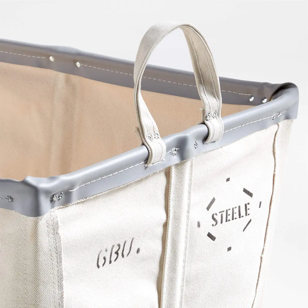 Bring commercial-style efficiency, organization and beauty to your home laundry room. These large canvas trucks store and transfer laundry at an ergonomic, back-saving height. The industrial carts also hold toys, cushions, throw blankets and more throughout the house. Crafted by the Steele Canvas Basket Co., the trucks have sturdy steel frames wrapped in black or natural 100% cotton canvas with thermal plastic rubber edges. Designed with the authentic quality and style of a professional launderer's bin, they boast a 300-pound, 6-bushel capacity and roll smoothly on rubber casters. Wooden lids (sold separately or as part of a set with a bin) keep the contents out of sight and allow the hampers to double as side tables or work surfaces for folding laundry. The striking Steele logo is hand-applied on the hampers using the original brass stencil from 1921 when the company began producing commercial-grade canvas products. Because each bin is cut, bent and welded by hand, there will be a slight variance in size.