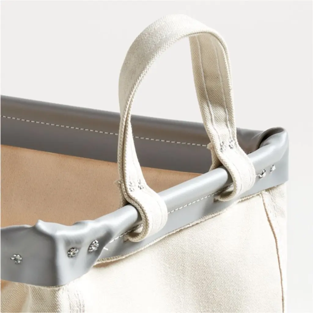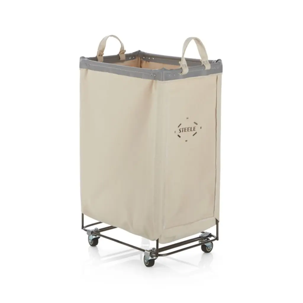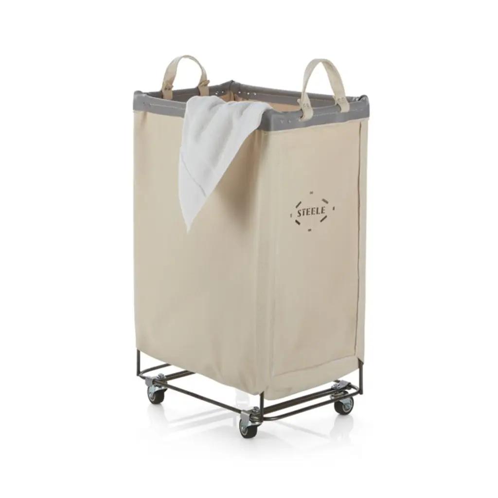 Transform the laundry room into a place of organization and efficiency. This commercial-style canvas features a whopping 200-pound capacity for dry or wet laundry. Manufactured by the Steele Canvas Basket Co., the sturdy steel frame is wrapped in 100% cotton canvas with a thermal plastic rubber edge. Perfect for laundry, kids toys or loose items, the vertical design works well in many tight spaces. Designed with the authentic look and feel of a professional launderer's bin, it glides with ease on 2" rubber casters. Imprinted with the mark of heritage, the Steele logo is hand-applied using the original brass stencil from 1921 when the company began producing commercial-grade canvas products. Because each bin is cut, bent and welded by hand, there will be a slight variance in size. View all Steele products