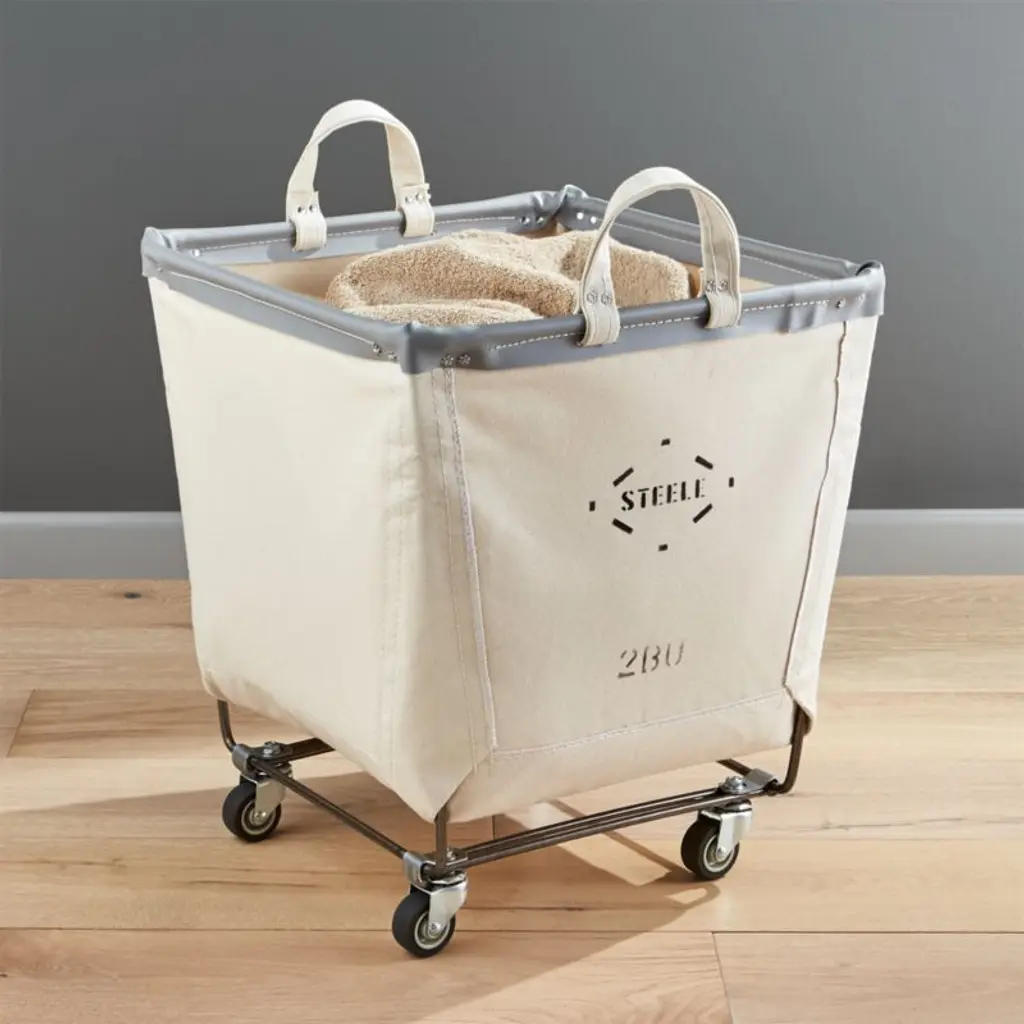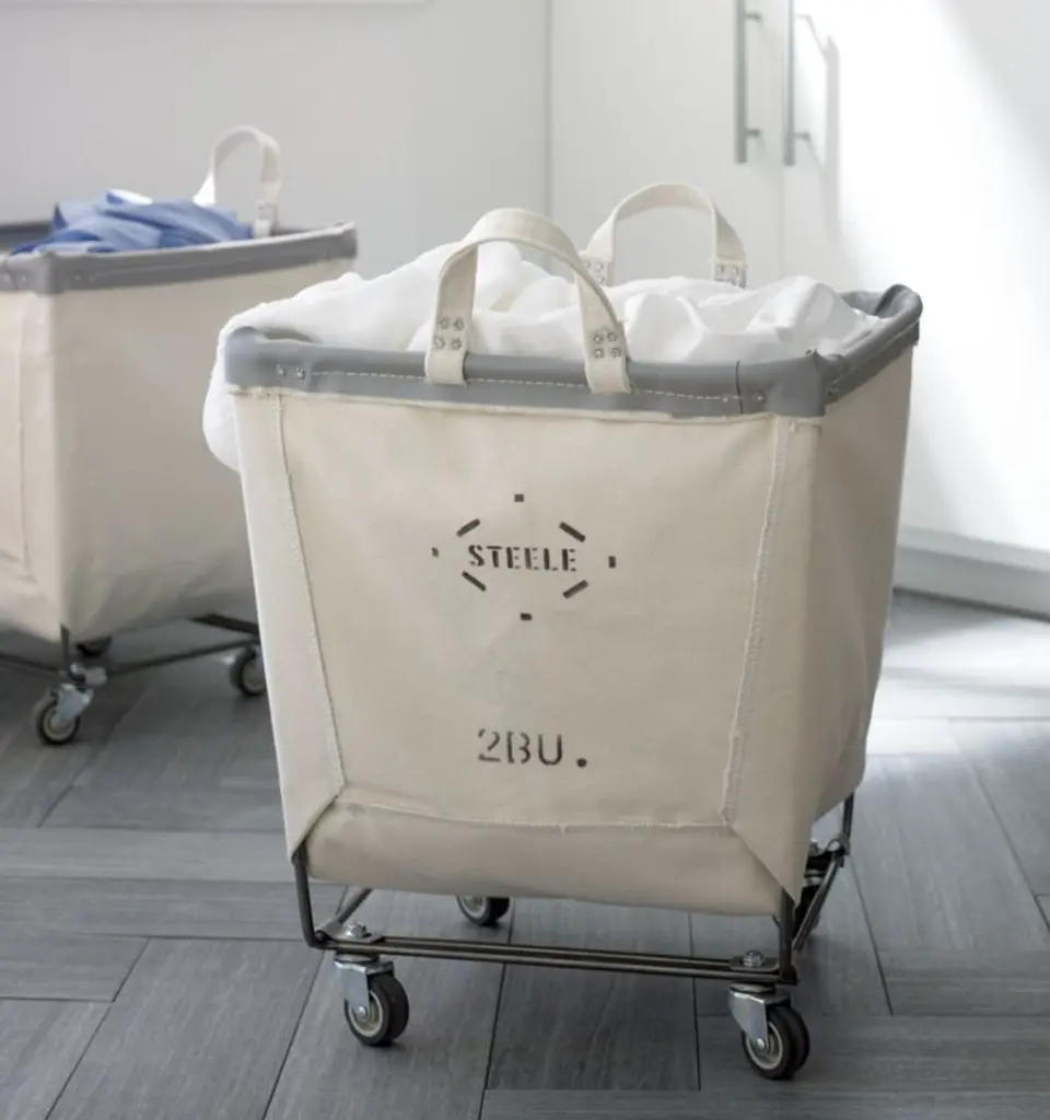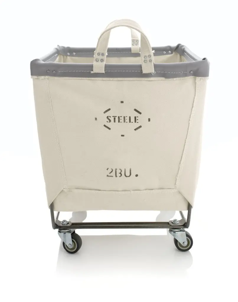 Transform the laundry room into a place of organization and efficiency. This commercial-style bin is deep and spacious to store and move a lot of laundry and other household items. Manufactured by the Steele Canvas Basket Co., the sturdy steel frame is wrapped in 100% cotton canvas with a thermal plastic rubber edge. Designed with the authentic look and feel of a professional launderer's bin, its generous 200-lb. capacity can handle heavy loads, gliding with ease on 2" rubber casters. Imprinted with the mark of heritage, the Steele logo is hand-applied using the original brass stencil from 1921 when the company began producing commercial grade canvas products. View all Steele products