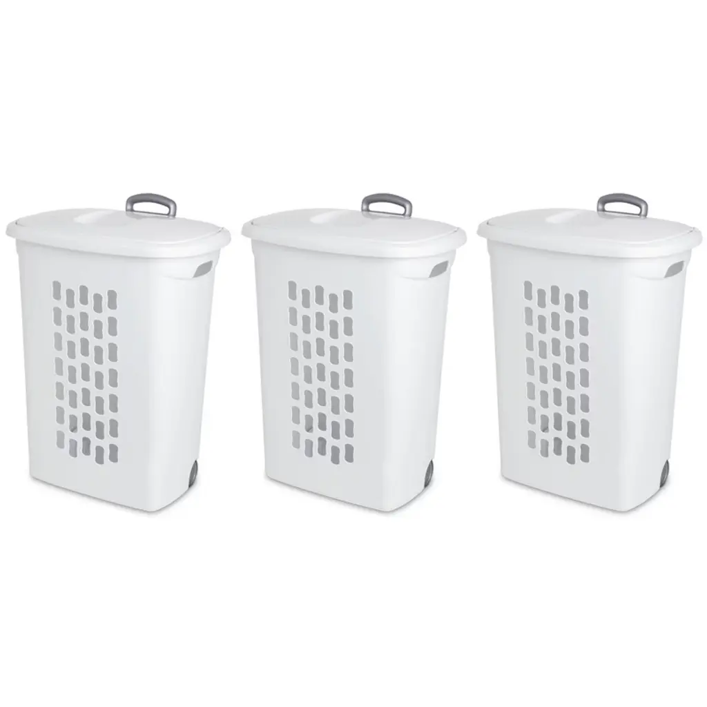 Sterilite Ultra Wheeled Laundry Hamper With Lid, Handle And Wheels For Easy Rolling Of Clothes To And From The Laundry Room, Plastic, White, 3-pack