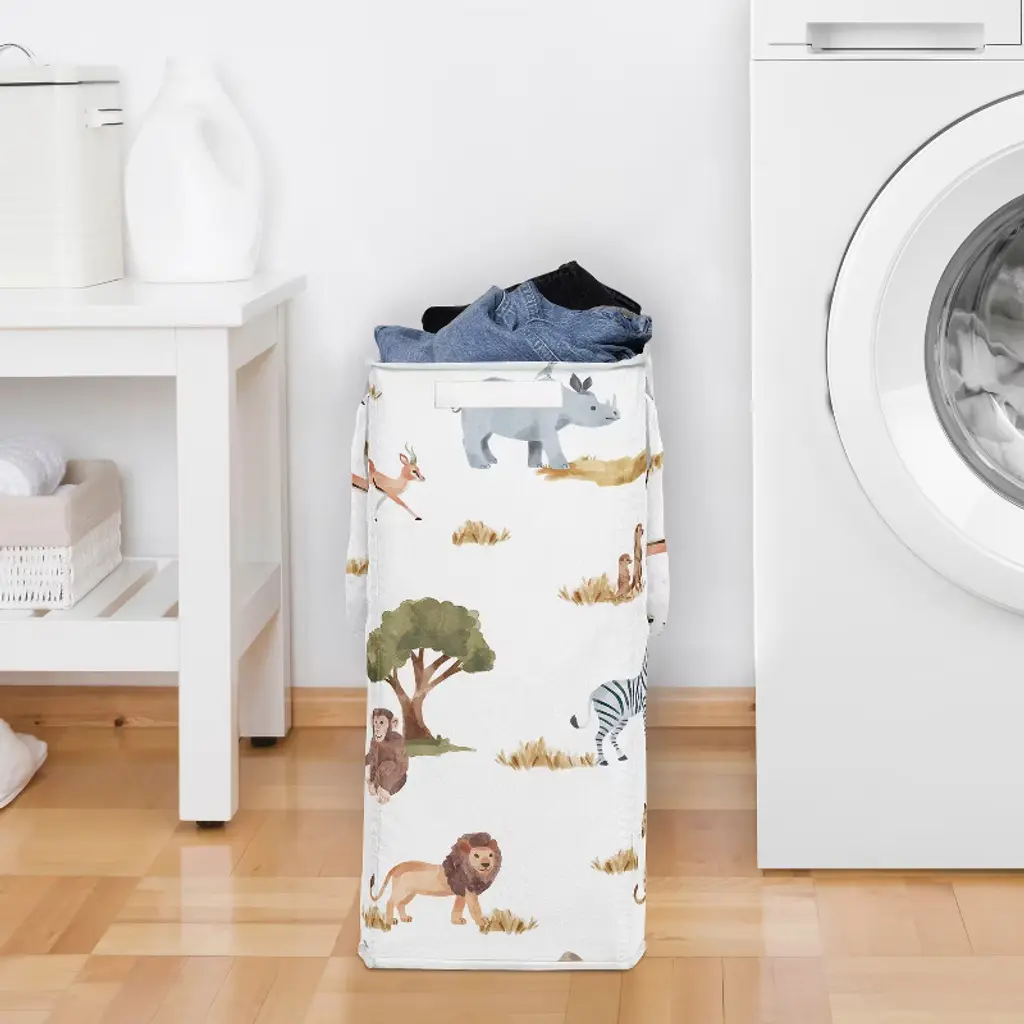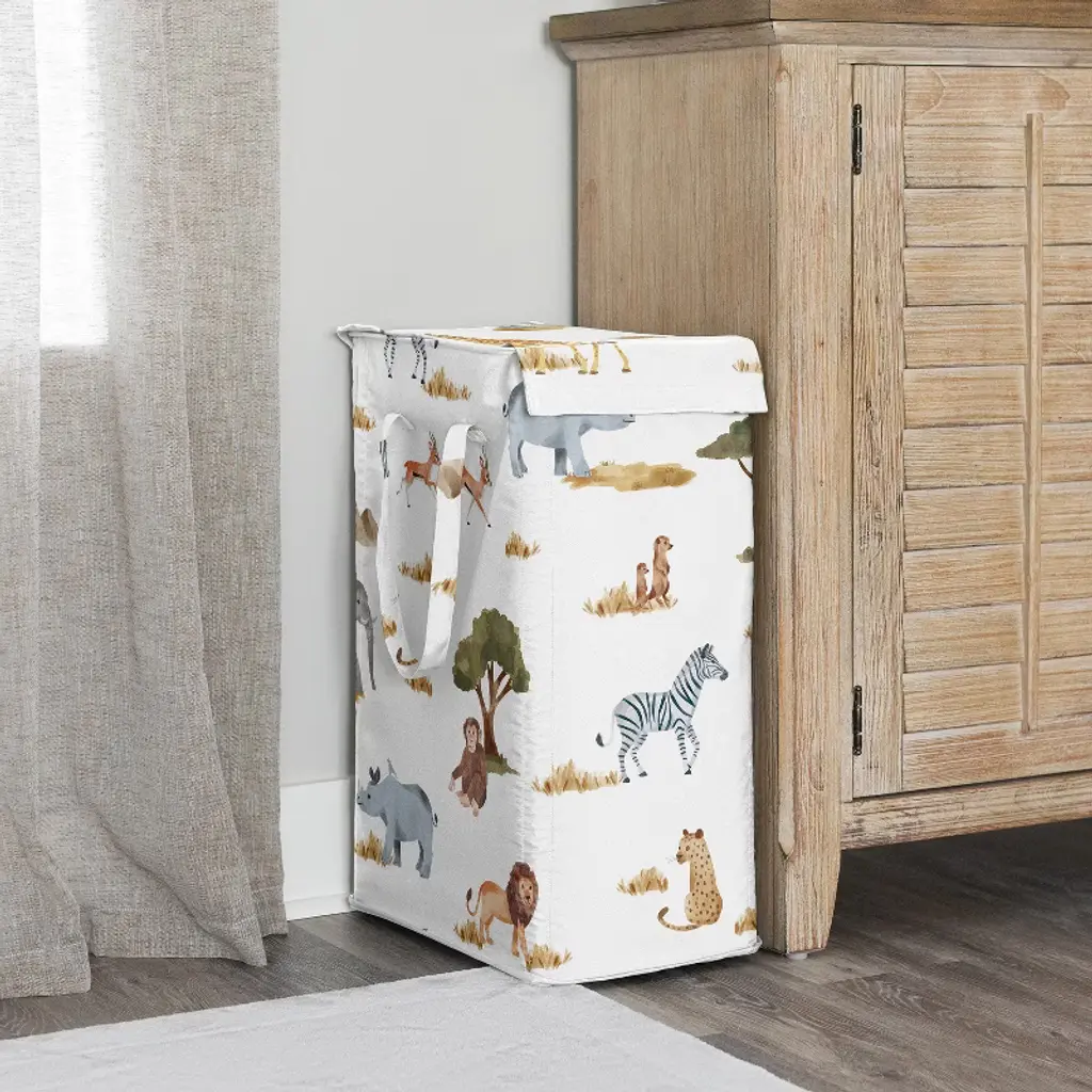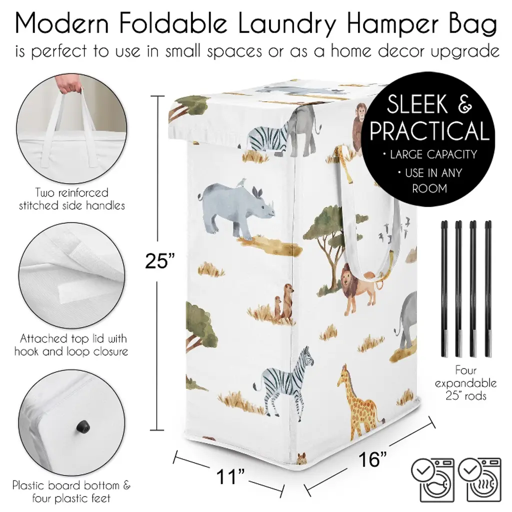 Jungle Collection Sweet Jojo Designs hamper offers a transformative approach to tackling one of your least favorite chores: laundry. This laundry hamper is equipped with all the essentials for a smooth washing experience. Both sides of the foldable basket feature two reinforced side handles, making it convenient to carry your dirty clothes from the mudroom or laundromat to your bedroom. Worried about floor damage? Not with this hamper – the four plastic feet at each corner ensure easy gliding as you move your laundry bin from room to room. Concerned about stability? The hamper boasts sturdy metal wire frames sewn inside the top seam, supporting four corner rods and a plastic board bottom. This construction allows the hamper to stand tall and upright, even when empty. Need to conceal dirty clothes or odors? The attached top lid flap with a hook and loop closure makes it easy to open and close while keeping everything discreet. This versatile clothes bin is ideal for small spaces and serves as a stylish home decor upgrade in various settings such as the nursery, apartment, bedroom, guest room, playroom, laundry room, kids' bedroom, closet, college dorm, and bathroom. Consider purchasing multiple hampers for effortless laundry separation. Want to save space? The glass fiber rods are removable, allowing the collapsible frame to be folded up for compact storage under the bed or in the washroom. These exclusive fabric hampers are designed to coordinate seamlessly with our crib bedding sets, twin or queen bed sheets, window valances, and room decor accessories, providing a complete look for any room in your home. Featuring exclusive canvas fabric of a dark hunter green, gray, yellow, grey, rust orange, black and white boho wildlife safari animal elephant giraffe lion monkey leopard cheetah zebra bird jungle animals print. To wash fabric, remove rods and machine wash cold, tumble dry low.