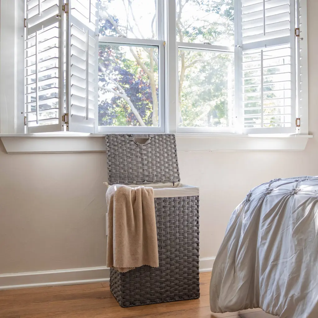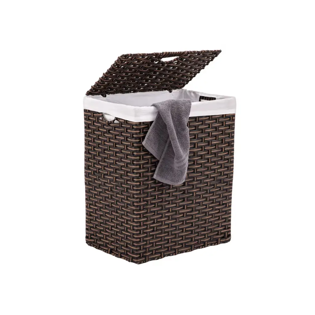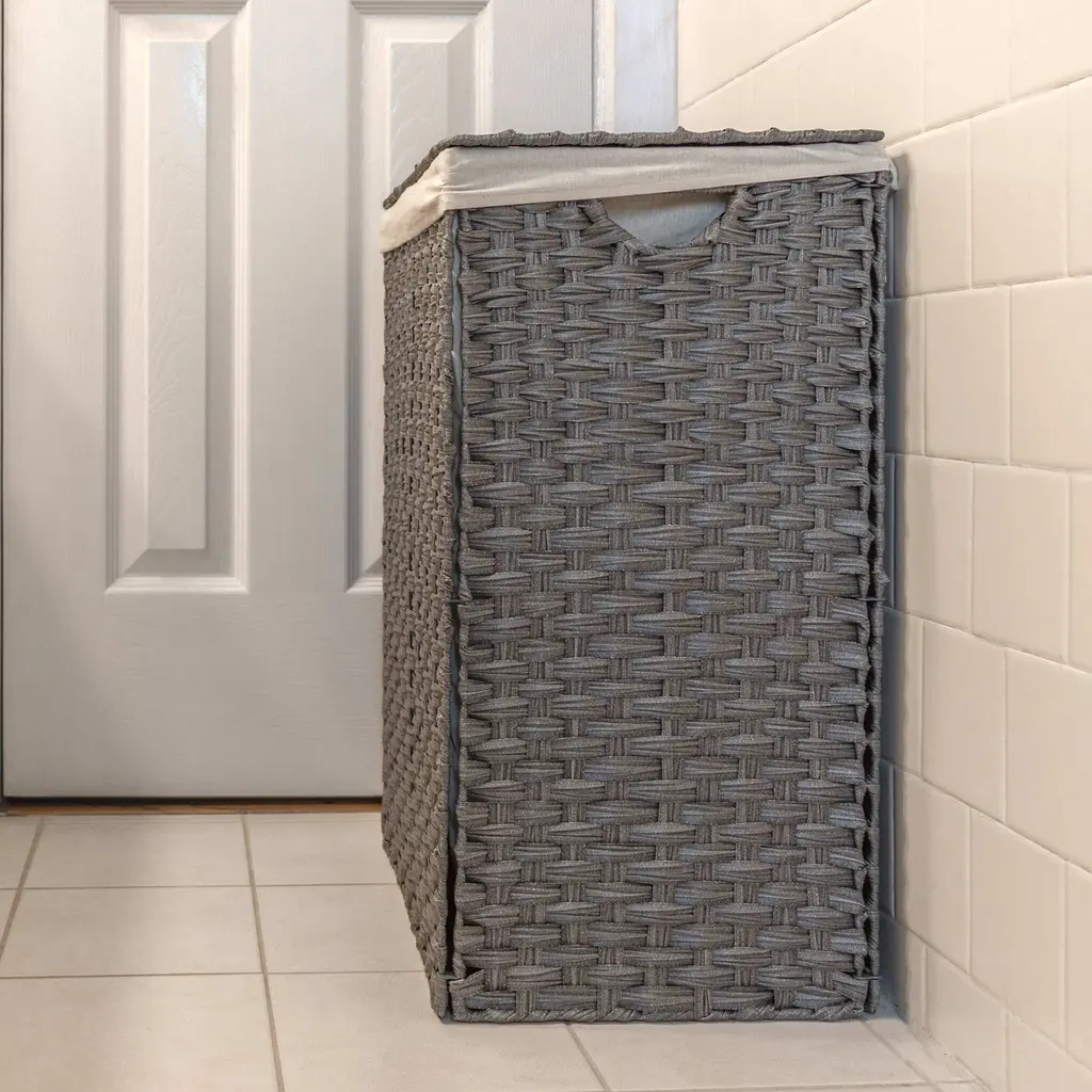 This versatile hamper is made from sturdy synthetic plastic wicker. It measures 16.9"L x 11.8"W x 24"H and comes with a lid and removable liner. We recommend the liner be washed in cold water, gentle cycle and lay flat to dry. The basket folds for easy storage and transport. Perfect for a dorm room, apartment or home. Meant for small spaces. By Trademark Innovations.
