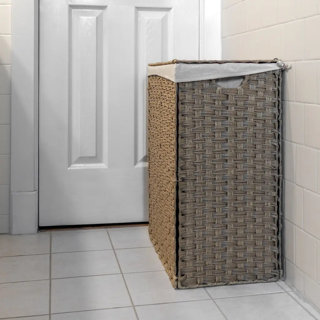 This versatile hamper is made from sturdy synthetic plastic wicker. It measures 16.9"L x 11.8"W x 24"H and comes with a lid and removable liner. We recommend the liner be washed in cold water, gentle cycle and lay flat to dry. The basket folds for easy storage and transport. Perfect for a dorm room, apartment or home. Meant for small spaces. By Trademark Innovations.