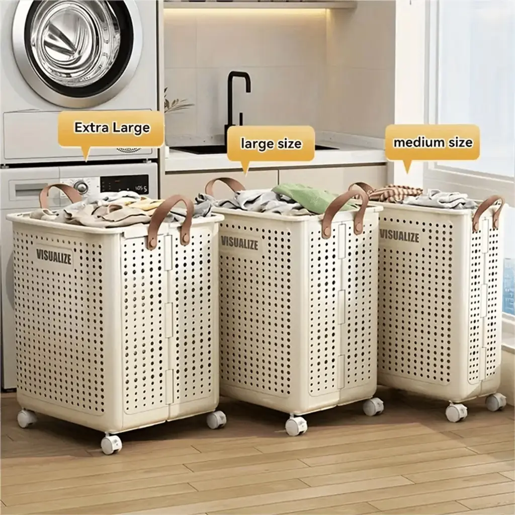 Tramull Collapsible Ceramic White Laundry Basket With Wheels, Medium-large Hamper For Bathroom & Balcony