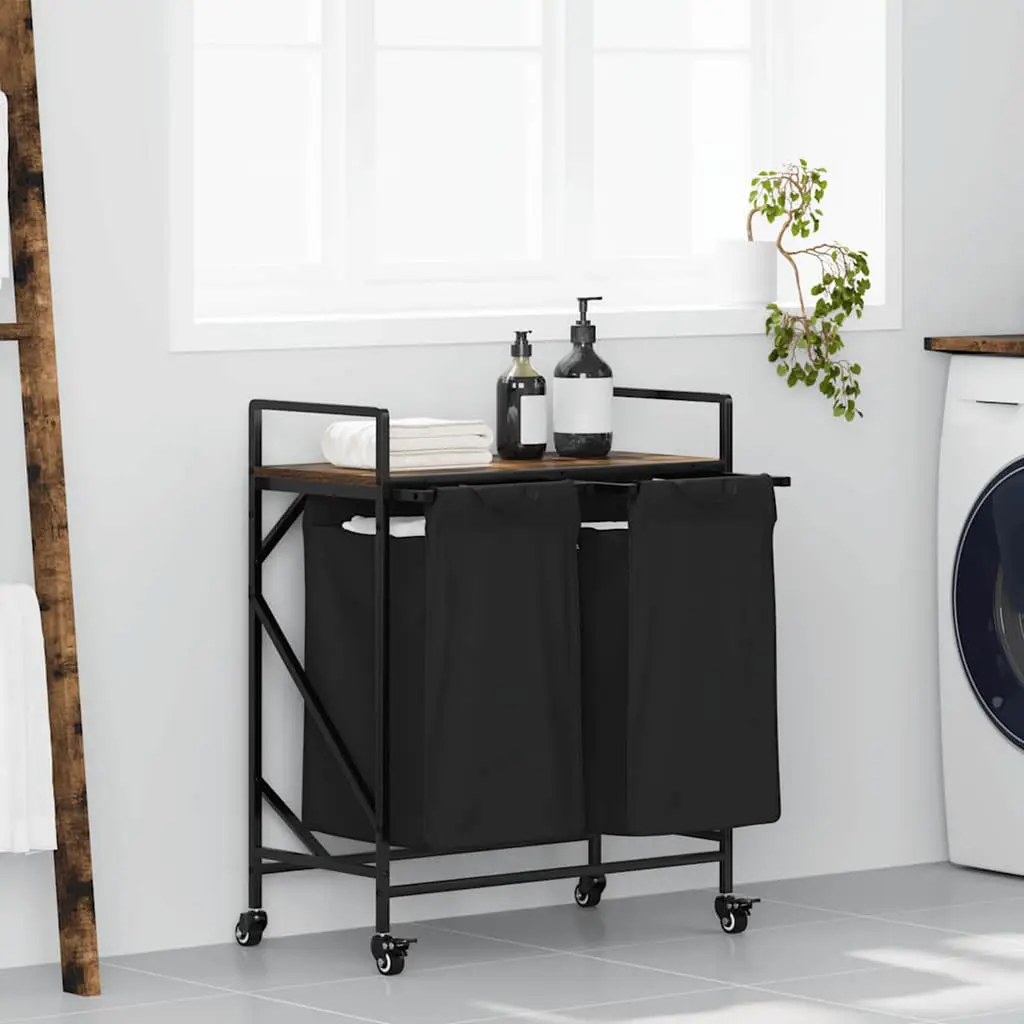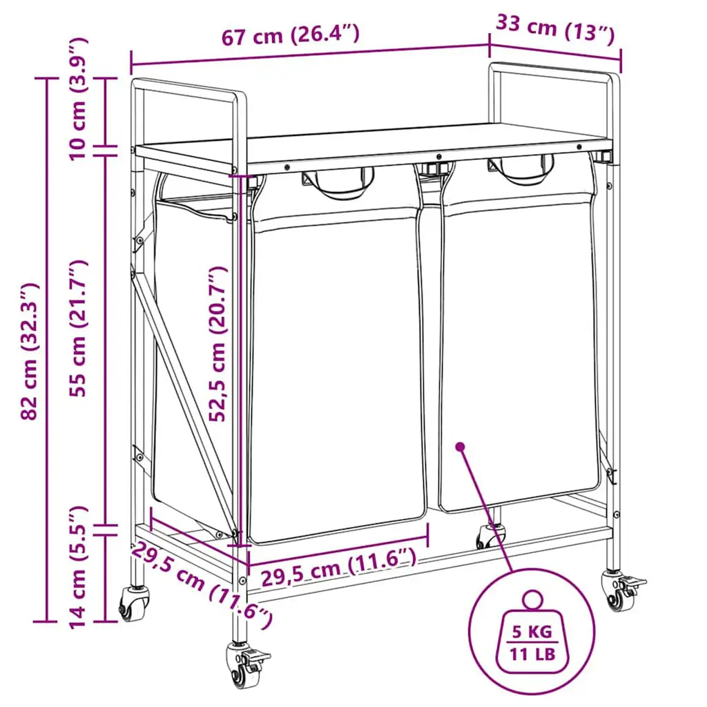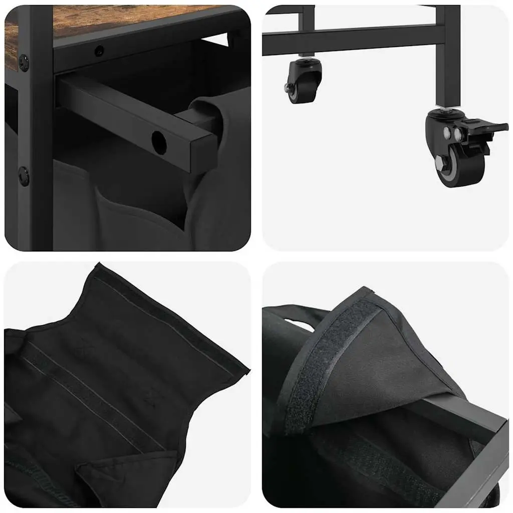 The laundry basket provides a spacious and convenient storage solution, featuring pull-out bags and wheels that make organising and transporting your laundry effortless.Laundry sorter: Designed to offer a generous load of laundry per bag, this organiser helps categorise garments by colour or fabric type, maintaining a clutter-free laundry area, and also storing toys and more.Convenient pull-out laundry bags: The removable laundry bags are designed with pull-out handles and hook-and-loop fasteners for easy detachment and pulling. The reinforced bottom panels help maintain the bags' shape and prevent sagging.Robust and durable structure: This laundry basket combines a steel frame with durable engineered wood, offering excellent strength, wear resistance, and stability.Top storage surface: The laundry basket features a top shelf, offering a practical solution for keeping your essentials within easy reach. Perfect for storing toiletries, laundry detergents, fabric softeners, or even decorative items.Effortless mobility: Featuring durable wheels for easy movement, this laundry basket allows you to smoothly roll it from room to room. Two of the wheels are equipped with brakes, ensuring that once you've placed the basket where you need it, it stays securely in place without rolling away.