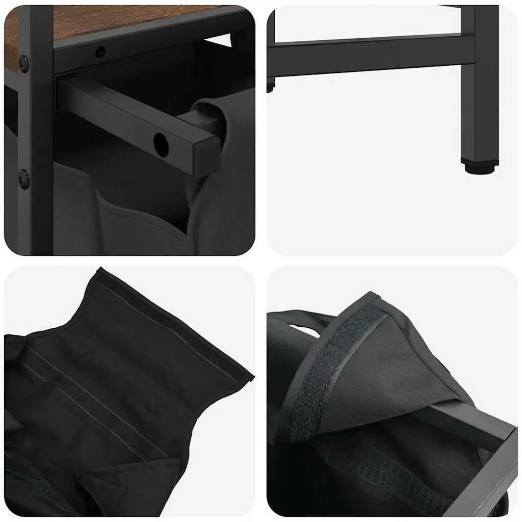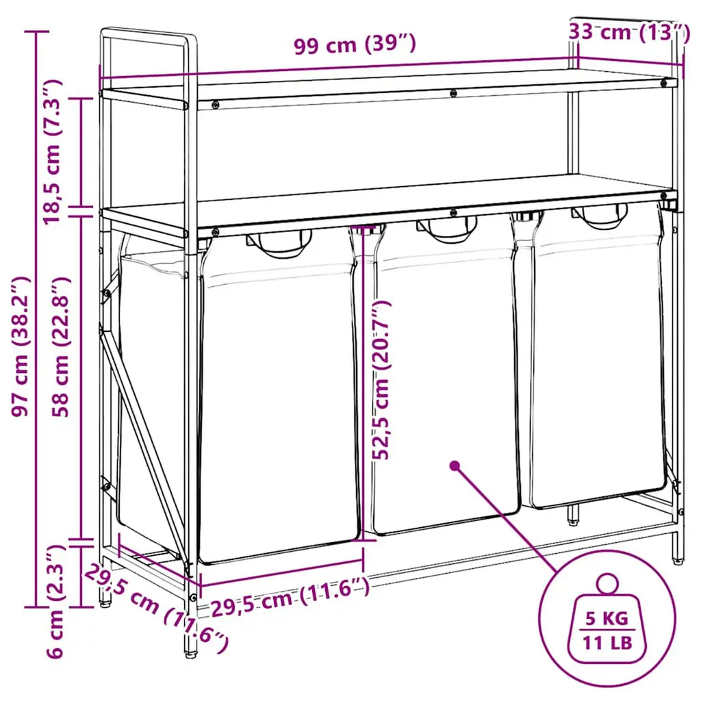 The laundry basket provides a spacious and convenient storage solution, with pull-out bags that make organising your laundry effortless.Laundry sorter: Designed to offer a generous load of laundry per bag, this organiser helps categorise garments by colour or fabric type, maintaining a clutter-free laundry area, and also storing toys and more.Convenient pull-out laundry bags: The removable laundry bags are designed with pull-out handles and hook-and-loop fasteners for easy detachment and pulling. The reinforced bottom panels help maintain the bags' shape and prevent sagging.Robust and durable structure: This laundry basket combines a steel frame with durable engineered wood, offering excellent strength, wear resistance, and stability.Top storage surface: The laundry basket features additional shelves, offering a practical solution for keeping your essentials within easy reach. Perfect for storing toiletries, laundry detergents, fabric softeners, or even decorative items.Versatile and multifunctional: Perfect for the laundry room, bathroom, or bedroom, this unit seamlessly blends functionality with style, keeping your home tidy and organised while complementing various décor themes.Warning:To prevent it from tipping over, this product must be used with the provided wall attachment device.