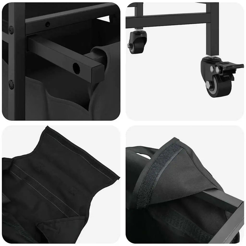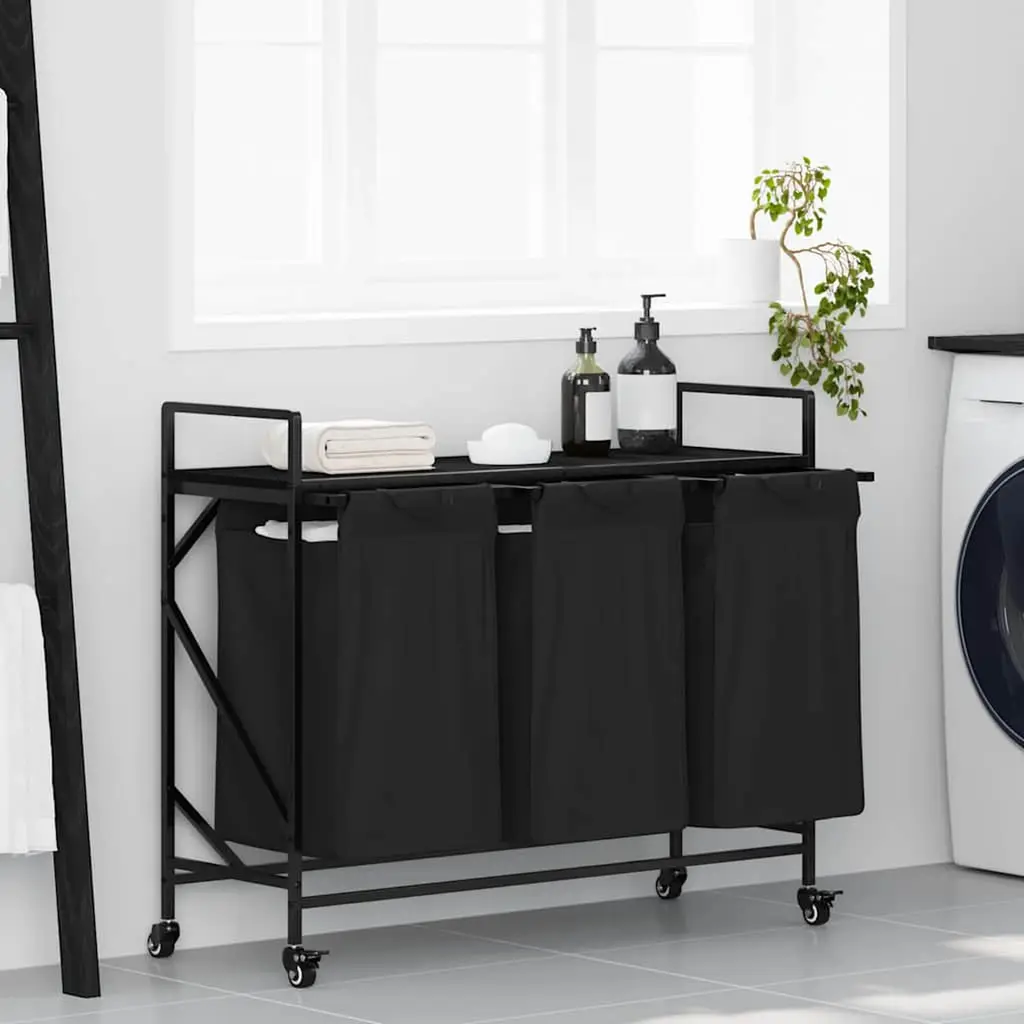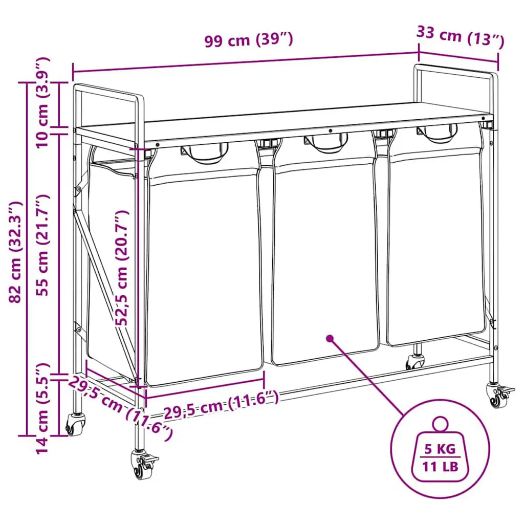 The laundry basket provides a spacious and convenient storage solution, featuring pull-out bags and wheels that make organising and transporting your laundry effortless.Laundry sorter: Designed to offer a generous load of laundry per bag, this organiser helps categorise garments by colour or fabric type, maintaining a clutter-free laundry area, and also storing toys and more.Convenient pull-out laundry bags: The removable laundry bags are designed with pull-out handles and hook-and-loop fasteners for easy detachment and pulling. The reinforced bottom panels help maintain the bags' shape and prevent sagging.Robust and durable structure: This laundry basket combines a steel frame with durable engineered wood, offering excellent strength, wear resistance, and stability.Top storage surface: The laundry basket features a top shelf, offering a practical solution for keeping your essentials within easy reach. Perfect for storing toiletries, laundry detergents, fabric softeners, or even decorative items.Effortless mobility: Featuring durable wheels for easy movement, this laundry basket allows you to smoothly roll it from room to room. Two of the wheels are equipped with brakes, ensuring that once you've placed the basket where you need it, it stays securely in place without rolling away.