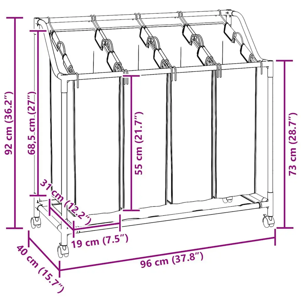 This laundry basket with wheels is an ideal choice to store and classify your clothes, making your life easier and more comfortable.Sturdy structure: The laundry basket's frame is made of steel with a plastic coating, making it durable, rust-resistant, and long-lasting.Ample storage space: This laundry basket has 4 laundry bags, allowing you to store your clothes by colour and material, ensuring your clothes are well organised and saving you time.Detachable design: The laundry basket features hook-and-loop fasteners, allowing it to be easily moved or secured as needed. Additionally, the removable top support rods add versatility for flexible use.Easy to move: This laundry basket, with the included four swivel wheels, can be easily moved to the desired place. The two wheels with brakes keep the basket in position and add stability.Elevated design: Thanks to its elevated design, this laundry basket keeps your laundry off the floor, promoting better airflow to reduce moisture buildup and making it easier to access.