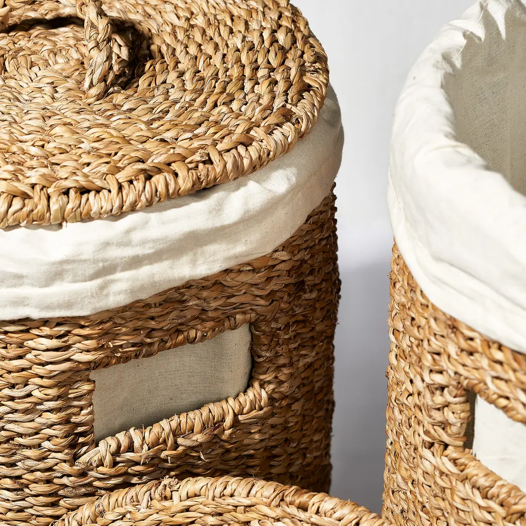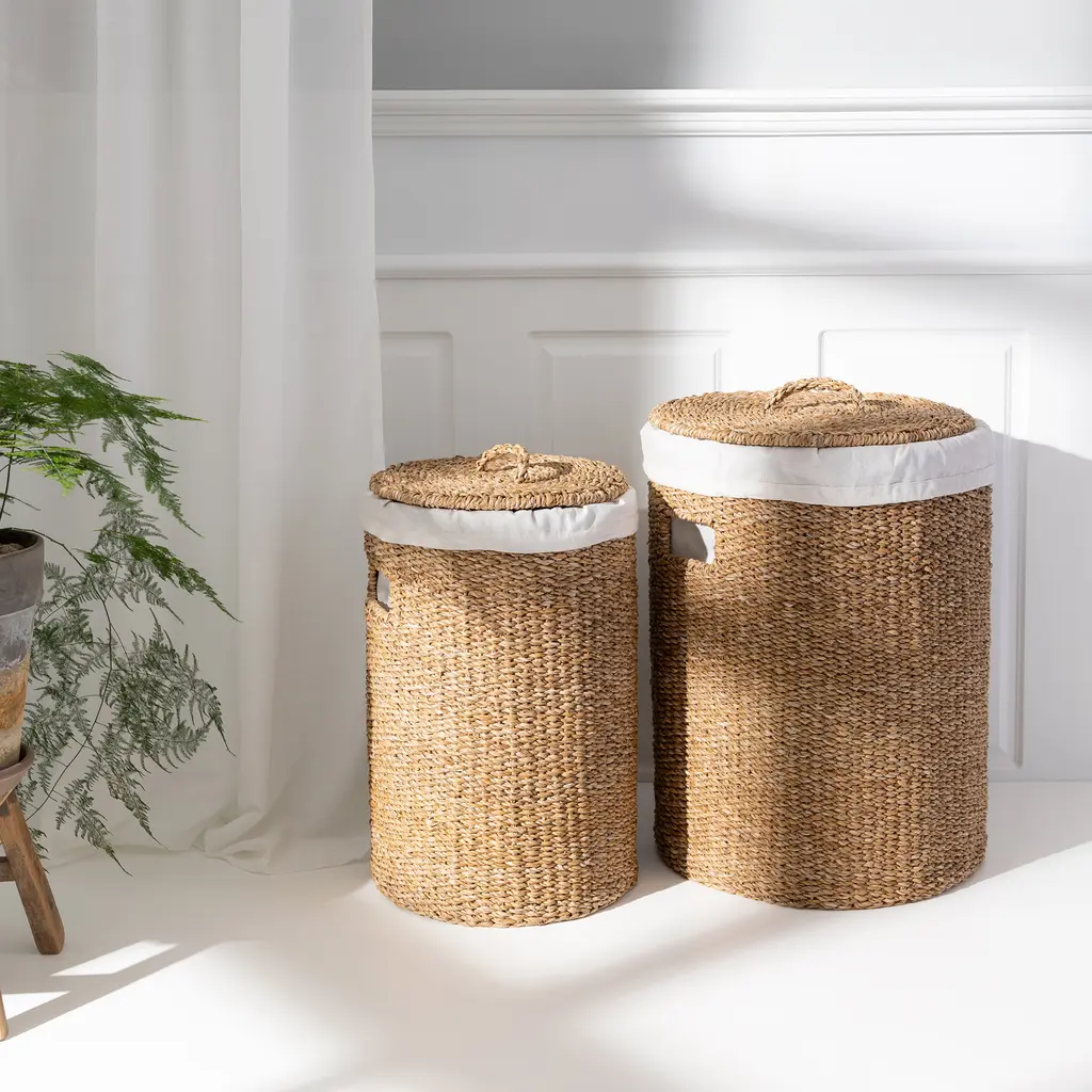 Store and organize your laundry the Scandinavian way with this wicker laundry hamper set. Designed and made by Danish brand Humdakin, a company dedicated to producing sustainable products for modern homes, the Laundry Hamper Set is made from natural sea grass and organic cotton. Lids with practical handles provide an easy solution to check the contents of the hampers and to fill them or remove items. Each woven laundry hamper boasts a gorgeous texture that showcases the beauty and sturdiness of sea grass. Inside, cotton linings protect even the most delicate pieces of clothing. Conveniently removable, the linings can be easily washed in the washing machine at temperatures of up to 60°C, or 140 Fahrenheit. While designed for laundry, this Humdakin wicker laundry hamper set can also be used for other items, including to store toys in a child’s room or bedding in a bedroom.