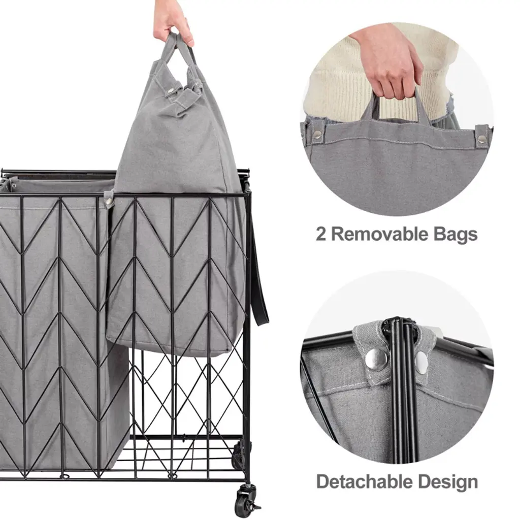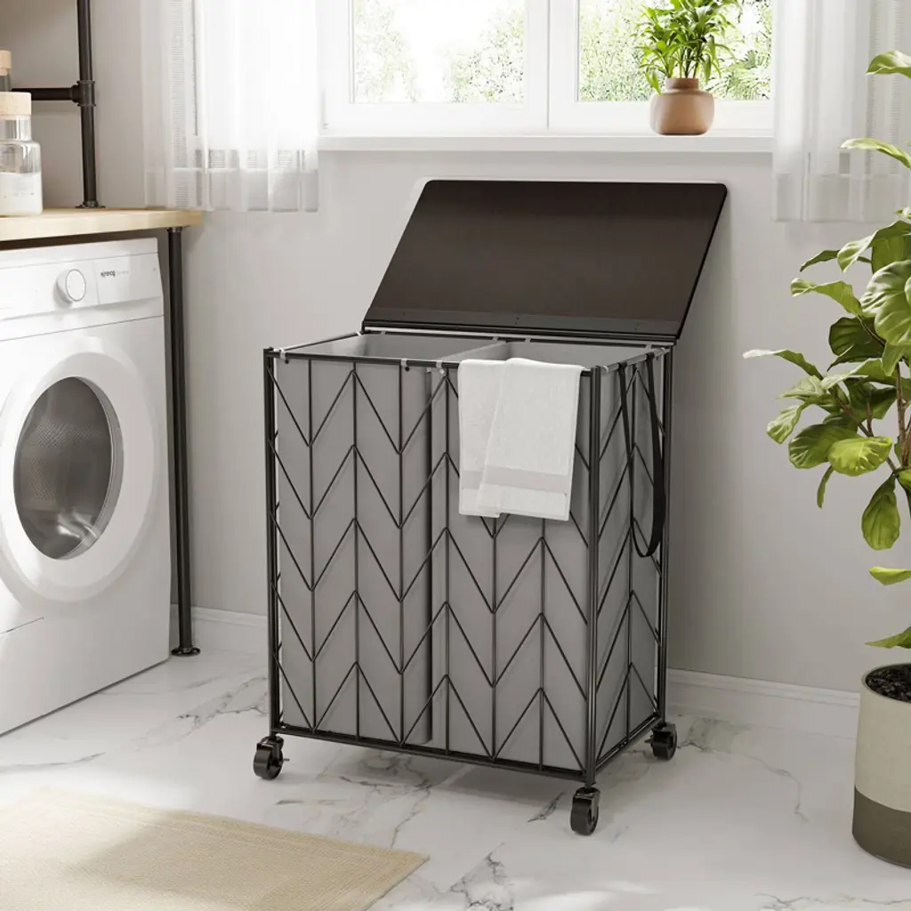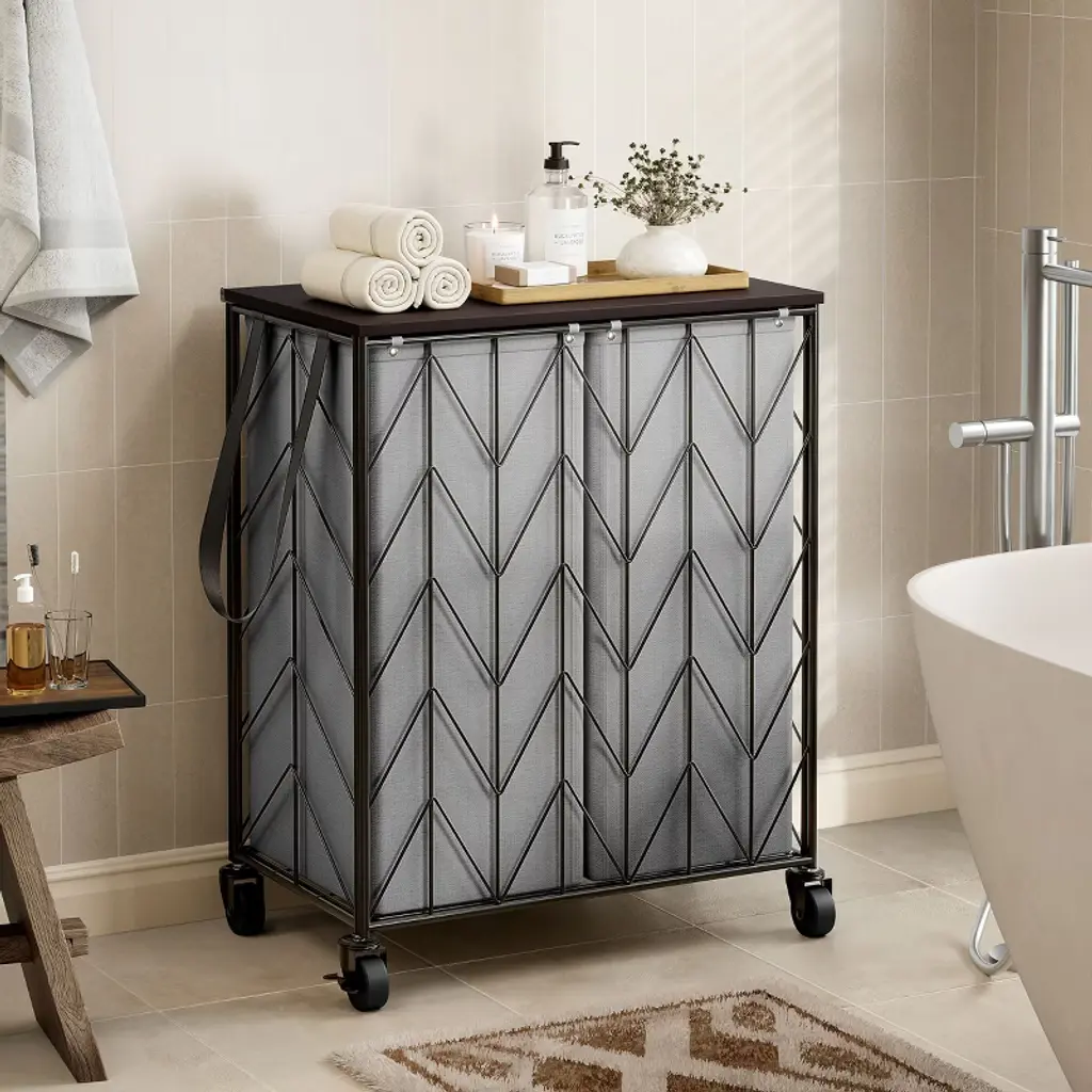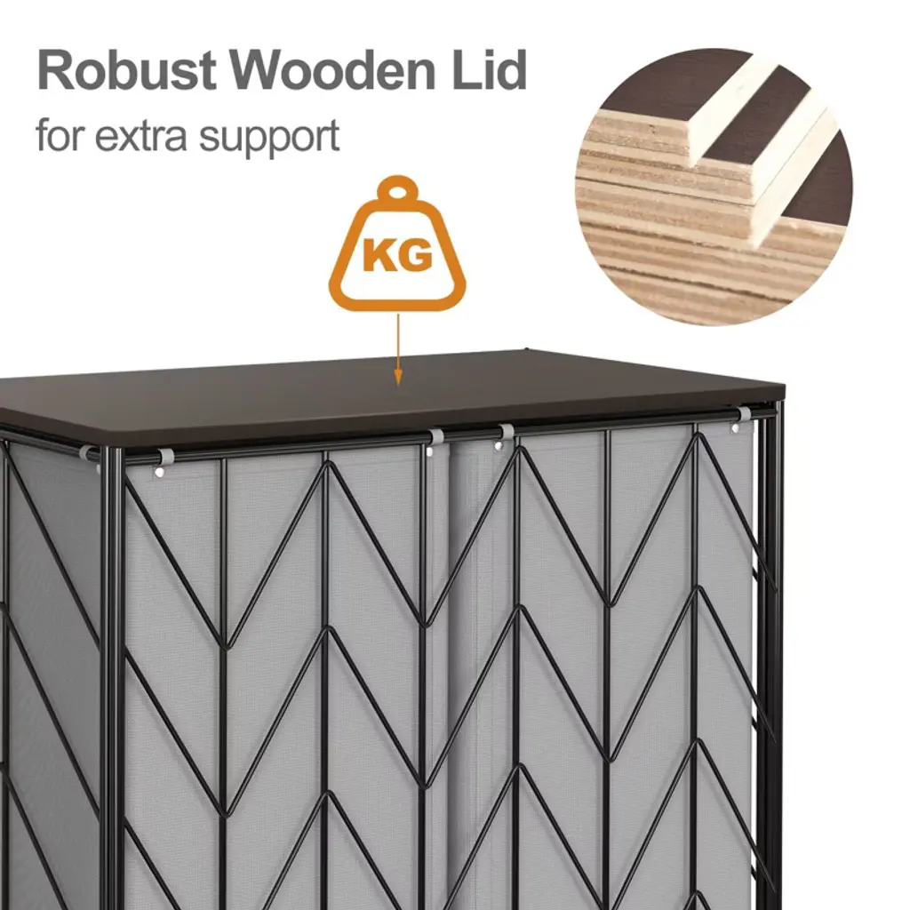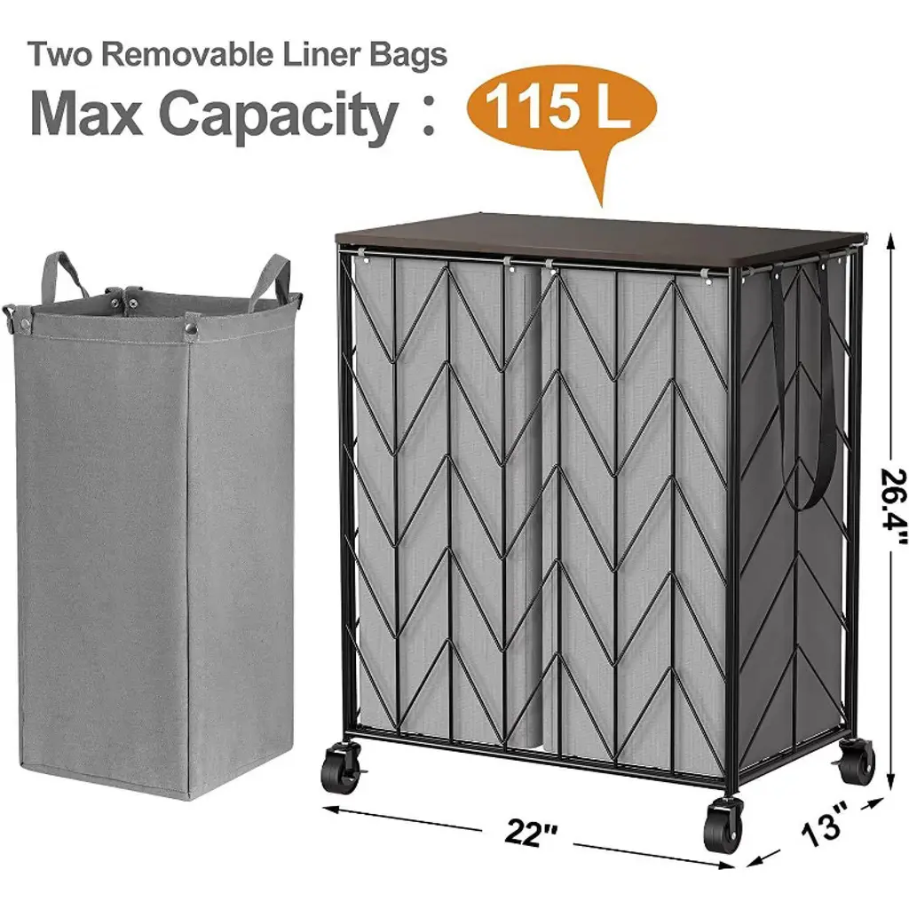 Upgrade your laundry with this heavy-duty mobile hamper! Features a sturdy wire frame, removable washable liner, and handy wooden top for supplies. Four smooth-rolling wheels make moving laundry effortless. Dual inner bags separate darks and lights, with 115L capacity for all family laundry. Quick assembly with labeled parts—quality guaranteed.