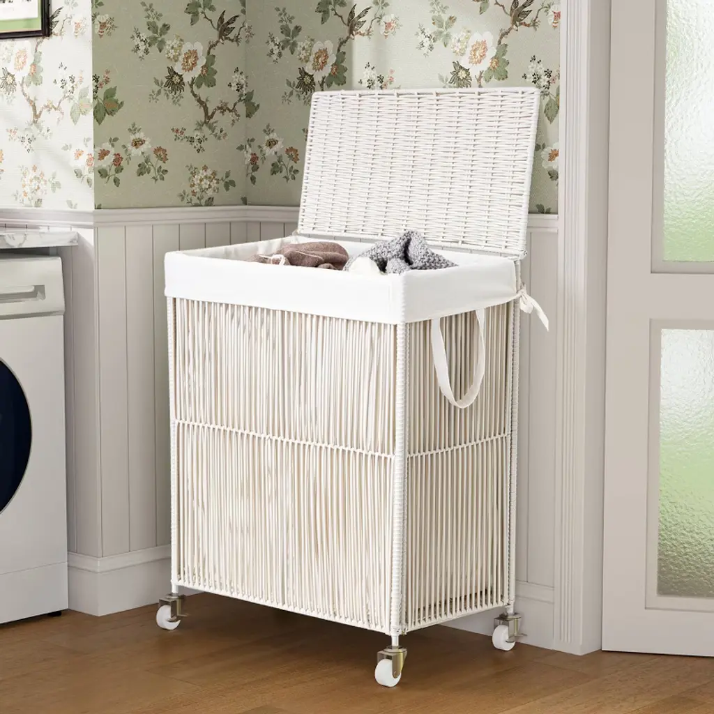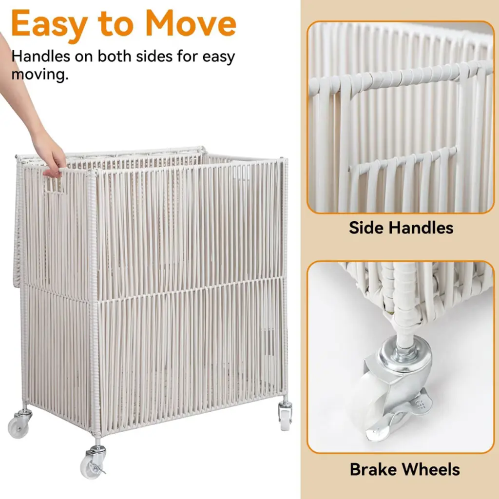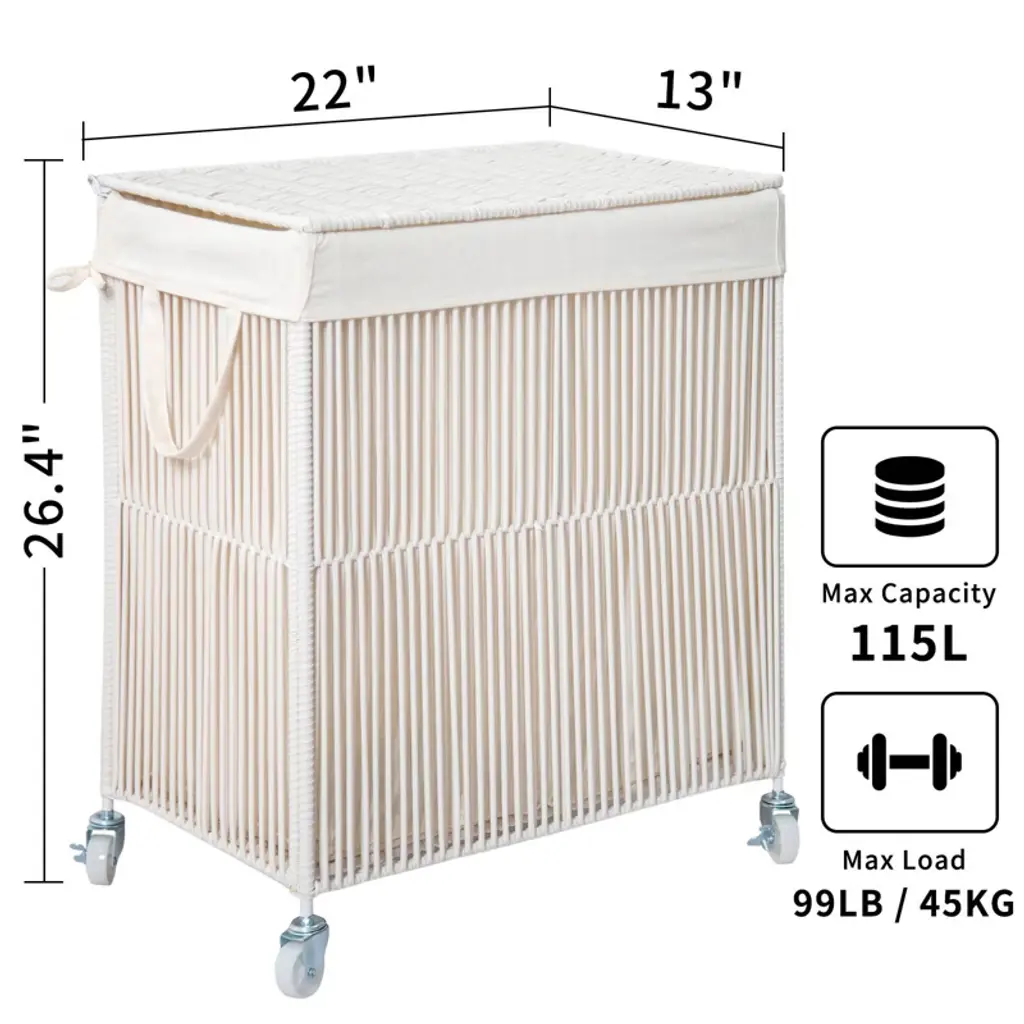 Wowlive Rolling Laundry Hamper With Wheels And Lid, 2-compartment Rattan Basket With Removable Liner White