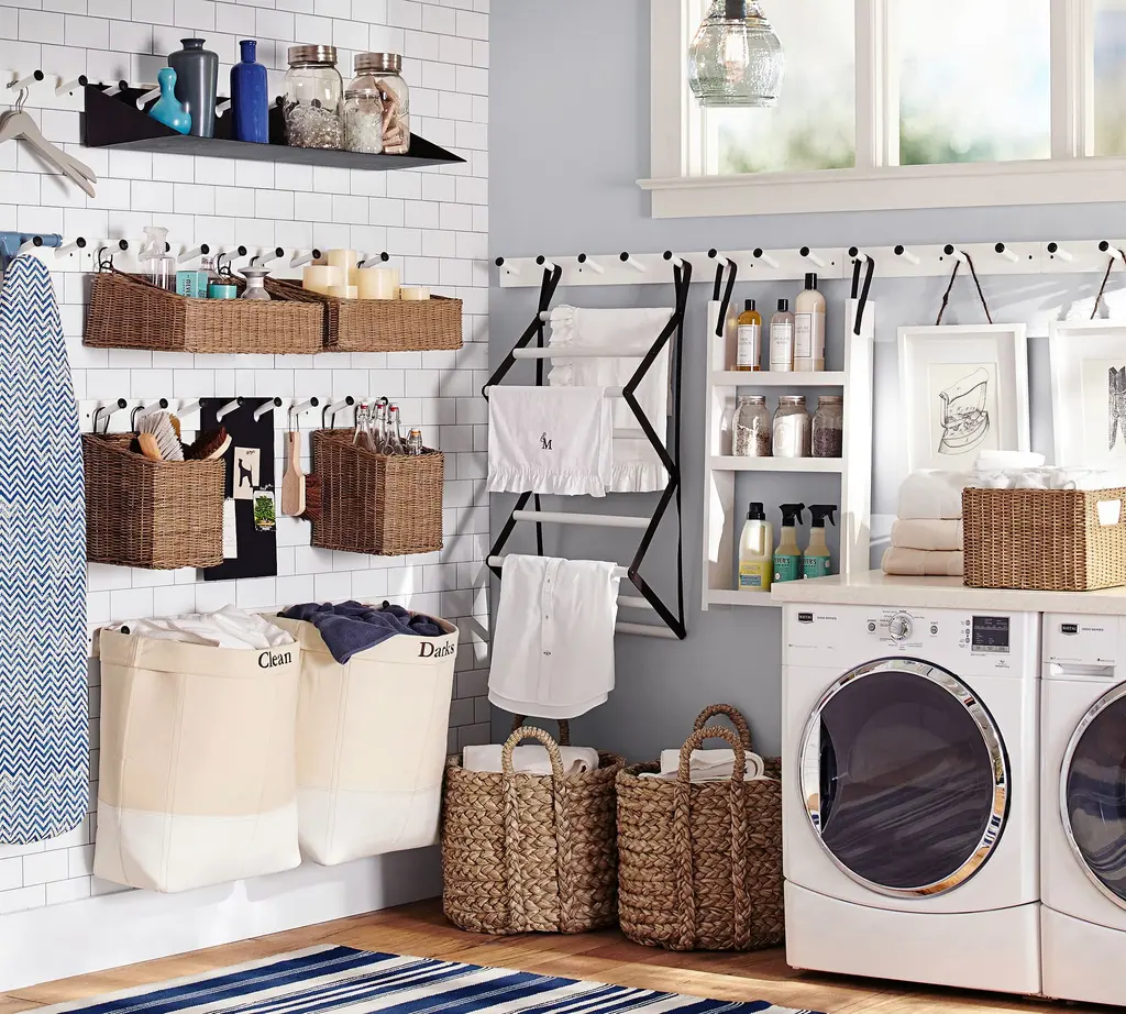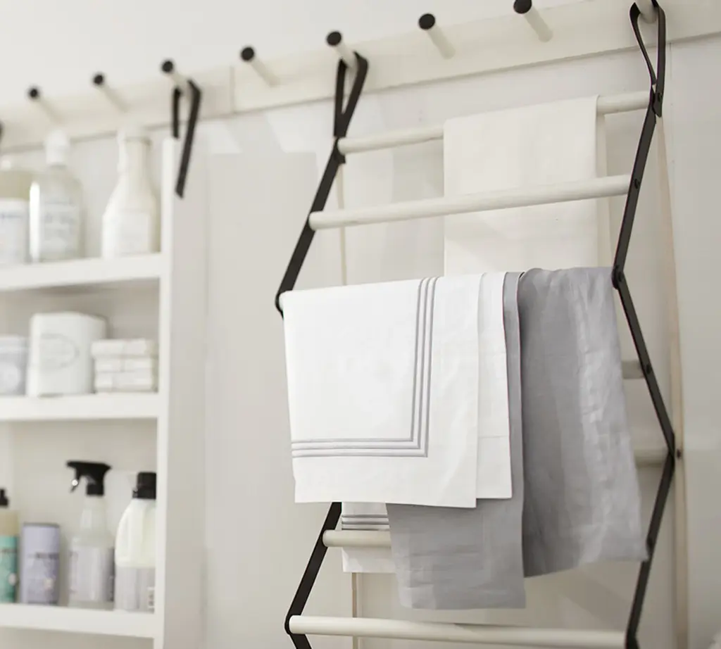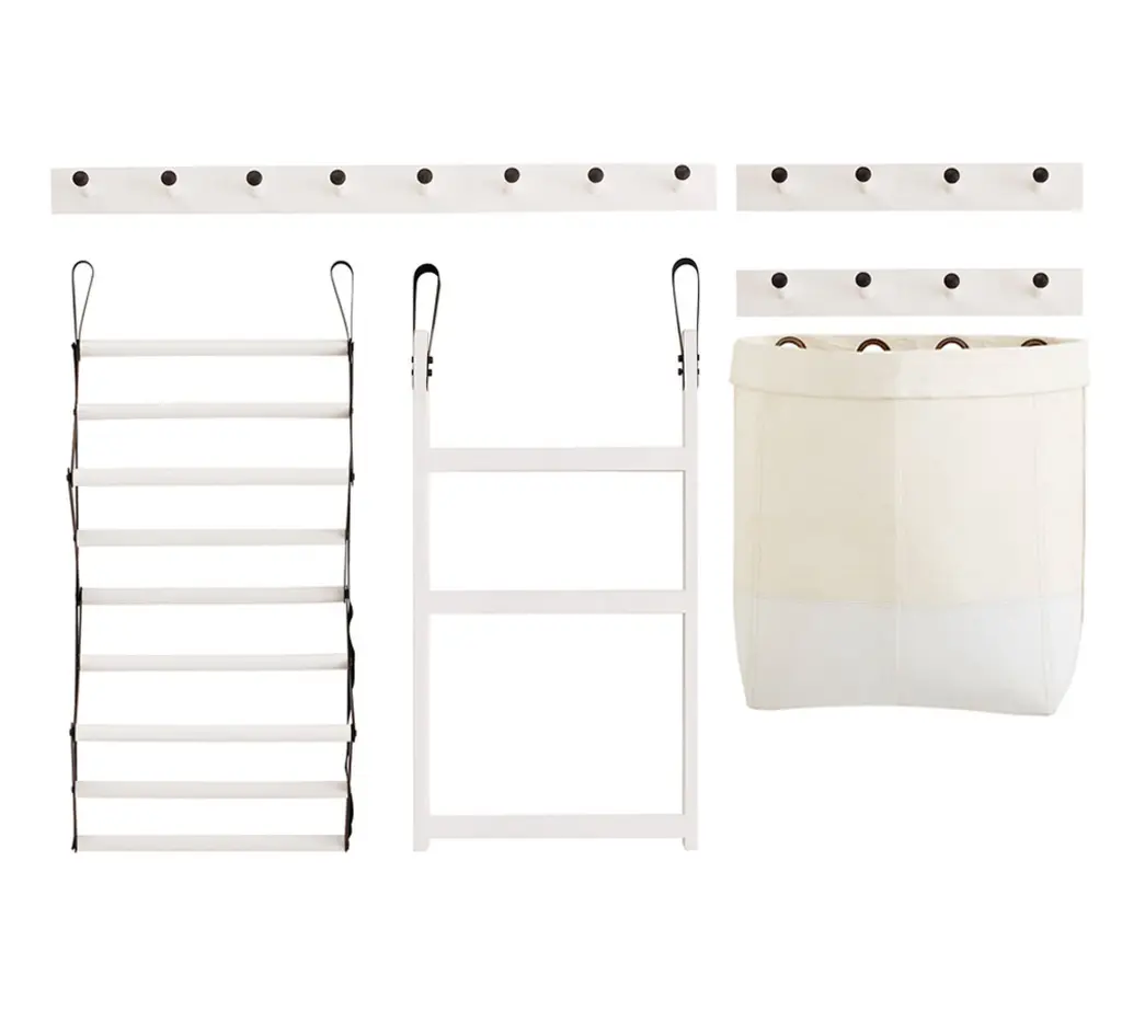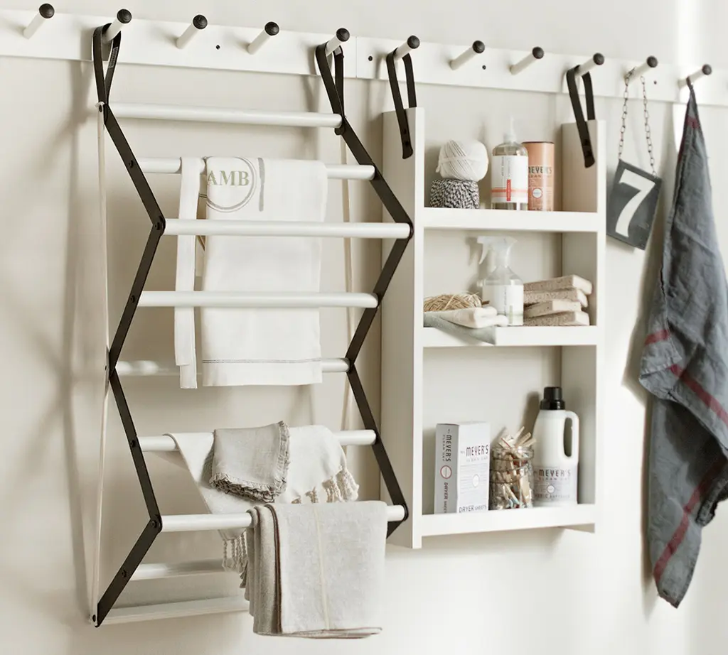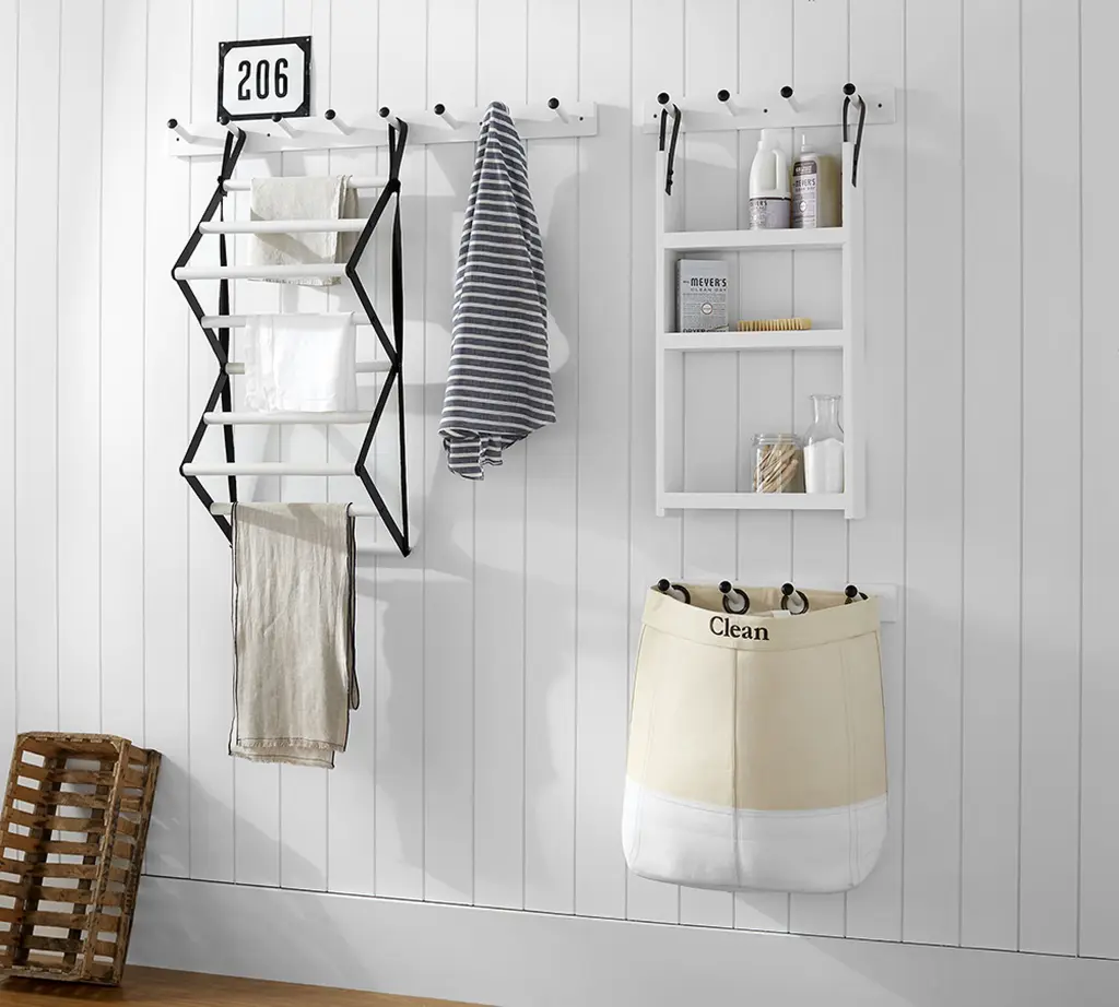 Smart and stylish, with a rail-and-peg system plus shelves, a hanging canvas hamper and a drying rack, our collection elevates the usefulness and style of the laundry room. Because it’s modular, it can be configured to suit various spaces and organizing needs.