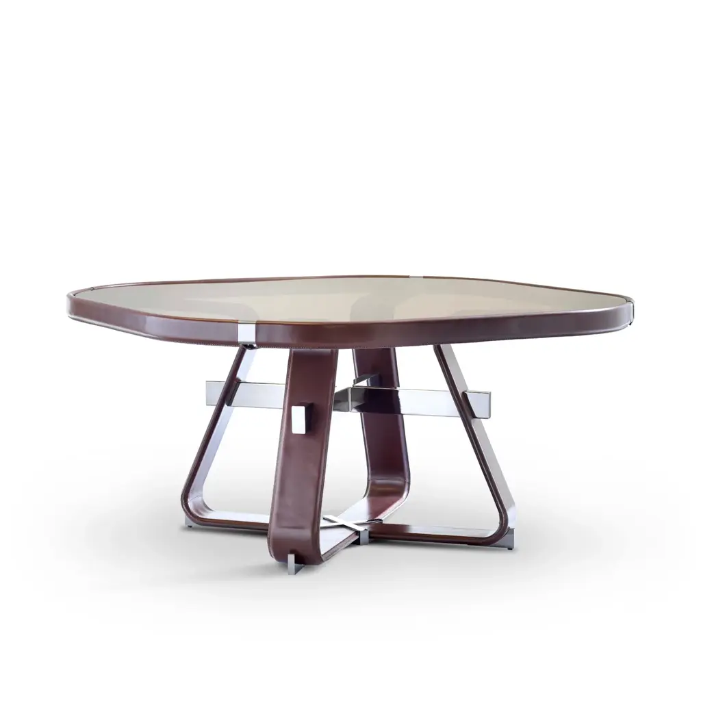 The CROWN table is round and regal. The central support composed of a circular metal grille seems almost like a crown. The slender, visually light base forms a contrast with the top in solid wood that contains three large marble inlays, inserted in the wooden structure. Since the table has a large diameter of 240 cm, the center can be equipped with a handy Lazy Susan, to allow guests to help themselves to different dishes. TECHNICAL SPECIFICATIONSFRAME IN SATINED, CHROMED, BLACK CHROMED, BURNISHED, BRONZED 457 OR CHAMPAGNE METAL.TOP IN WOOD (ASHWOOD NATURAL, STAINED WENGÉ, STAINED EBONY OR STAINED BROWN) WITH MARBLE INSERTS (GLOSSY WHITE CARRARA, GLOSSY BLACK MARQUINIA, EMPERADOR EITHER GLOSSY OR MATT, CALACATTA ORO EITHER GLOSSY OR MATT)LAZY SUSAN IN SOLID ASHWOODWOOD NATURAL, STAINED EBONY, STAINED WENGE’ OR STAINED BROWN. WITH ROTATING MOVEMENT.MATERIAL1. FRAMEMETAL FINISHES2. TOPMARBLE FINISHES - WOOD FINISHES