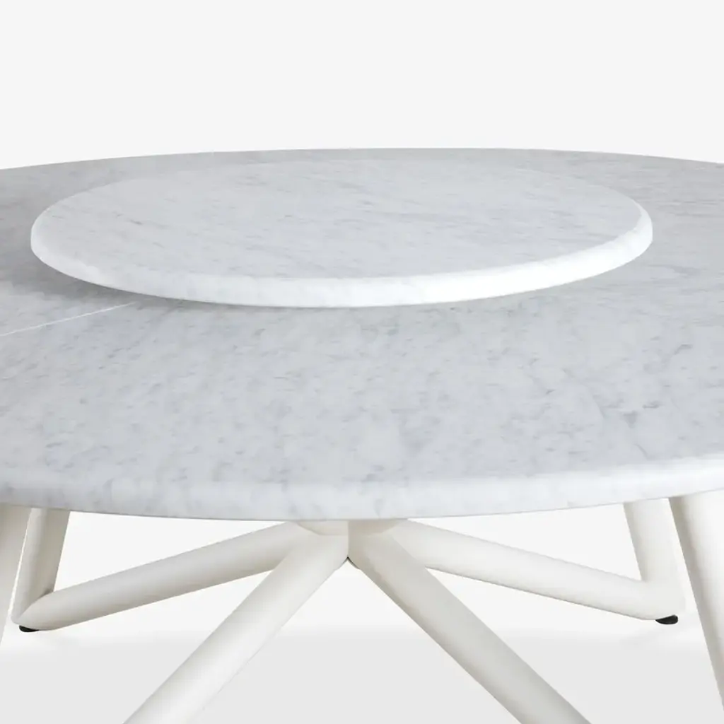 Hermu is a collection of a large round tables of the Lazy Susan type, a term that stands for the presence of a central revolving top, with a galvanised steel base conceived as an expanding star, these are the distinguishing features of HERMU. The tops are available in three different natural stones to tell the same story of cosiness, conviviality and harmony. Available in several sizes, it is a timeless piece of furniture that is perfect both outdoors, in terraces and gardens, and indoors for sophisticated and timeless settings.Main table top: composed of 4 sectors.Each sector of the main table top is held together by a central metal bracket.Rotating top: the center of the table is fitted with a smaller rotating top.Table base: Intertwined tubes of zinc-coated steel, in white, and painted with outdoor thermosetting powders. Marble: Carrara white marble, with a smoothed surface and treated with stain and rain-resistant products.Details: the edge has a rounded finish.Cutting and welding with state-of-the-art numerically controlled work tools.