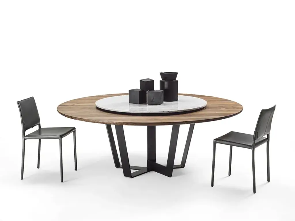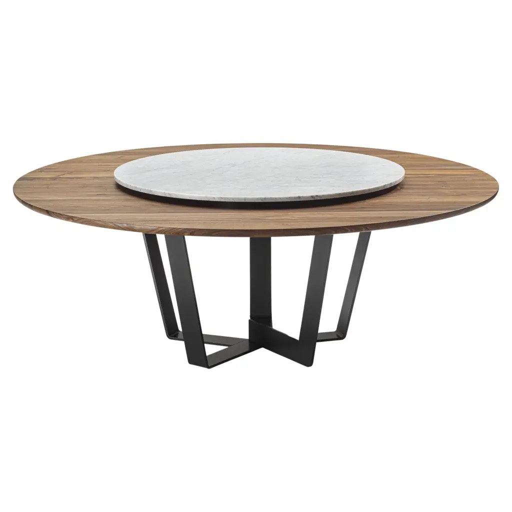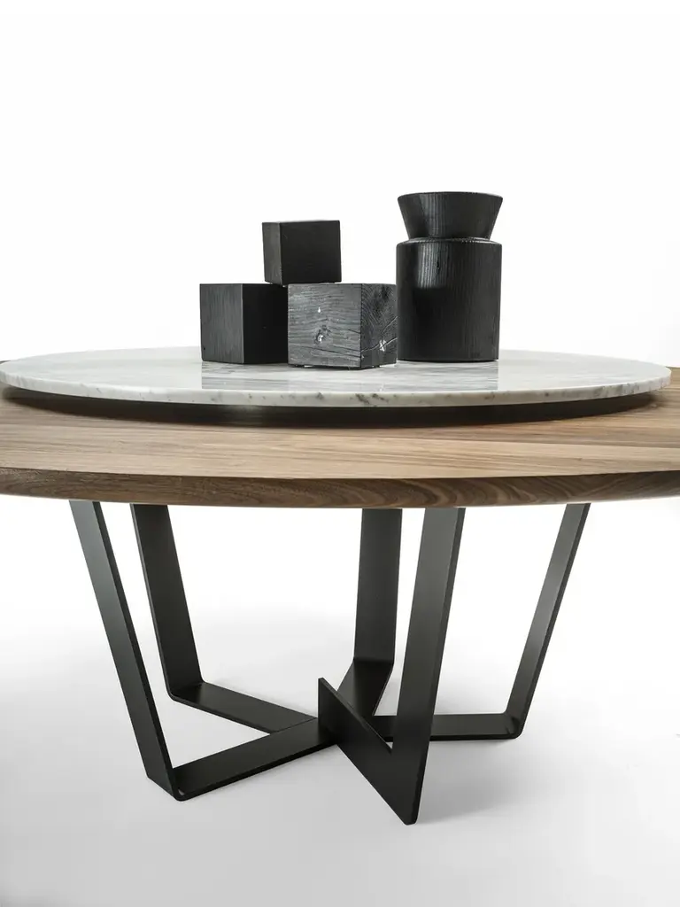 Kohi is a round table with top in solid wood, with the possibility to add a wooden or marble tray on top, equipped with rotating system Lazy Susan. Featuring an iron base.