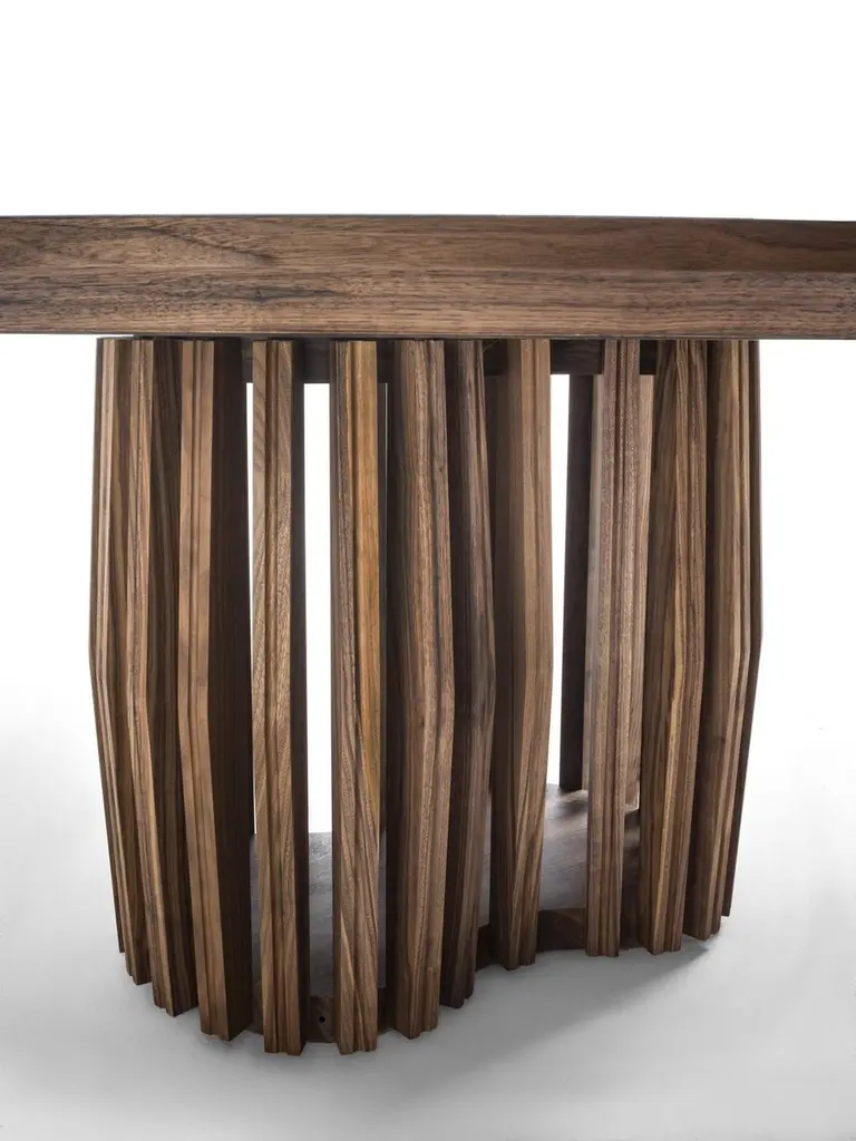Round table crafted by hand in solid solid wood without knots, equipped with rotating 55" diameter Lazy Susan in Sahara Noir marble. The sculptural base made of solid wood that represents the infinity symbol. This is an all natural product using only natural oils to treat the wood. No toxic materials are used in the process of producing this piece. The wood is ethically sourced from renewable wood farms. Material Options:- Wood: walnut or oak- Marble: Emperor dark marble, green Alpi marble, or Calacatta marbleThis table is also offered in 71" diameter and 95" diameter table top. Dimensions:Table: Ø 87" x 30"Lazy Suzan: Ø 55" The table is also offered in marble or wood top, without the Lazy Suzan mechanism, upon request. We will be glad to check with the factory’s technical team if sizes, finishes, and colors can be customized. Handmade in Italy.