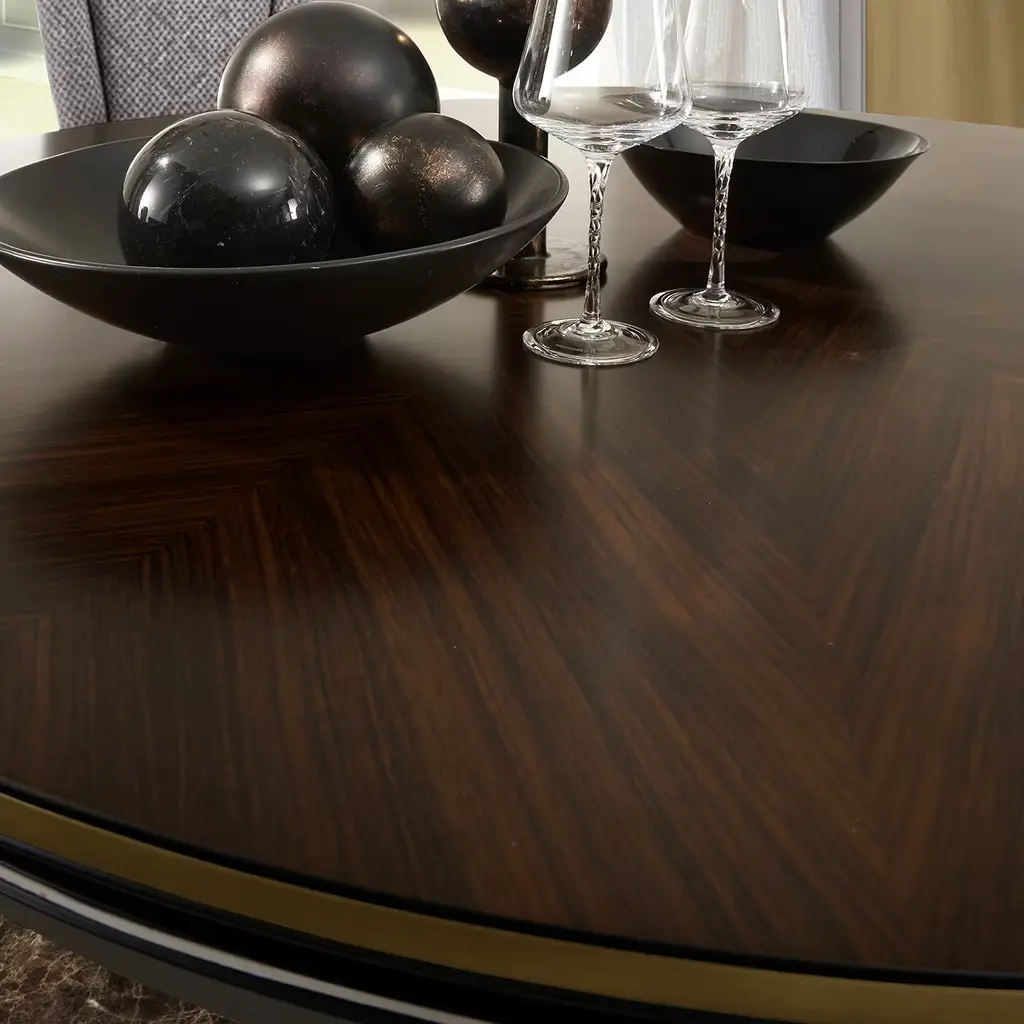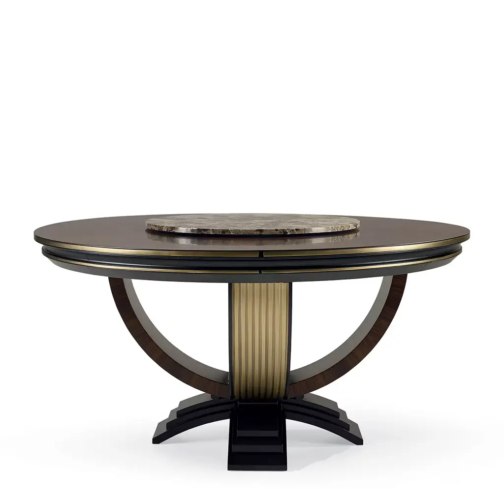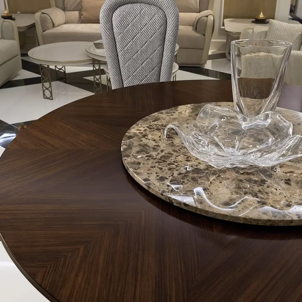The splendid unique silhouette of this round dining table will make a statement in any classic decor, infusing it with plush sophistication and charming allure. A combination of refined materials, it is handcrafted of plywood and India rosewood-veneered MDF enriched with a metal profile. The exquisite base boasts four curved legs supporting a round top enriched with a lazy susan of Emperador Dark marble. Available also in white eucalyptus and without lazy susan, contact the Concierge for details.