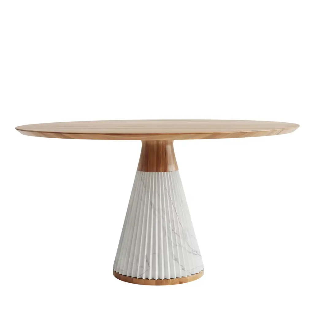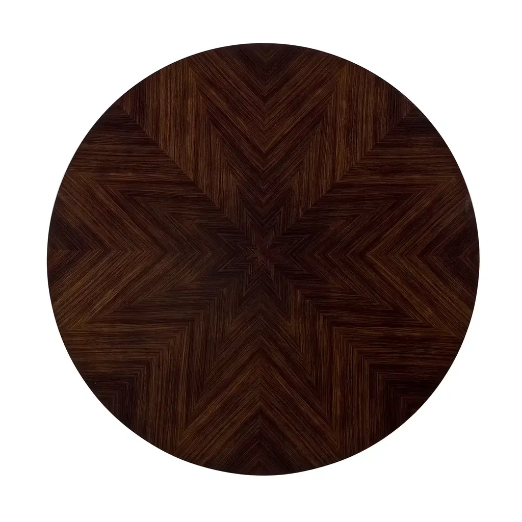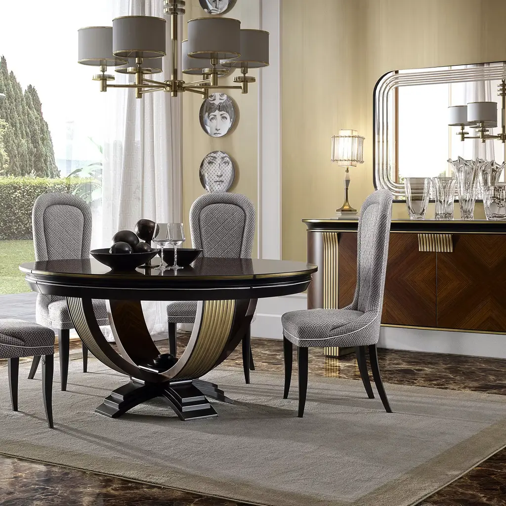 The splendid unique silhouette of this round dining table will make a statement in any classic decor, infusing it with plush sophistication and charming allure. A combination of refined materials, it is handcrafted of plywood and India rosewood-veneered MDF enriched with a metal profile. The exquisite base boasts four curved legs supporting a round top enriched with a lazy susan of Emperador Dark marble. Available also in white eucalyptus and without lazy susan, contact the Concierge for details.