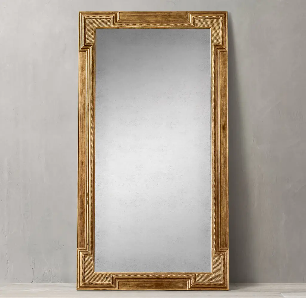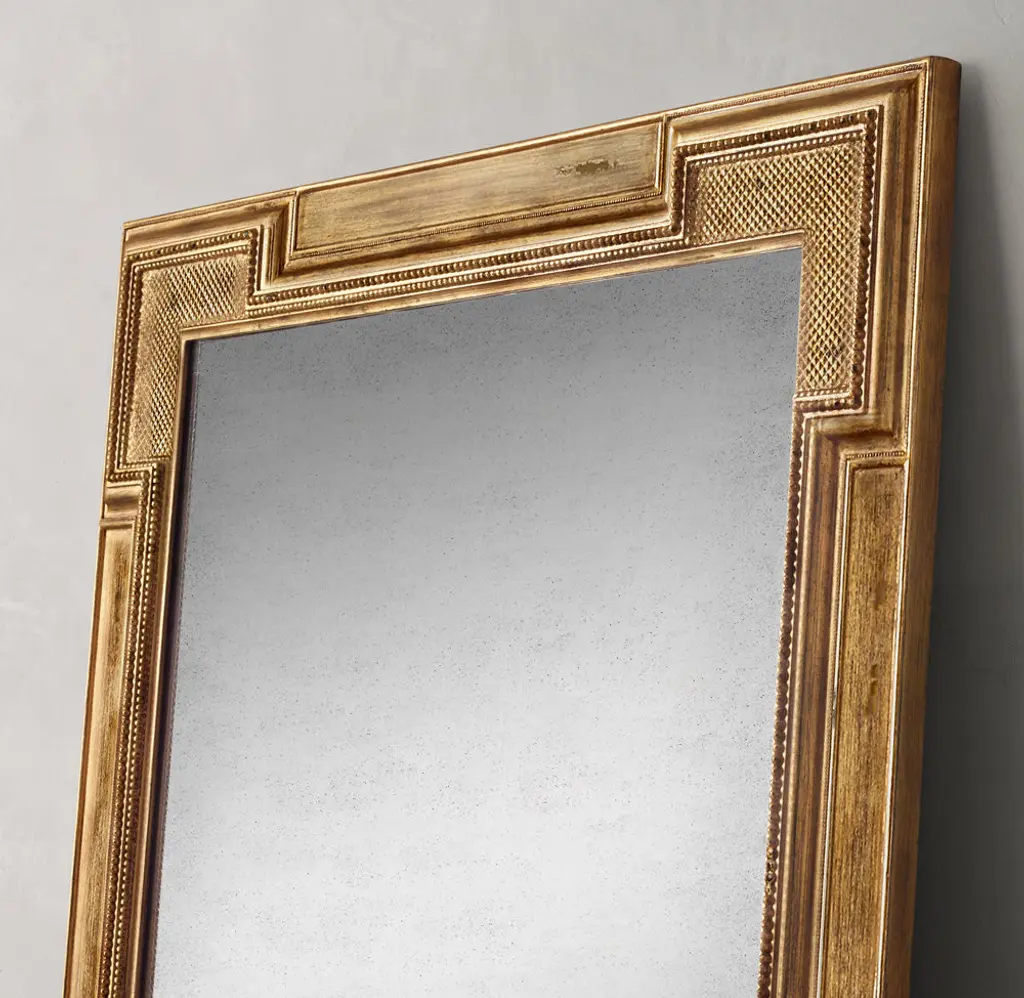 Richly rendered with bolection molding, stepped corners and raised beadwork, our mirror's aged metal finish and silvered glass recall the Baroque grandeur of 17th-century Flemish architecture.