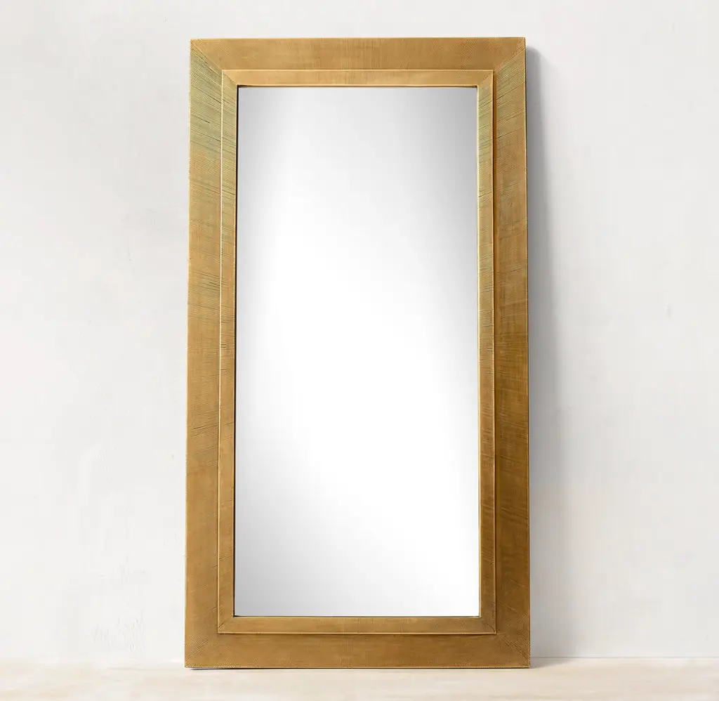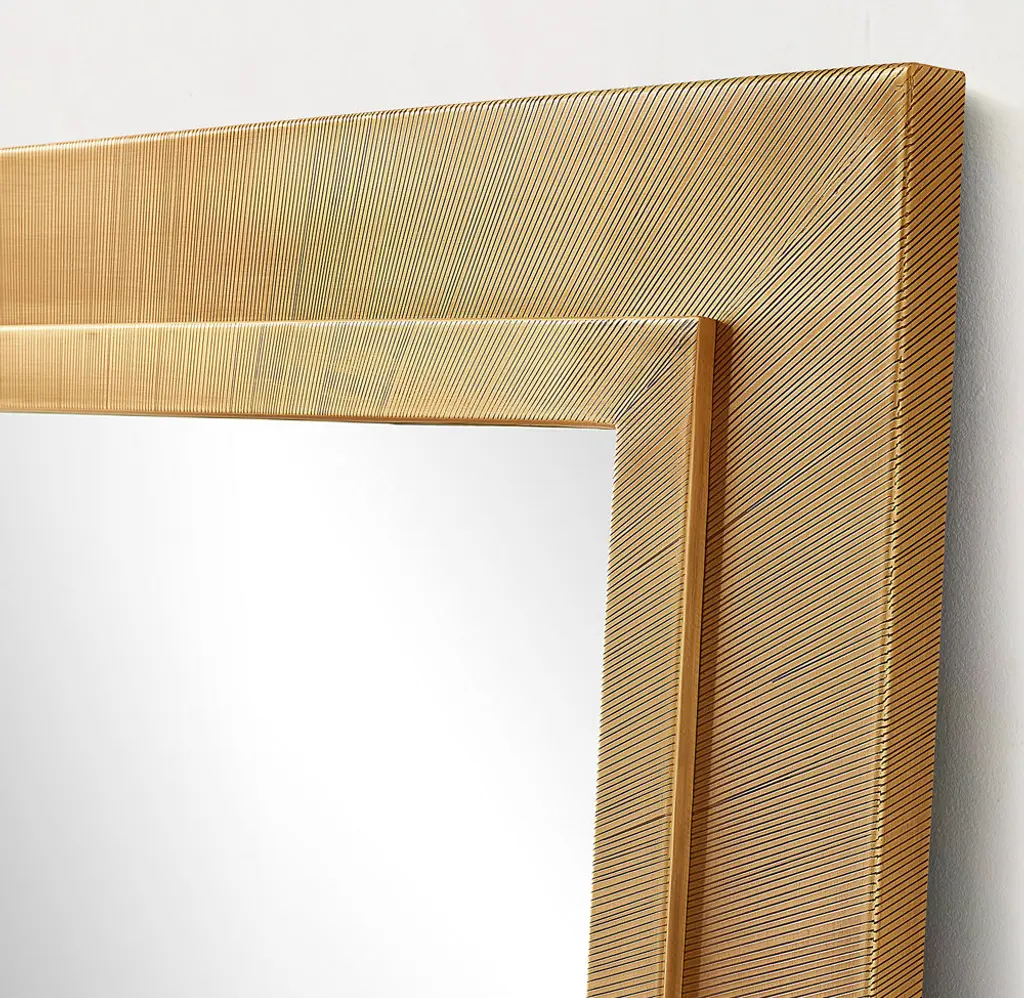 At once simple and sculptural, our mirror's spare silhouette is a nod to 1970s Italian postmodernism. The stepped brass frame forms a geometry of complementary rectangles while diagonal etchings impart unique texture and tonal modulation.