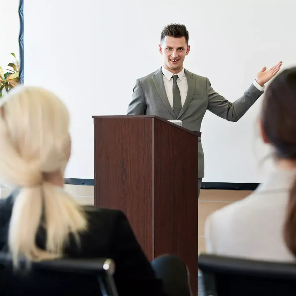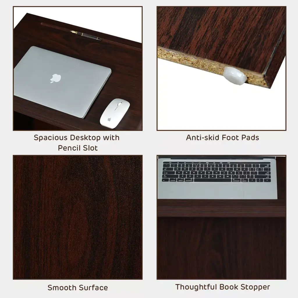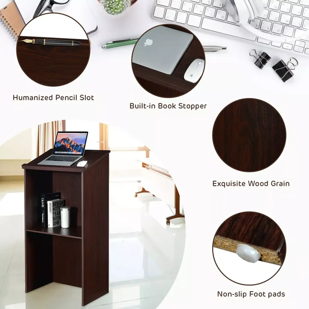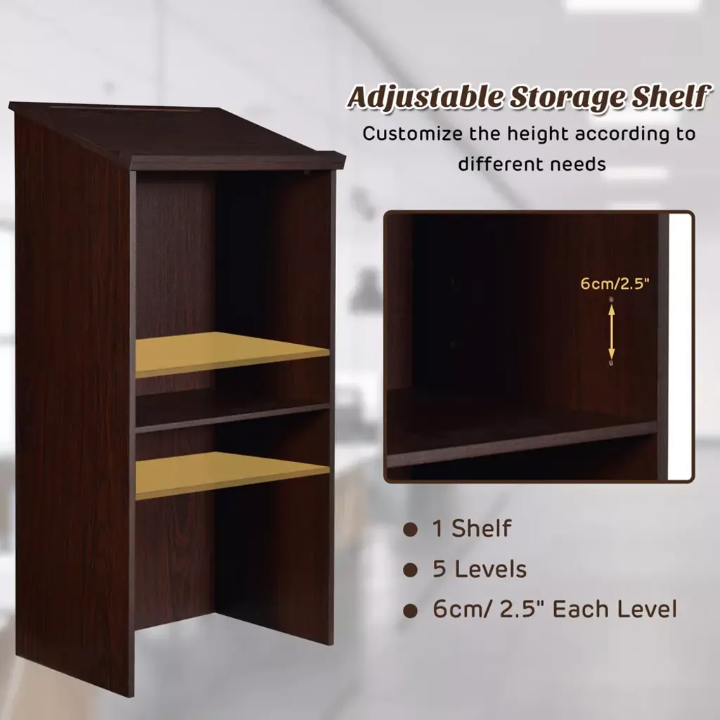 Upgrade your speaking engagements and presentations with this 46" podium stand! Featuring a slanted desktop, this lecture desk allows speakers to comfortably access their notes or documents while delivering their message with ease. The ergonomic design ensures a natural and relaxed posture to reduce strain. With a spacious storage shelf, this podium stand provides ample space for storing books and presentation aids. More, the upgraded design of the speaking lectern is equipped with cable holes, which allows for easy and discreet cable management. This podium stand is a versatile and functional addition to any speaking environment, including classroom, conference room, restaurant, church, and seminar. FeaturesSlanted desktop for ease of use and comfort. Proper tilting angle to give you a better view position Barrier stopper to prevent items from slipping down Open storage shelf frees up more tabletop surface Humanized cable management holes keep the messy wires hidden Comes with extra support bar for higher stability Suitable for classroom, office, conference, restaurant, and seminar Smooth surface for easy cleaning and maintenance Easy to assemble under the detailed instructionColor: Black\Brown Material: Engineered Wood Overall Dimensions: 23" x 16" x 46"(L x W x H) Weight Capacity: 66 lbs Net Weight: 40 lbs Package included: 1 x Floor Standing Podium 1 x Instruction