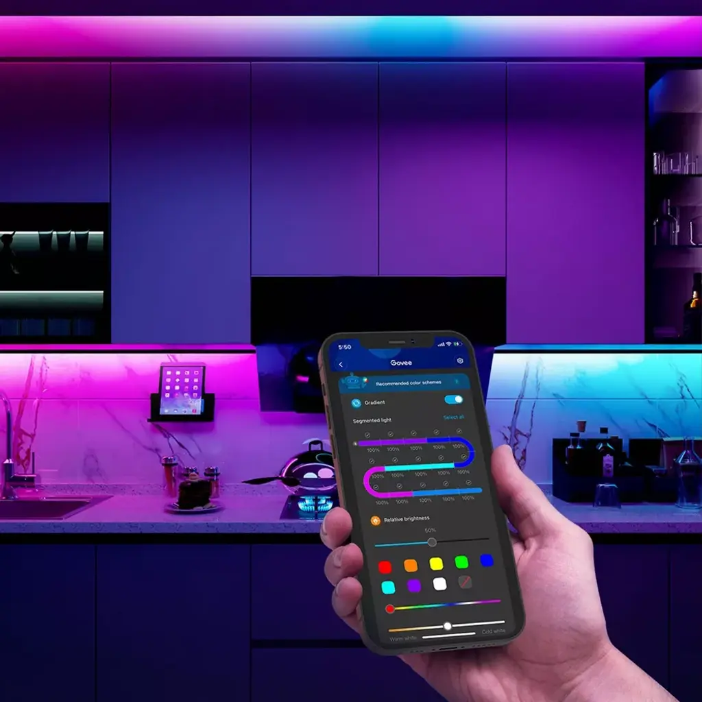 Add extra brightness to any room in your home with Govee LED Strip Lights. These LED strip lights use Wi-Fi and Bluetooth capabilities to easily control the colors and effects to personalize your lighting experience. The LED Strip Lights also feature an expansive music sync mode to enhance your space.