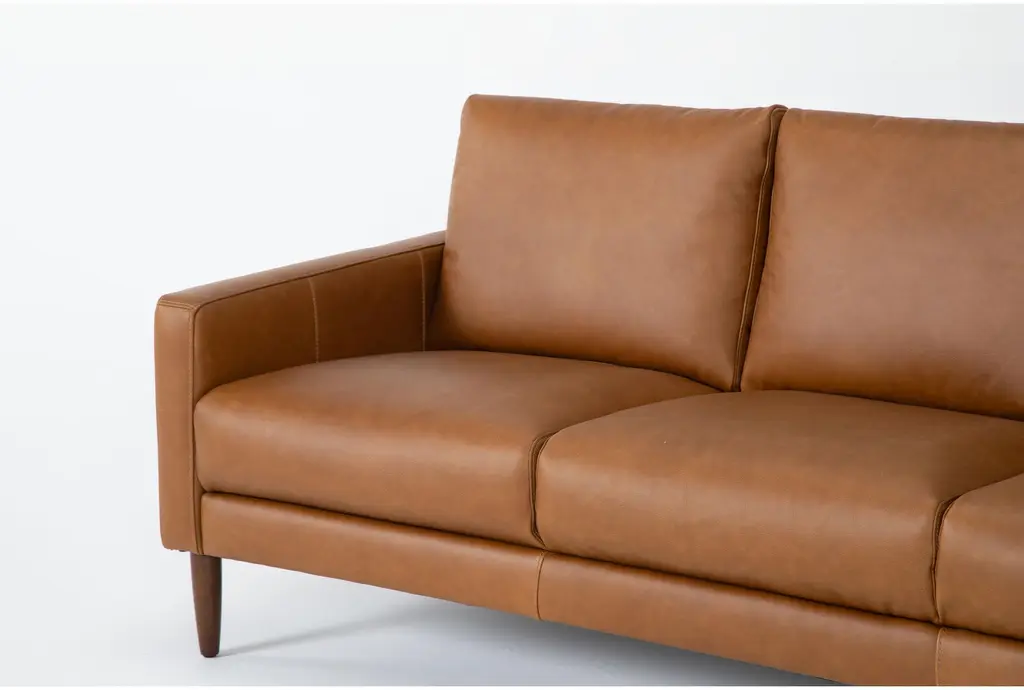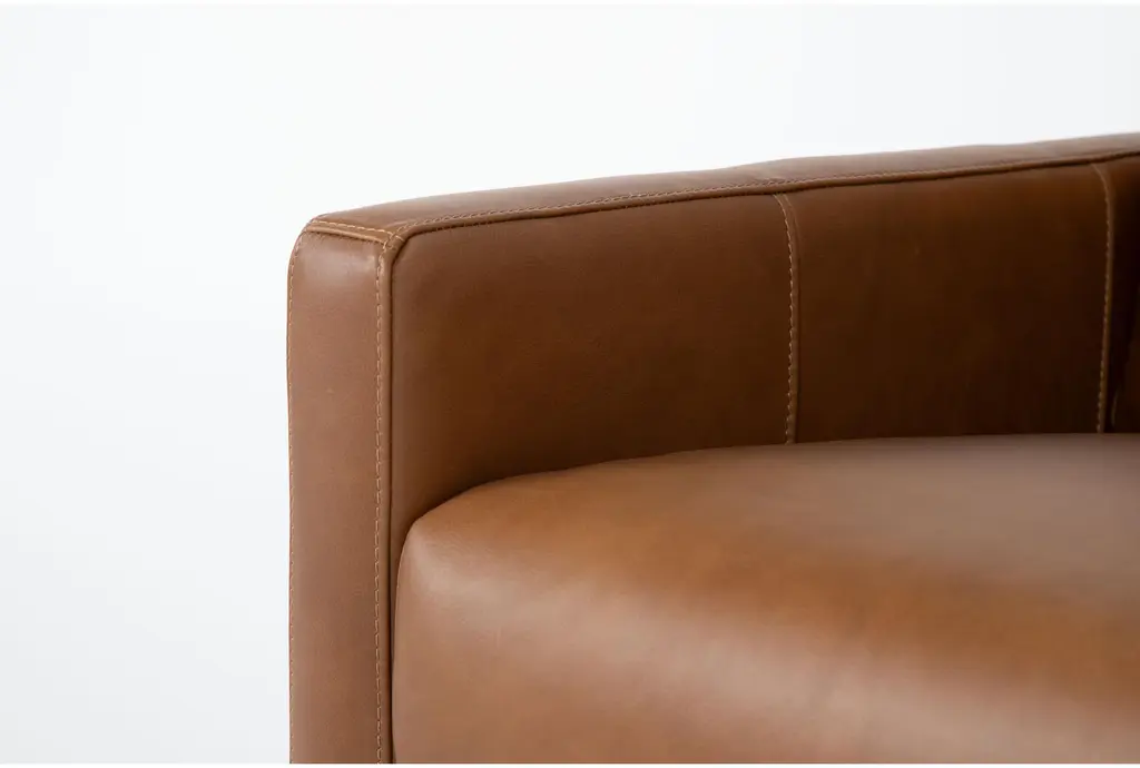 Anyone drawn to modern leather seating will surely find our Ian collection exceptionally appealing. Leather graces everywhere your body touches, allowing you to enjoy the look and feel of this naturally beautiful, supple material. Clean and streamlined, it’s scaled down for smaller spaces and is truly on trend with its saddle brown color and mid-century details. Thin track arms and cone shaped legs frame plush cushions, which feature a seamless waterfall edge, where the leather wraps completely from back to front.