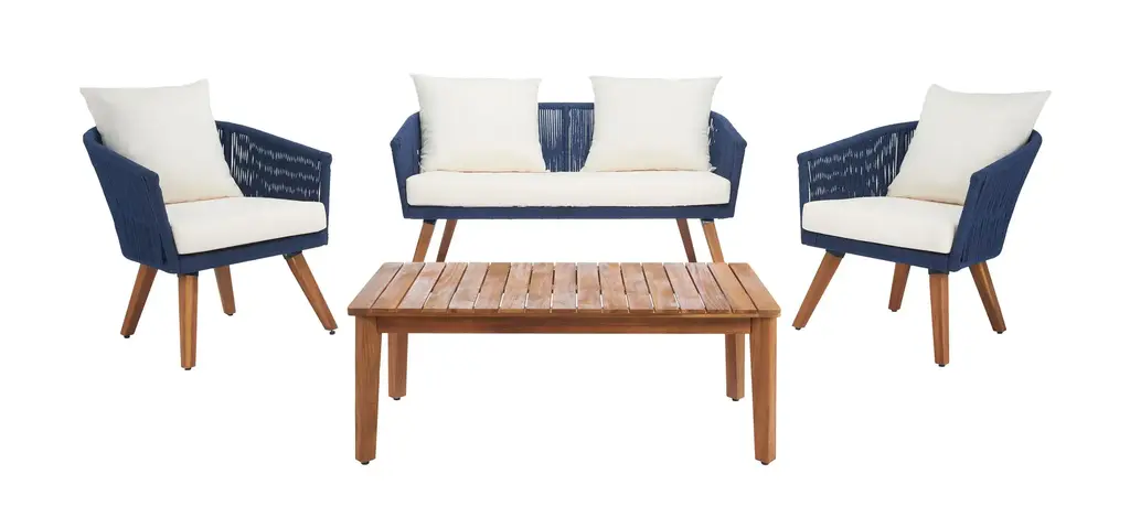 Create the ultimate stay-cation with this Isolde 4-Piece Living Set. Designed to bring luxe boho style to any outdoor space, the modern curves and lines on its lush settee, armchairs, and table are crafted with natural-finished acacia wood and soft rope. Matching beige cushions provide flawless comfort.