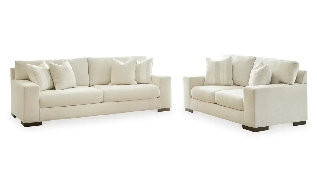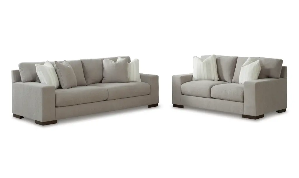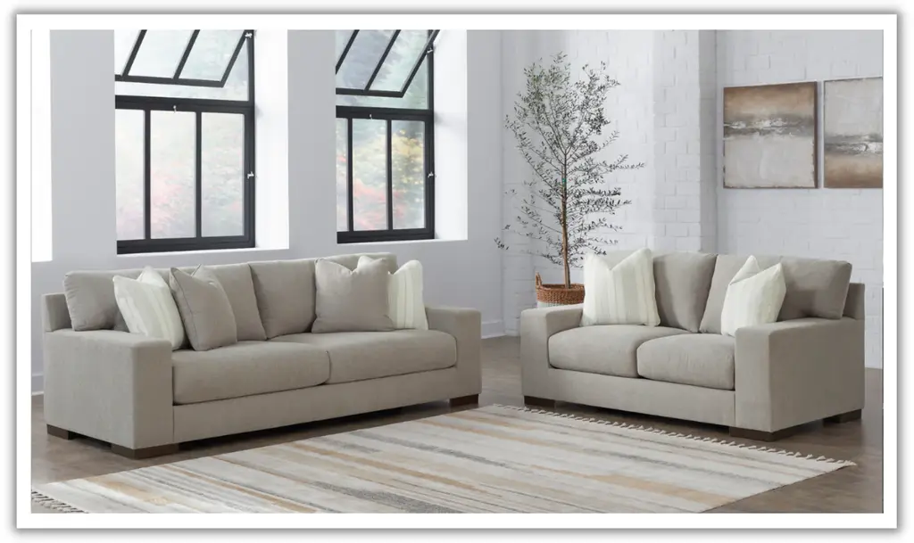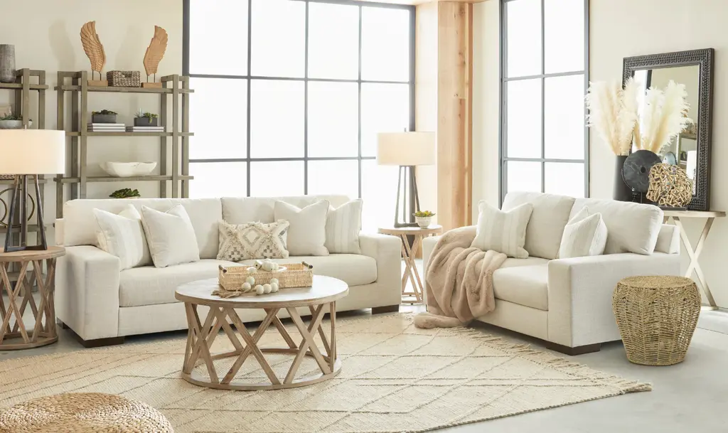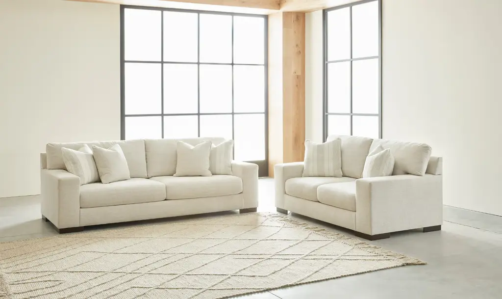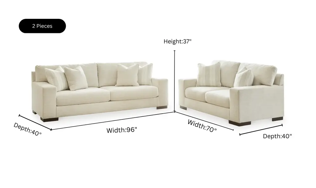 Introducing the Maggie Fabric Living Room Set with Reversible Cushions – where classic comfort meets modern sophistication. With its sleek, minimalistic design and structured silhouette, this Living Room Set effortlessly adds a touch of elegance to your living room. Crafted with a corner-blocked frame, it ensures durability and stability, promising years of reliable use. What sets the Maggie Living Room Set apart are its reversible cushions, designed for ultimate convenience and longevity. The high-resiliency foam cushions, wrapped in thick poly fiber, provide exceptional comfort, allowing you to sink in and relax after a long day. Whether you're unwinding solo or entertaining guests, this Living Room Set offers the perfect spot to lounge and enjoy life's moments. Included with the Living Room Set are accent pillows, featuring a feather-fiber fill that adds a luxurious touch. The light neutral polyester upholstery not only enhances the overall aesthetic but also makes it versatile enough to blend seamlessly into any casual or contemporary space. With endless style possibilities, the Maggie Living Room Set is more than just a piece of furniture; it's a statement of timeless design and exceptional quality. Upgrade your living space with this exquisite Living Room Set and indulge in the perfect blend of comfort and style. Experience the joy of relaxation and make a lasting impression on your guests with this remarkable addition to your home.