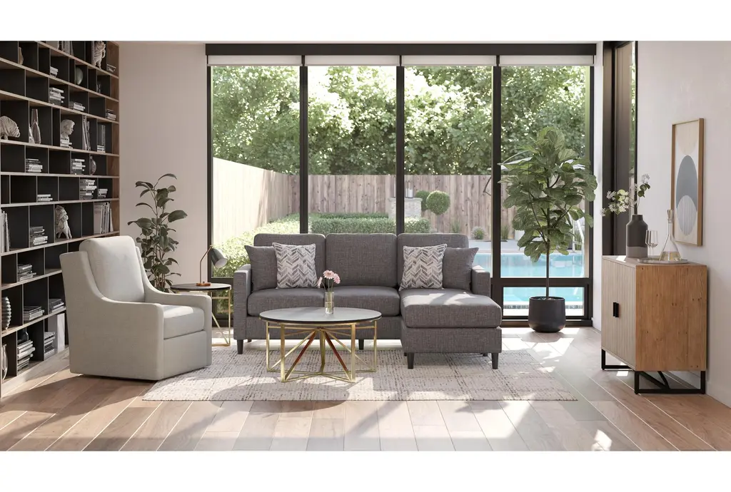 The Stark Dark Grey Fabric Sofa with Reversible Chaise & Light Grey Fabric Swivel Armchair is the perfect addition to any living room. This contemporary set includes a firm sofa and a small swivel armchair, designed with comfort and versatility in mind. The reversible chaise and track arms make this set ideal for any living space.