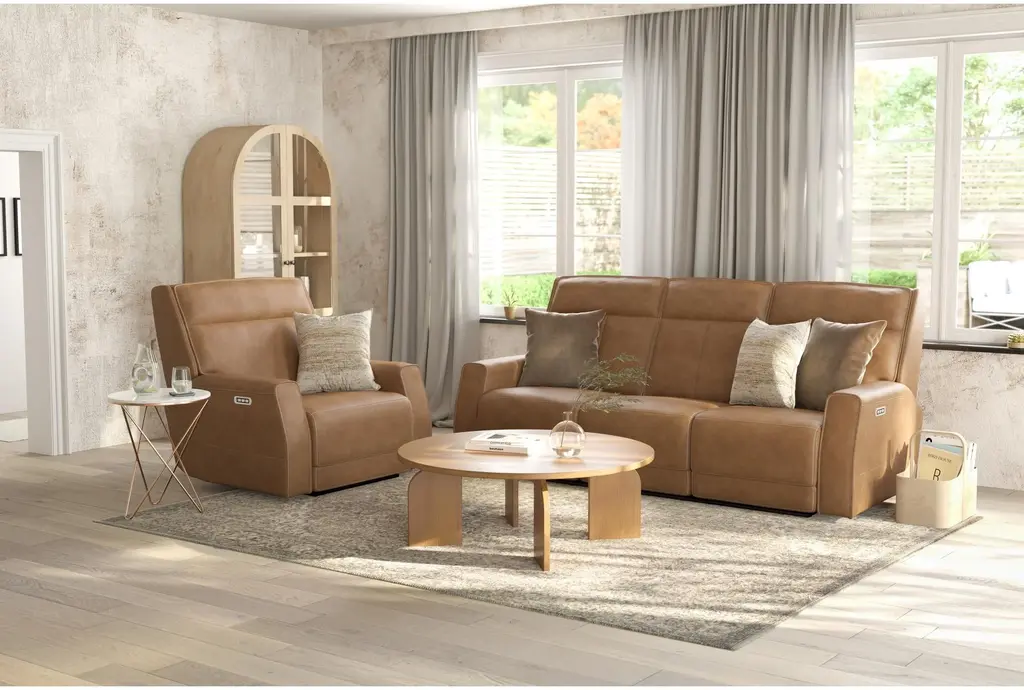 Experience ultimate comfort and relaxation with the Thornton Top Grain Leather 2 Piece Zero Gravity Reclining Sofa & Recliner Set. This casual style set, finished in a warm saddle color, is designed to enhance your living room. Enjoy the luxury of top grain leather combined with the durability of polyurethane for a perfect blend of style and convenience.