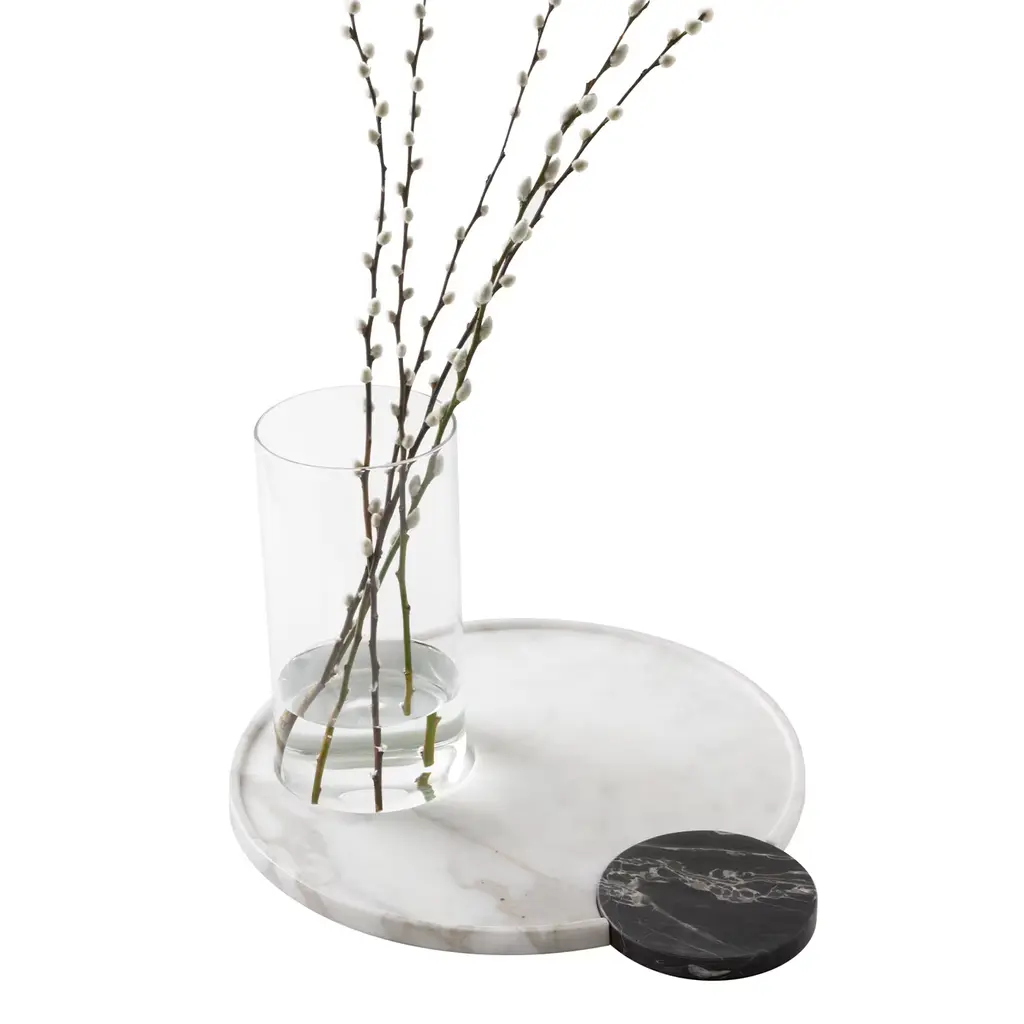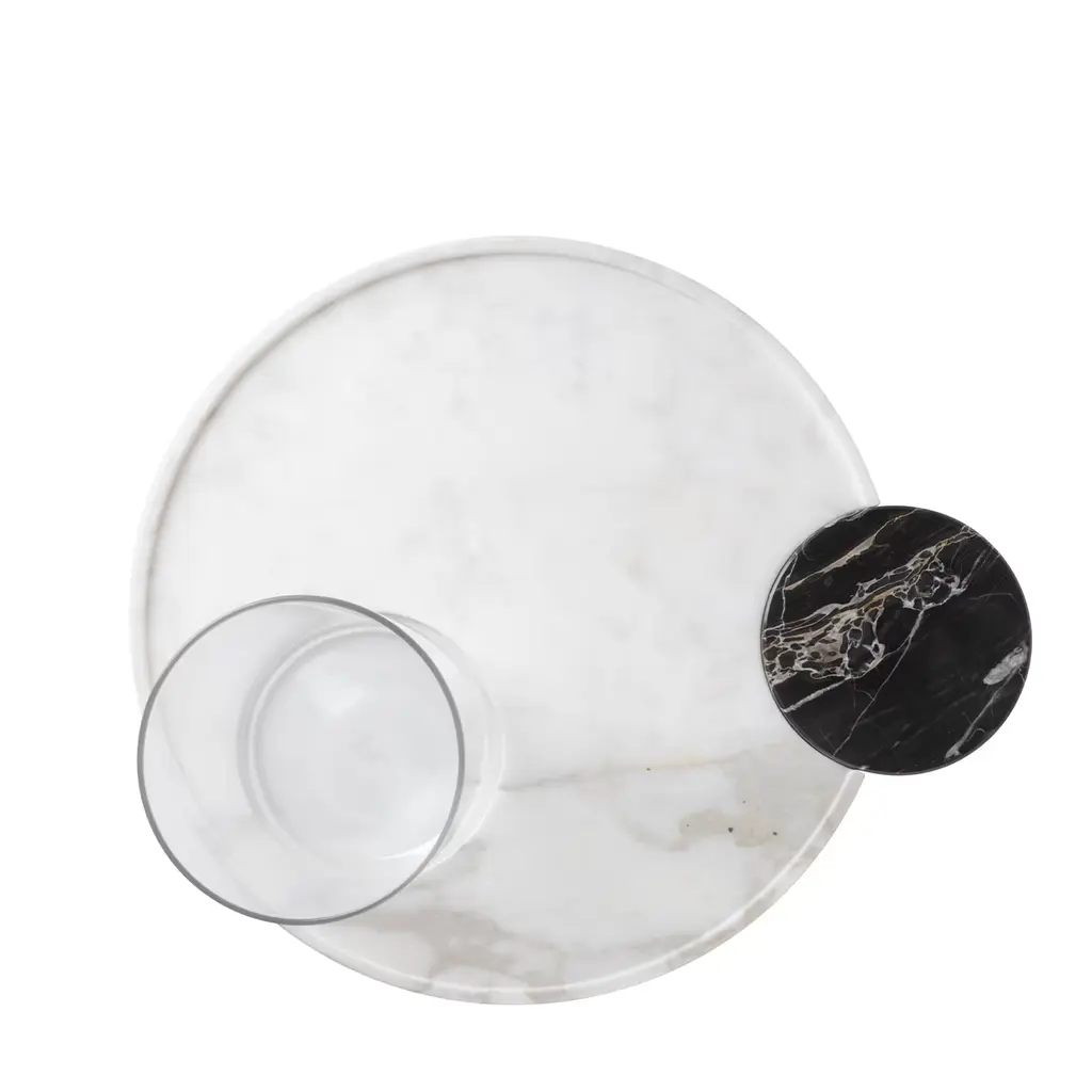 Cerchi-amo is made of two pieces that can be complementary or used separately. The set is composed of a white Lasa marble large circle and a black Portoro marble small circle. Cerchi-amo marble trays by SlowDesign44 are handcrafted with passion and care by master artisans. The set is completed with Easy 06 clear glass and Easy 01 vase; are a borosilicate glass, a very resistant material without impurities. Please ask Concierge for customization details.