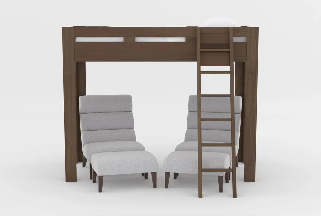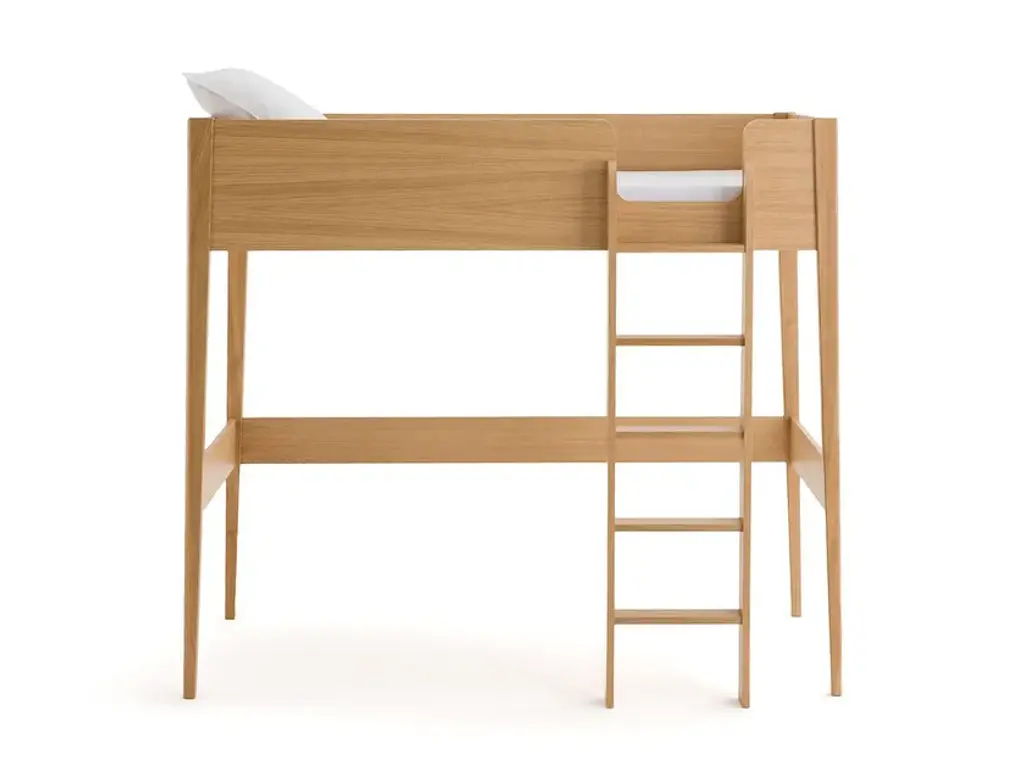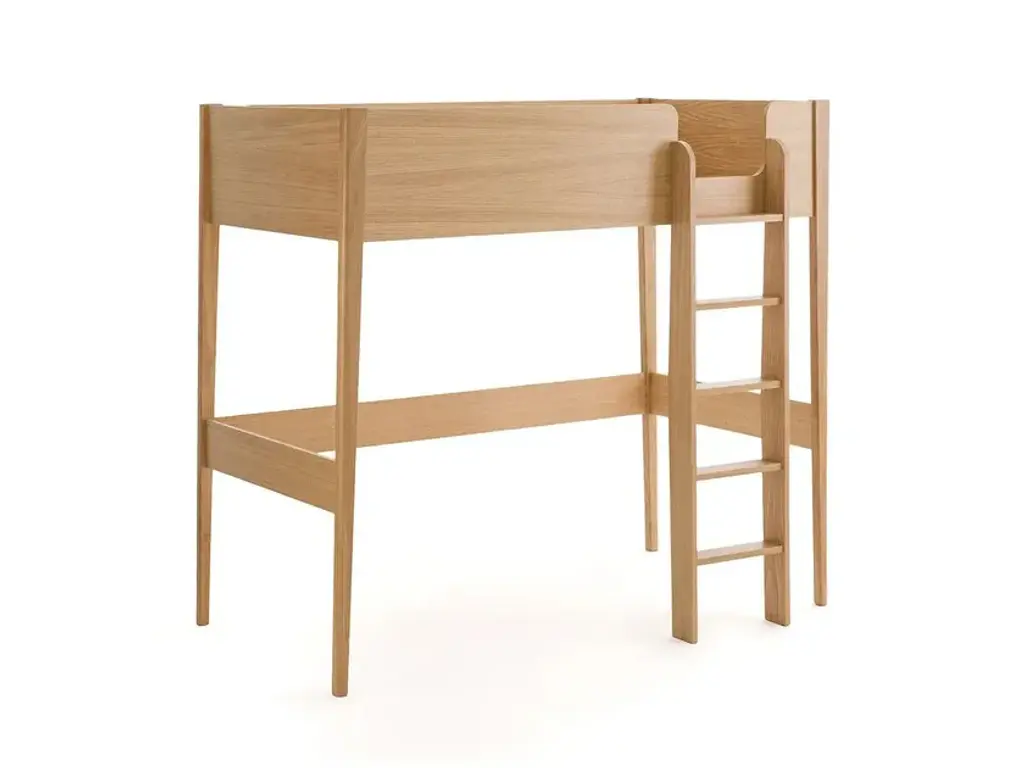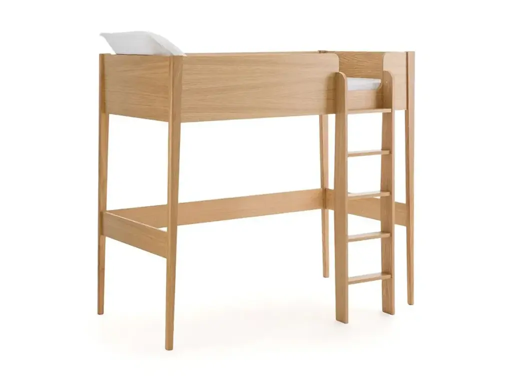 The Alceste loft bed is characterised by a sober and elegant line. It can accommodate up to 3 beds by combining the drawer-bed.Made of oak veneered chipboard with nitrocellulose finishSolid oak legsStairs and steps of birch panel, oak veneer, nitrocellulose finishRecommended mattress height: 20 cm maximum