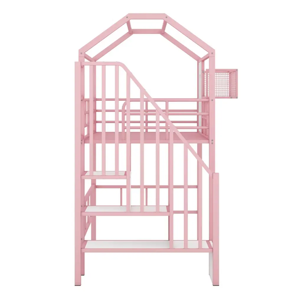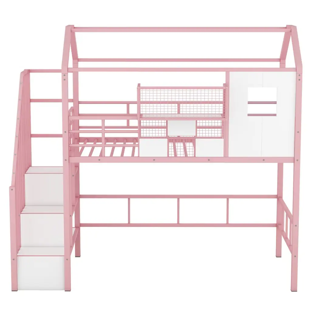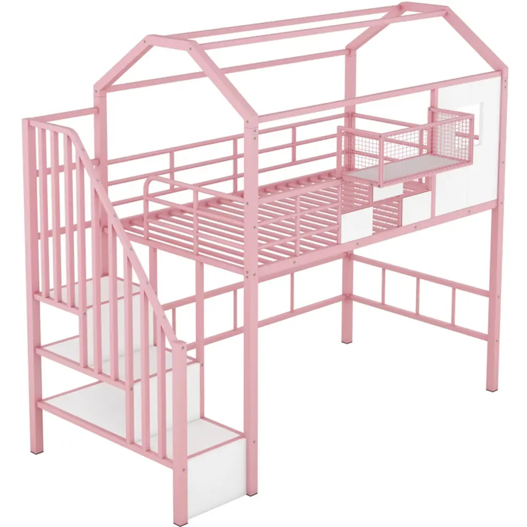 Aprilsoul 93.70"metal Loft Bed With Roof Design And A Storage Box, Twin,pink