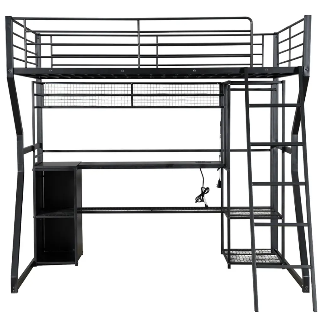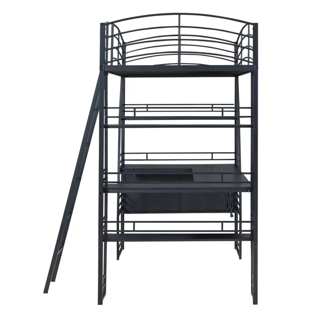 Bellemave Twin Size Loft Bed With Desk And Bookcase With Metal Frame, Loft Bed With Desk And Storage, Black